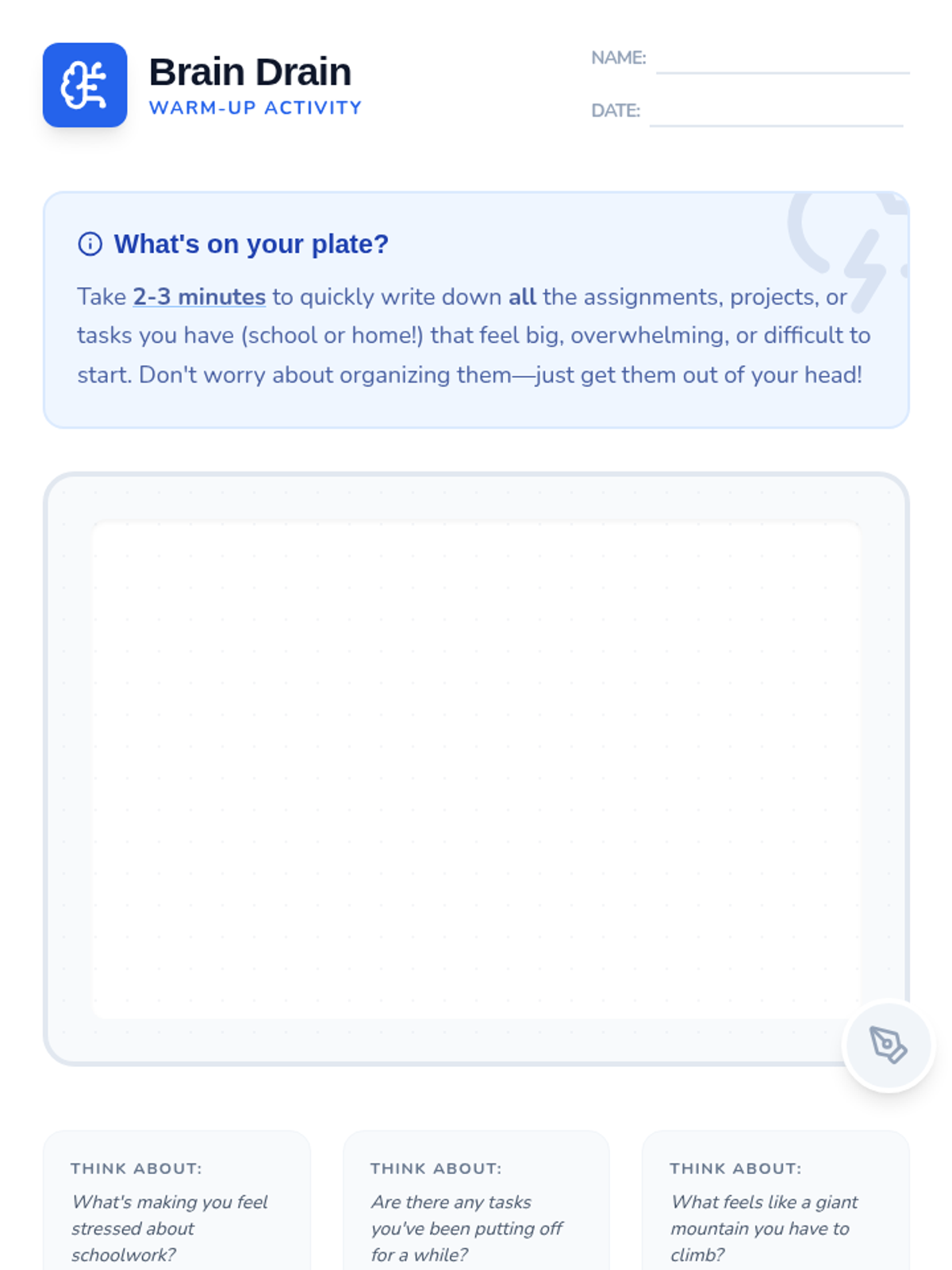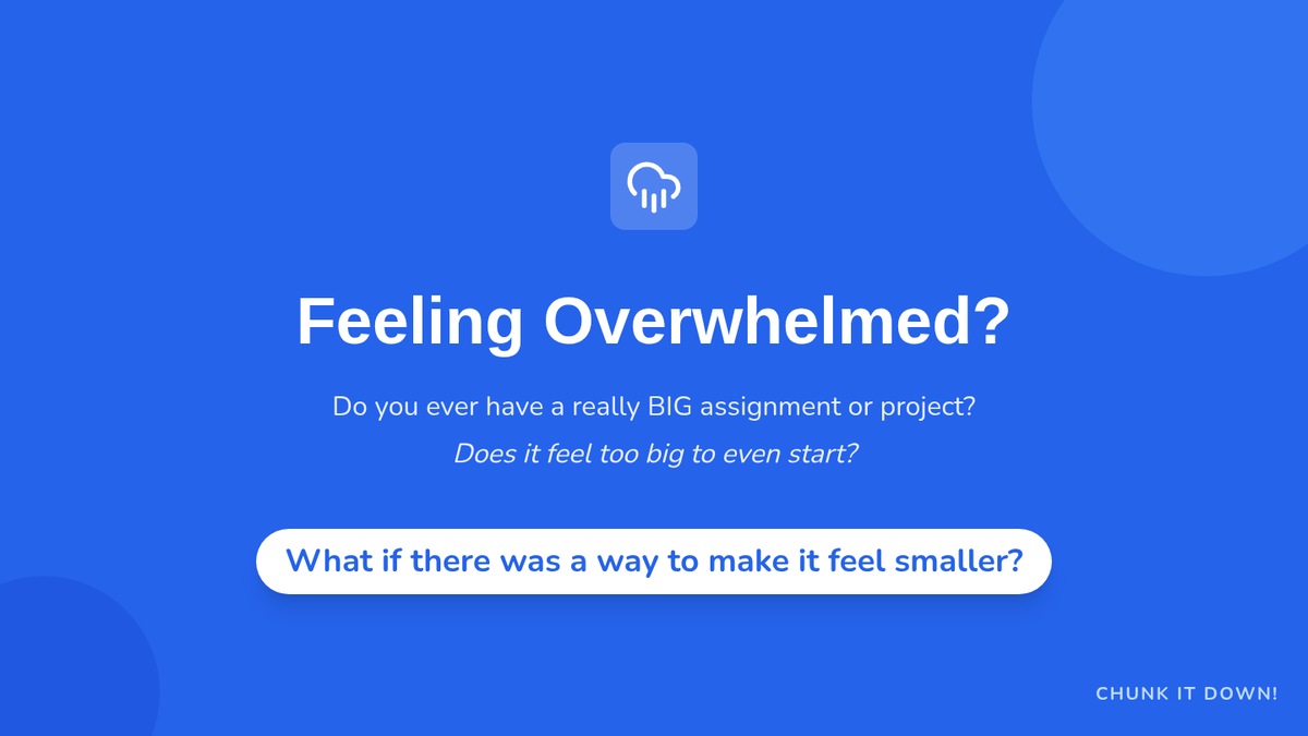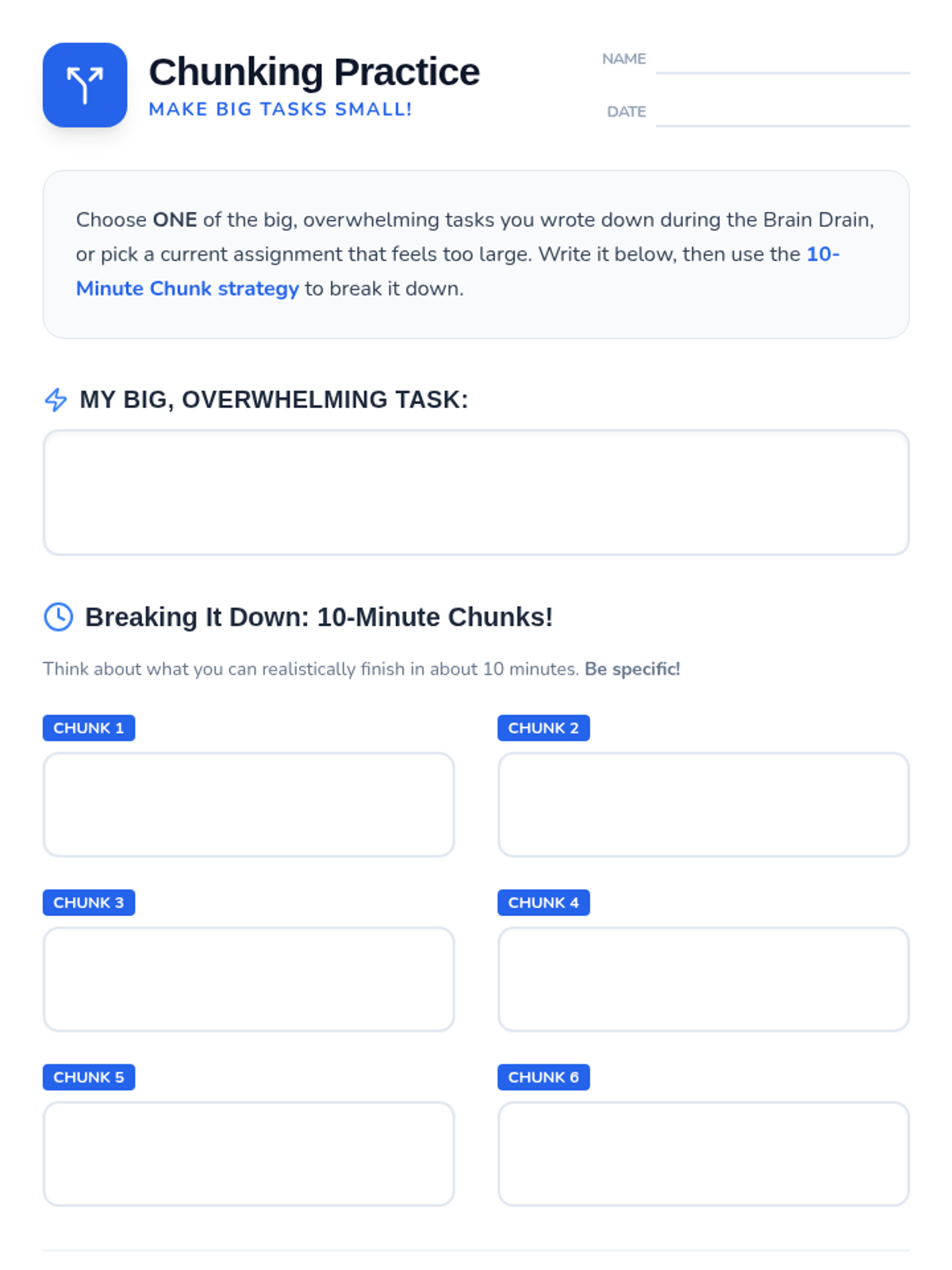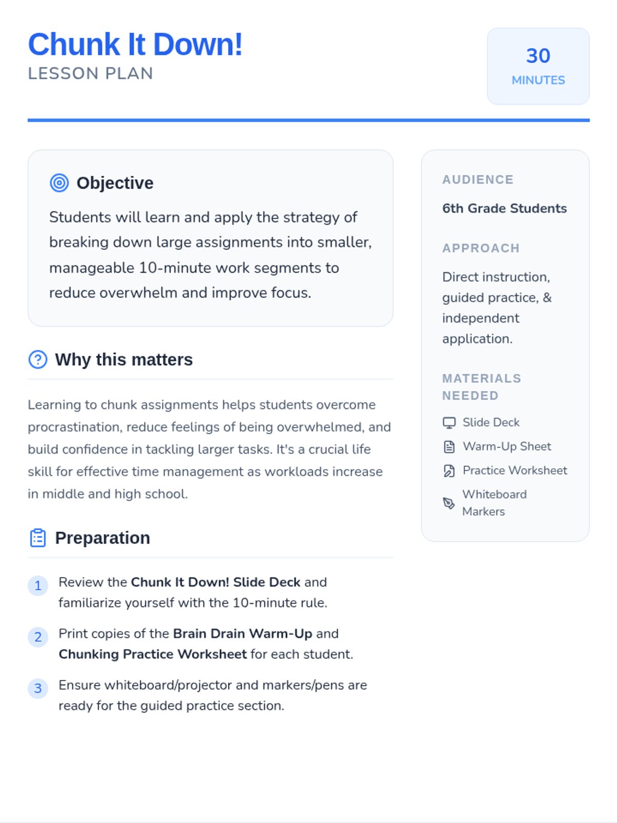 A 30-minute lesson for 6th graders on the 'Chunk It Down!' strategy, teaching them to break large assignments into manageable 10-minute segments to reduce overwhelm and improve focus.