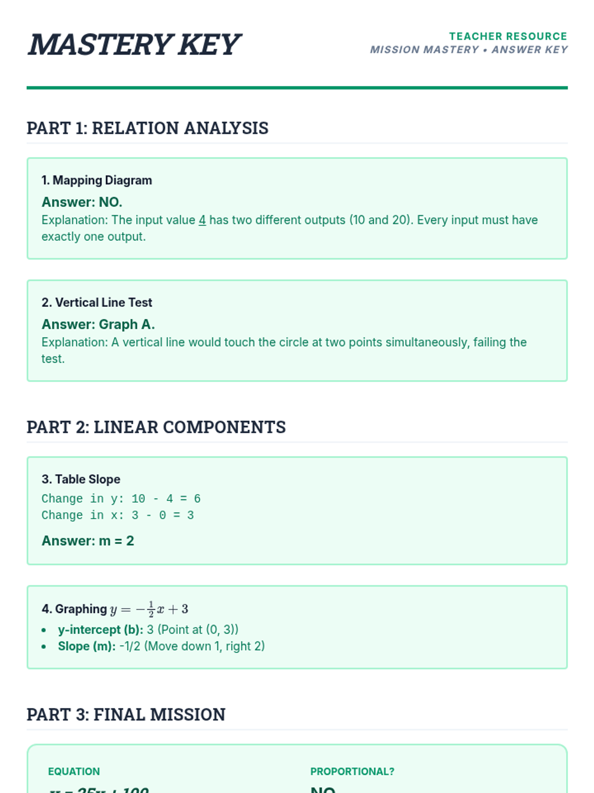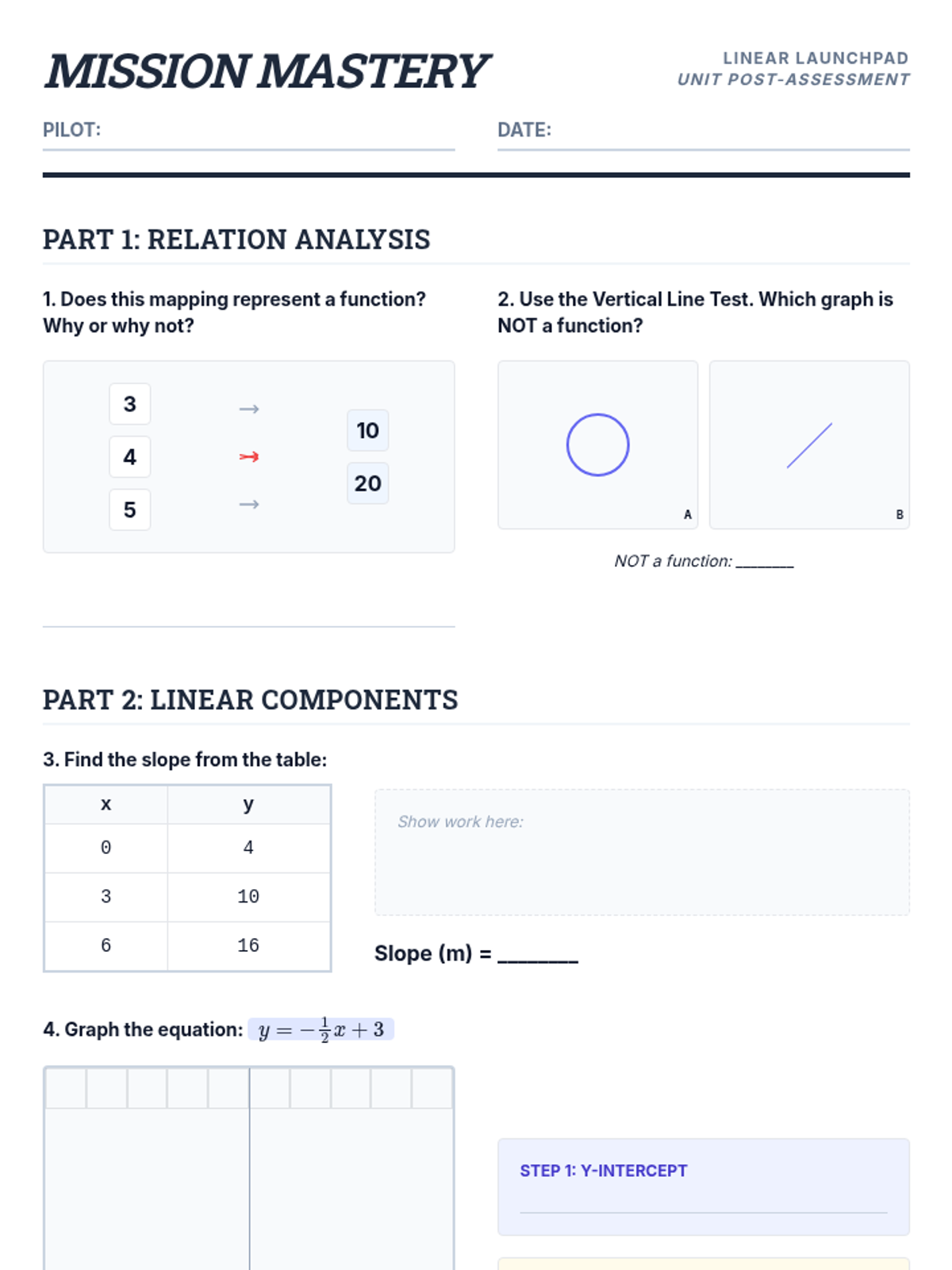 Evaluate student growth and mastery of function concepts and linear relationship interpretation through a comprehensive post-assessment.