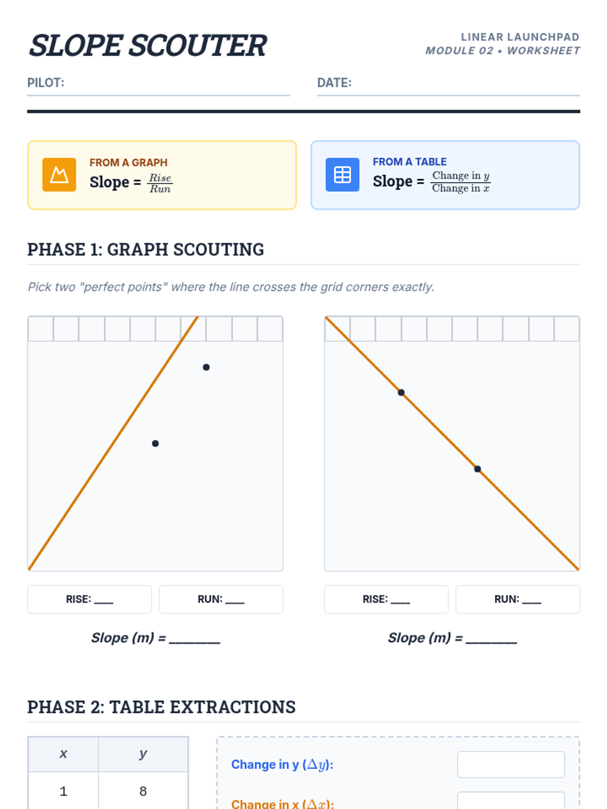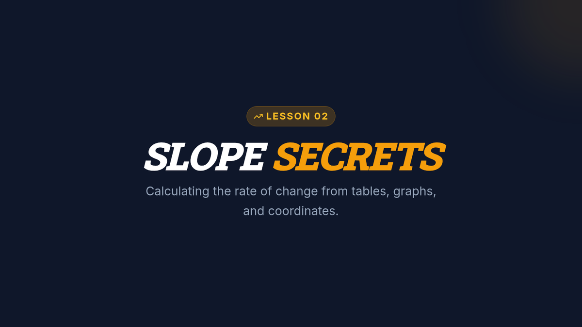 Master the calculation of slope (rate of change) from tables, graphs, and two points, emphasizing the ratio of vertical change to horizontal change.