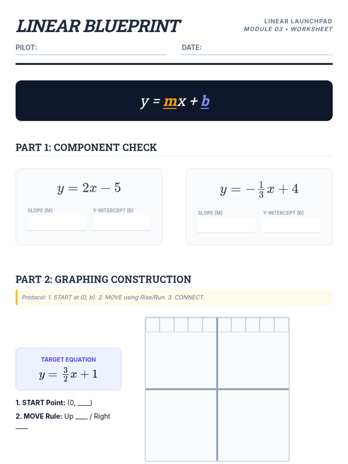 Connect the components of y = mx + b to their visual representations on a graph and practice graphing linear functions from equations.