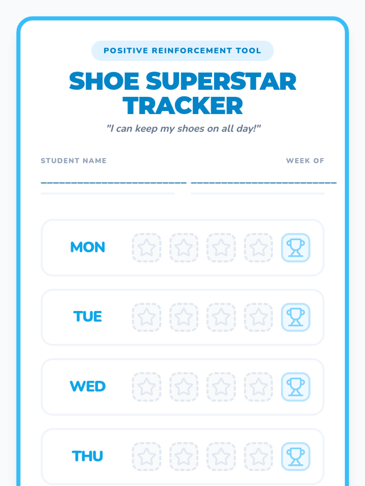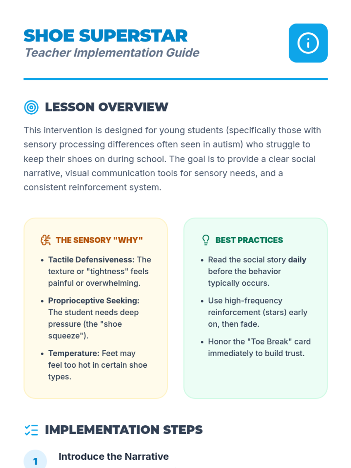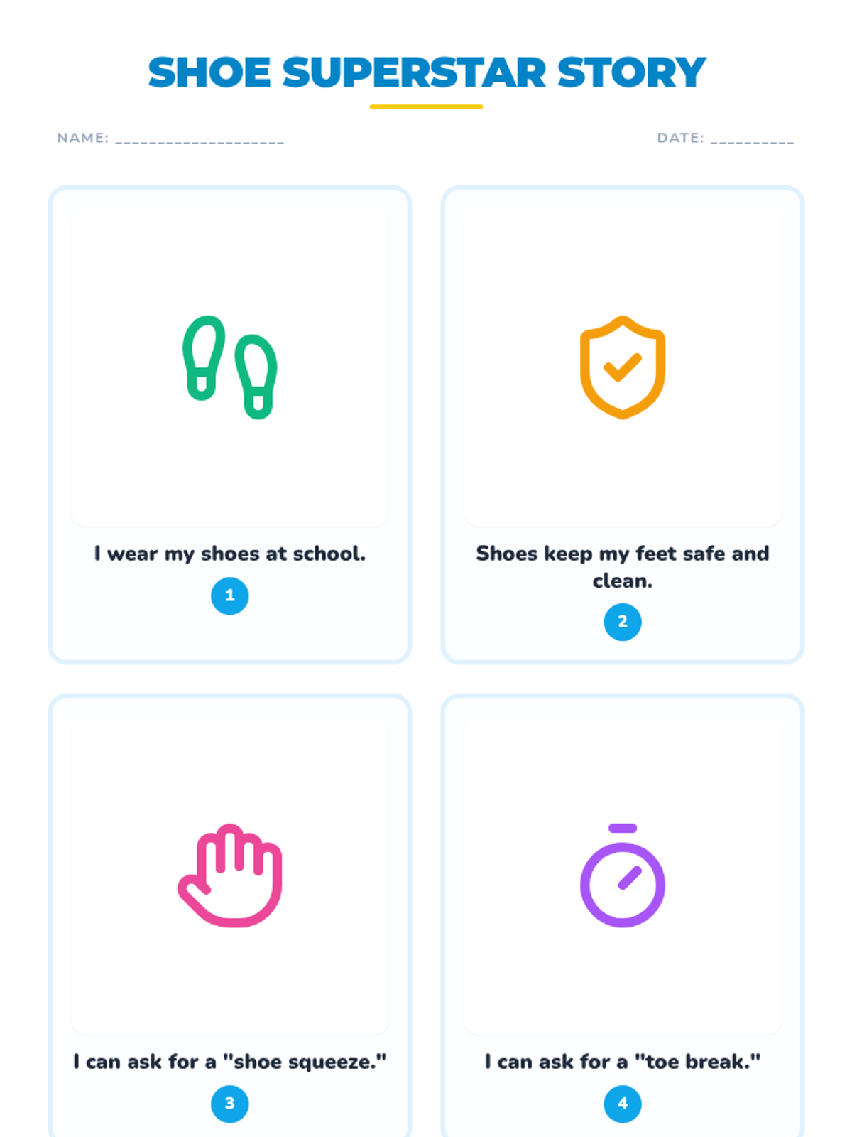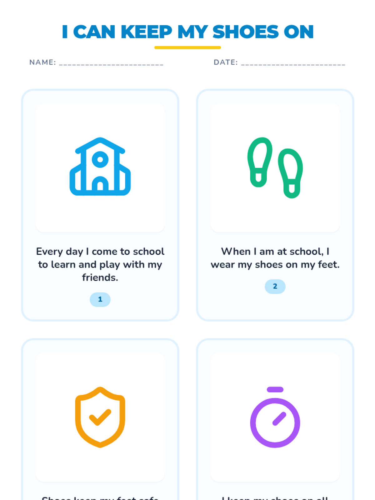 A focused intervention designed to help a young student with autism understand the importance of keeping their shoes on during the school day through visual storytelling and positive reinforcement.