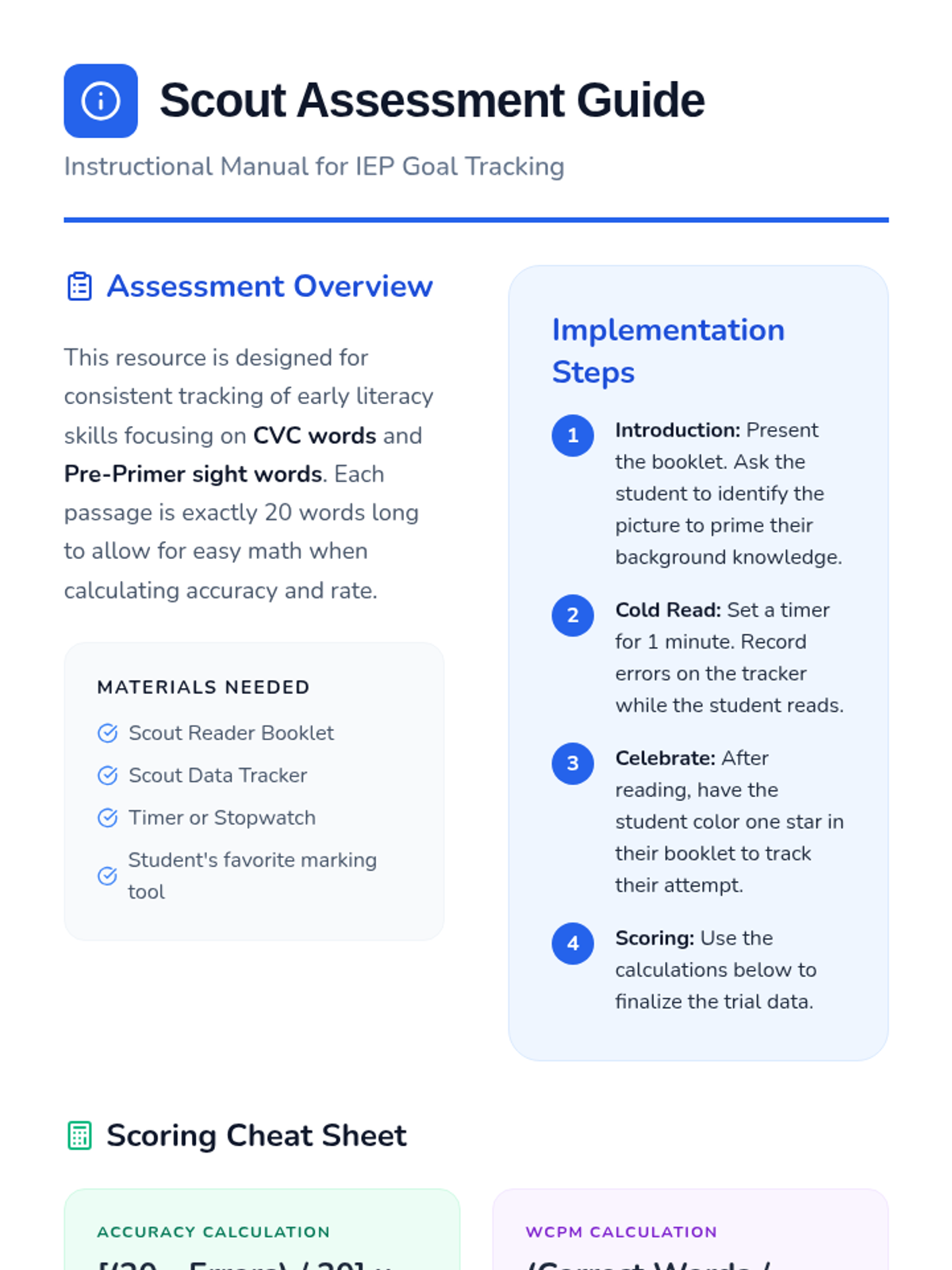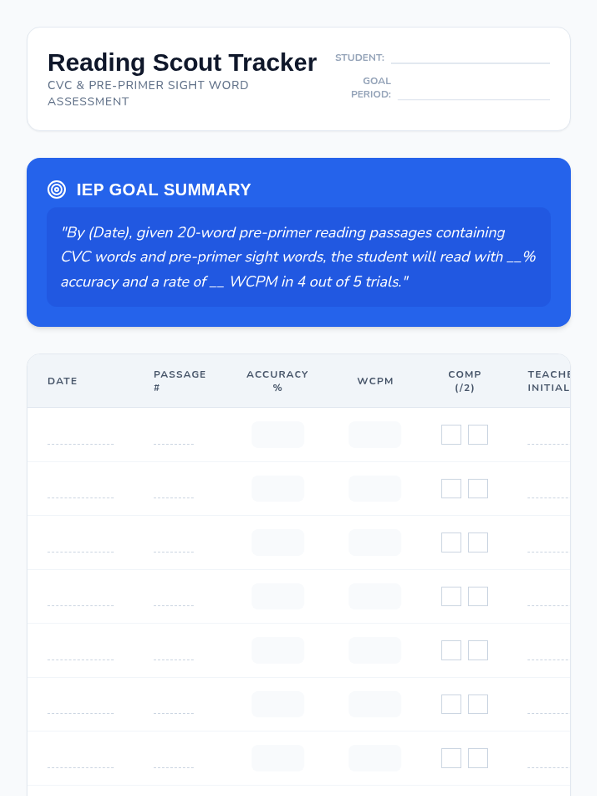 A set of four CVC and pre-primer sight word reading passages designed for IEP goal tracking, featuring a student-facing booklet and a corresponding teacher data tracker.