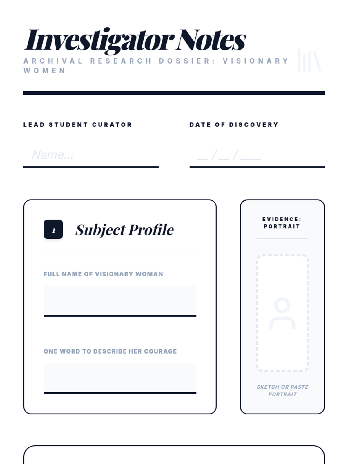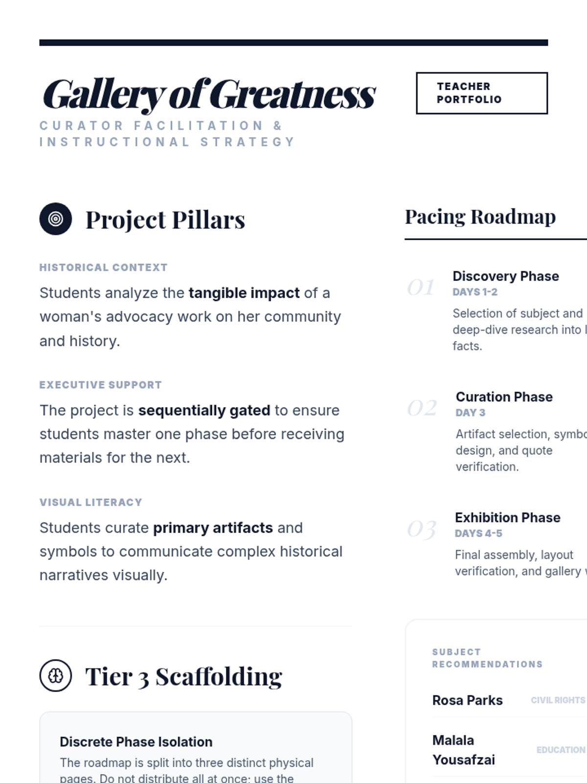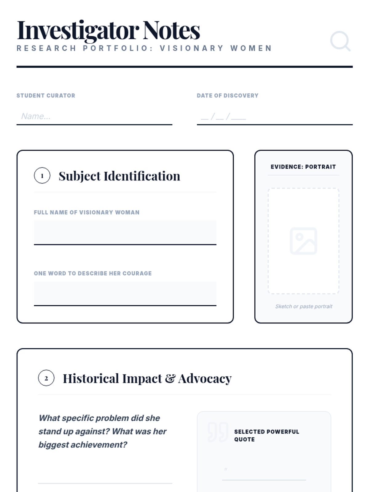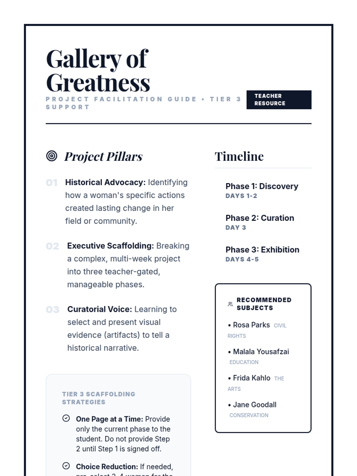 A structured, multi-step project where students act as museum curators to create an exhibit honoring an influential woman's impact and advocacy. Designed with Tier 3 Special Education supports, it focuses on executive functioning and historical understanding.