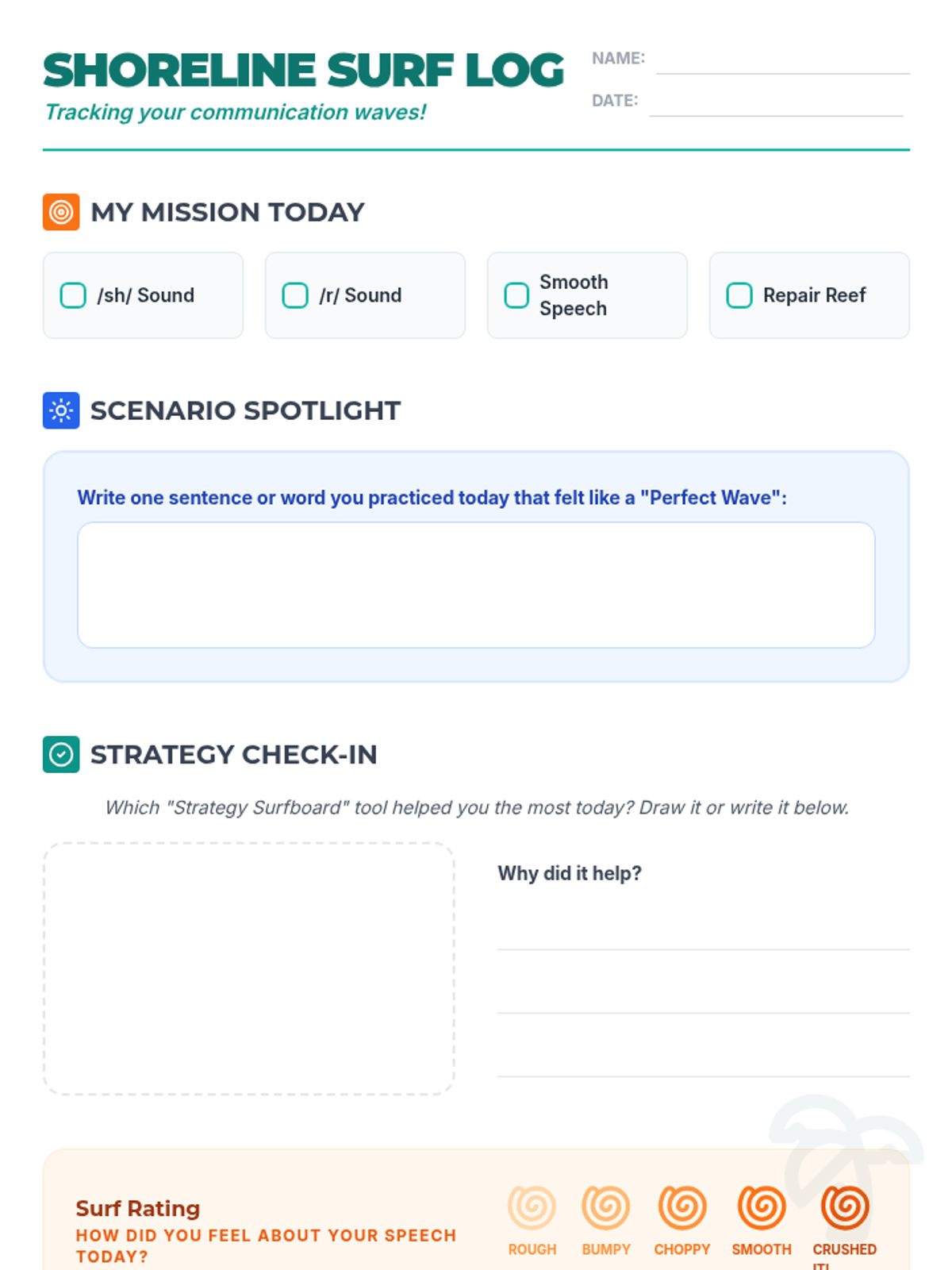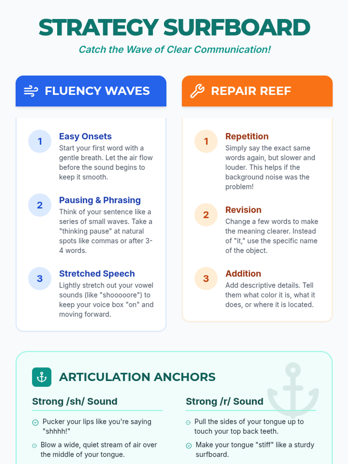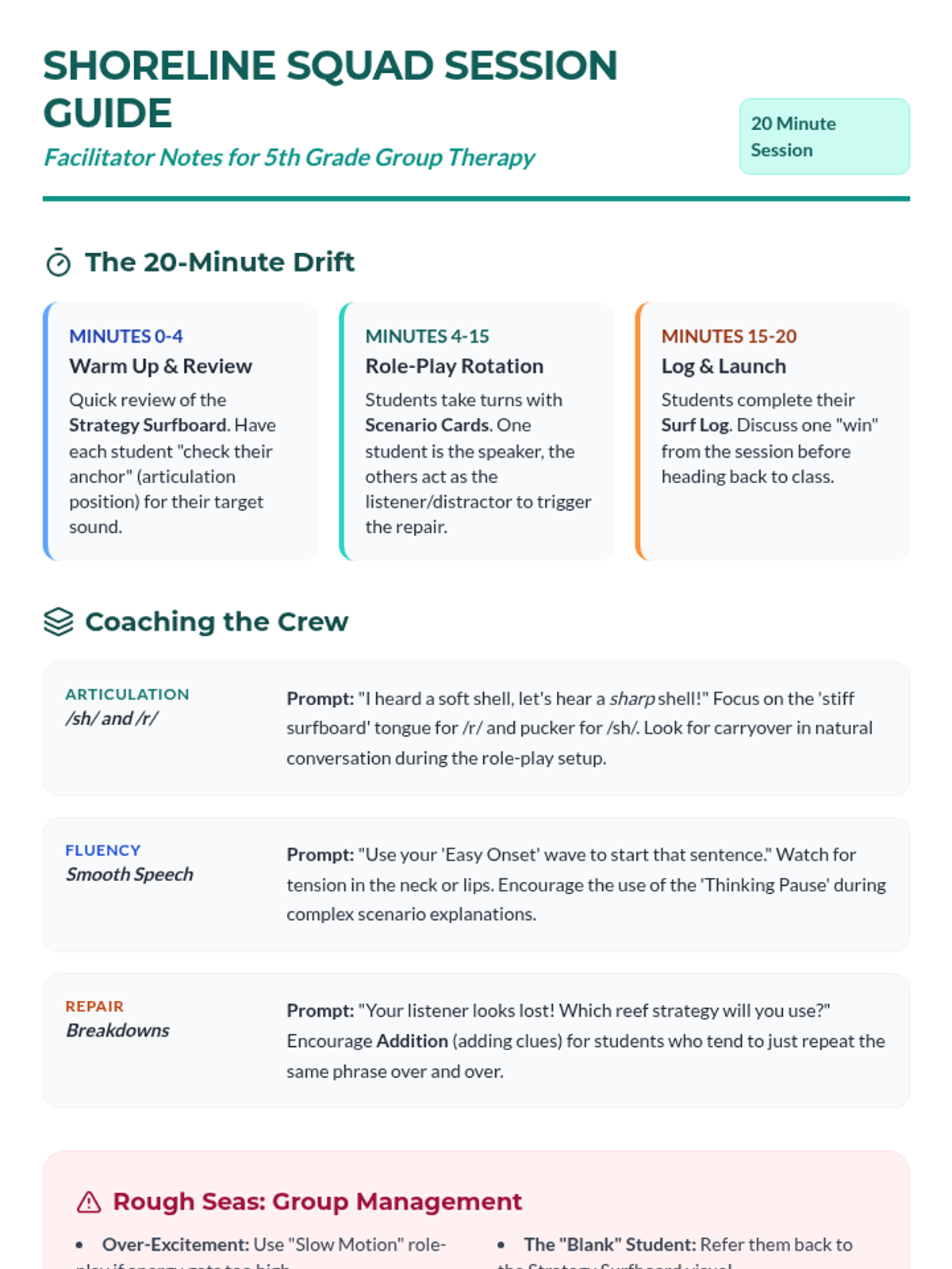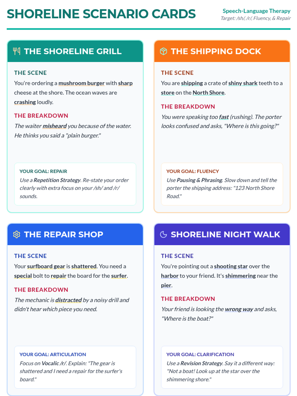 A targeted speech therapy lesson for 5th graders focusing on communication repair, fluency, and articulation of vocalic /r/ and /sh/ sounds through a coastal-themed role-play activity.