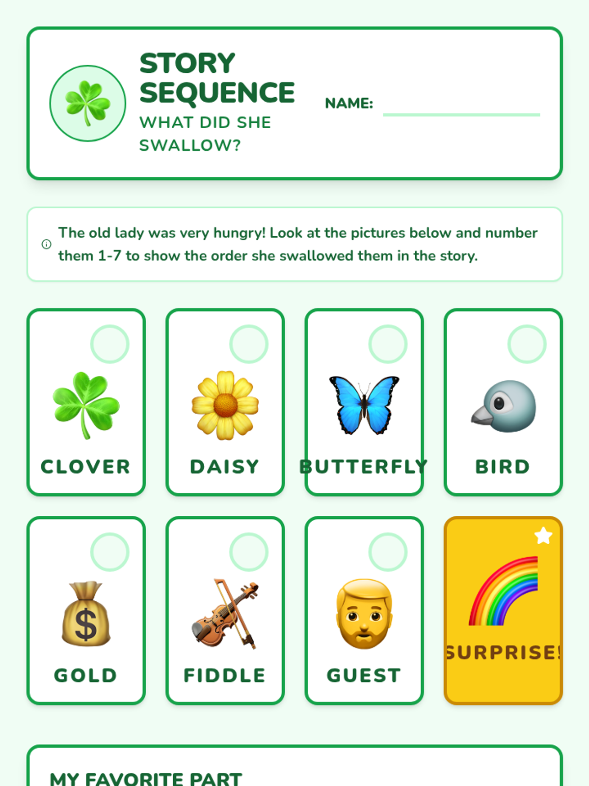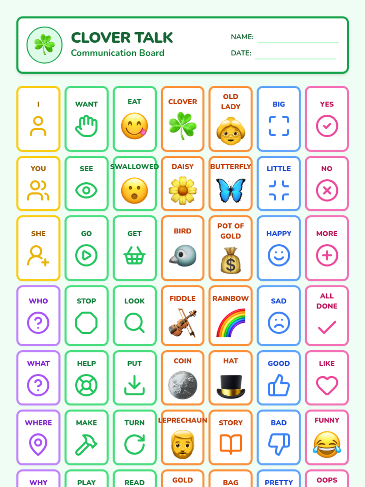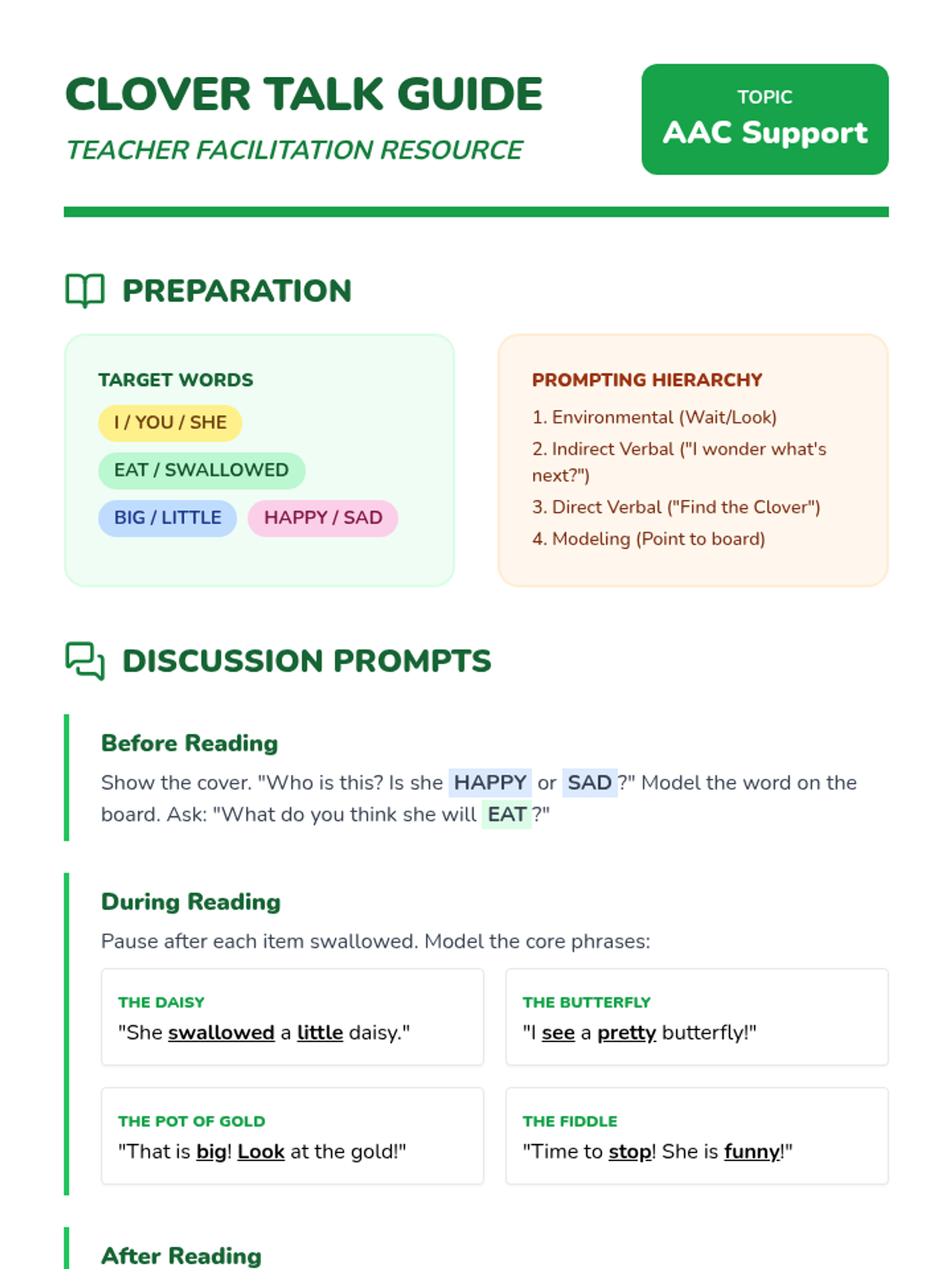 This lesson provides a comprehensive set of visual and communication tools for students to engage with the story 'There Was an Old Lady Who Swallowed a Clover'. It focuses on core vocabulary, story sequencing, and building expressive language skills through AAC-style supports.