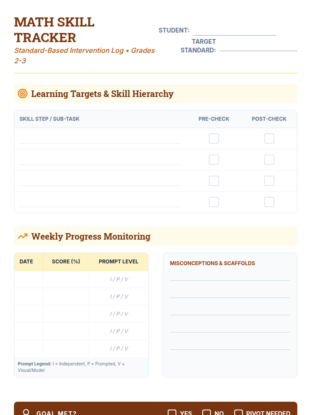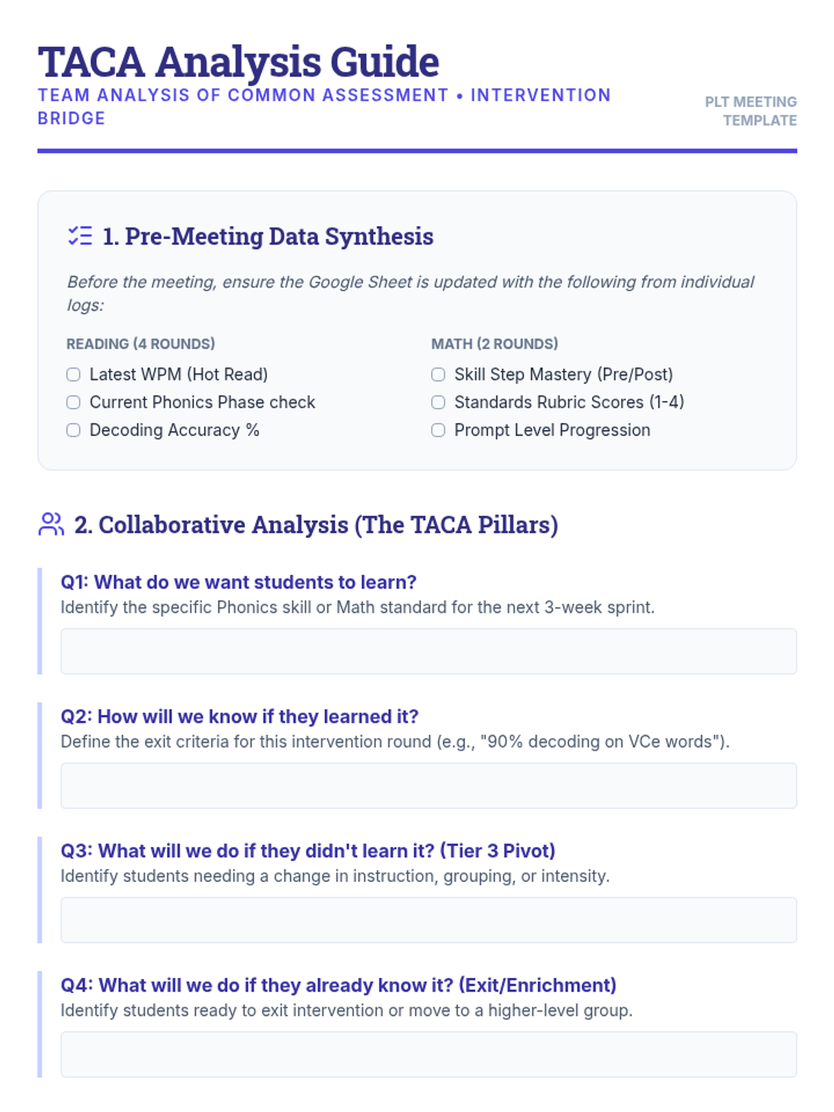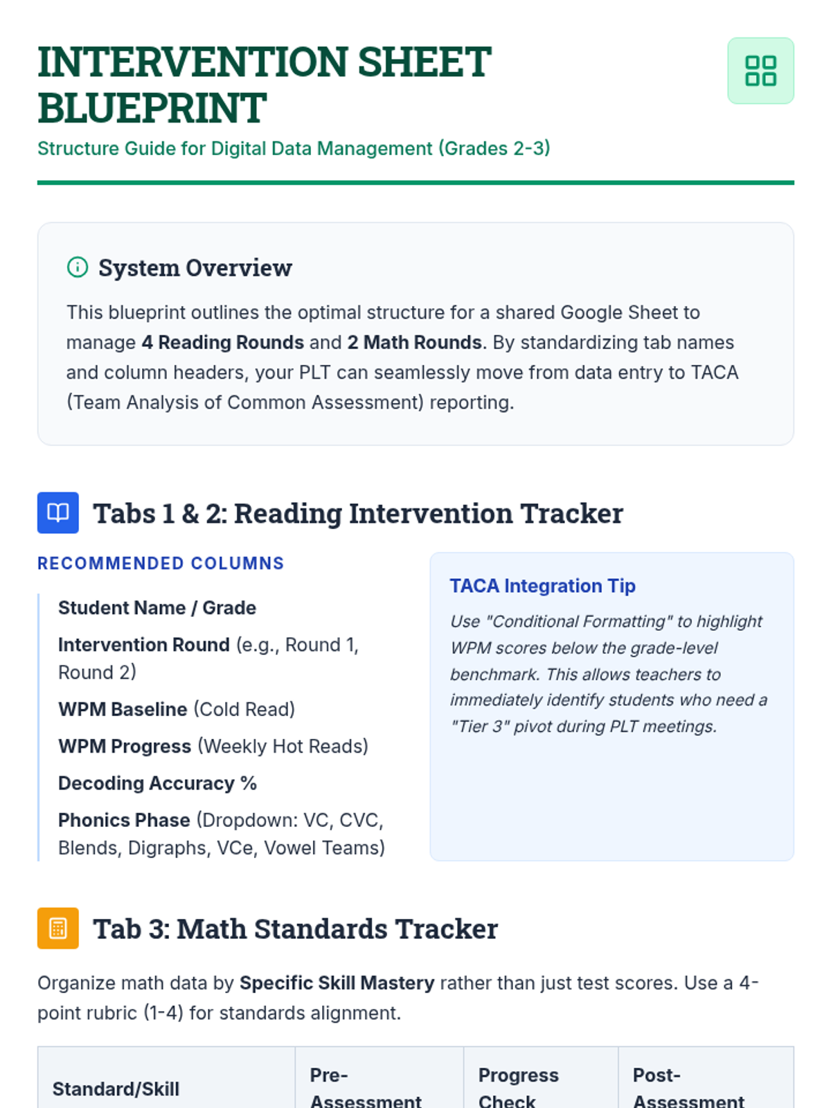 A comprehensive system for organizing 2nd and 3rd-grade intervention data, featuring blueprints for digital tracking and printable logs for classroom use. This lesson bridges the gap between raw student data and collaborative TACA analysis.
