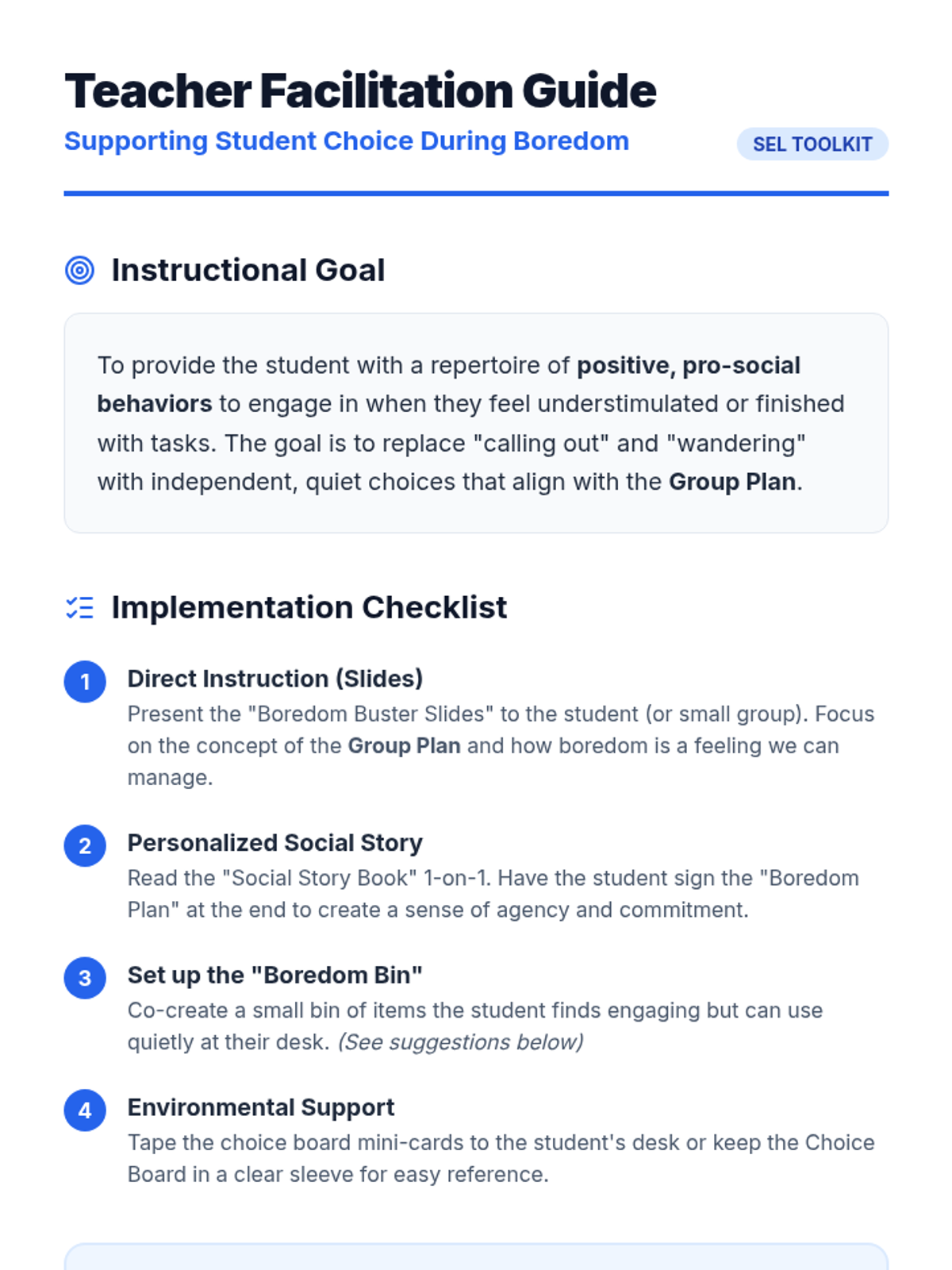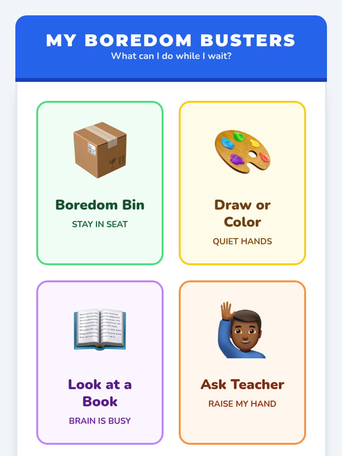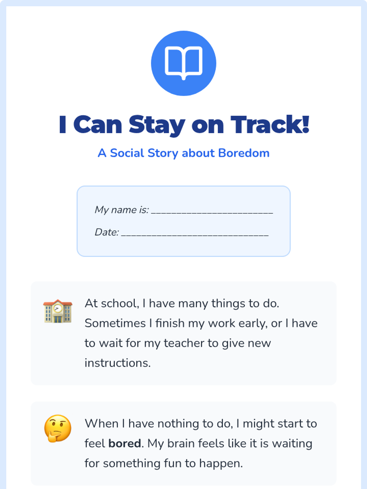 This lesson introduces the concept of boredom and provides concrete strategies for staying on task and following the group plan. It includes a social story and visual aids to help students make positive choices when they feel understimulated.