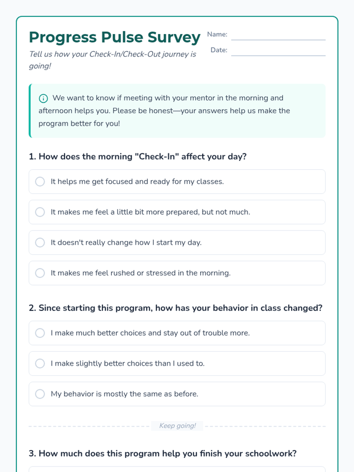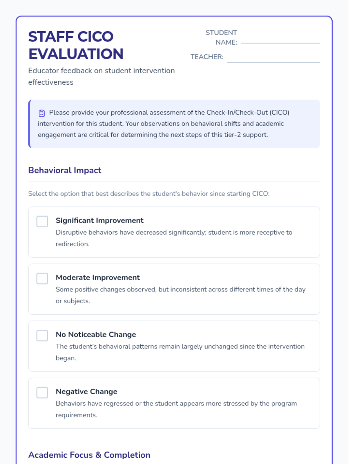 A collection of surveys and feedback tools designed to evaluate the effectiveness of Check-In/Check-Out (CICO) interventions on student behavior and academic focus.