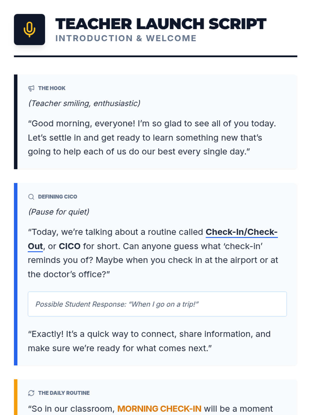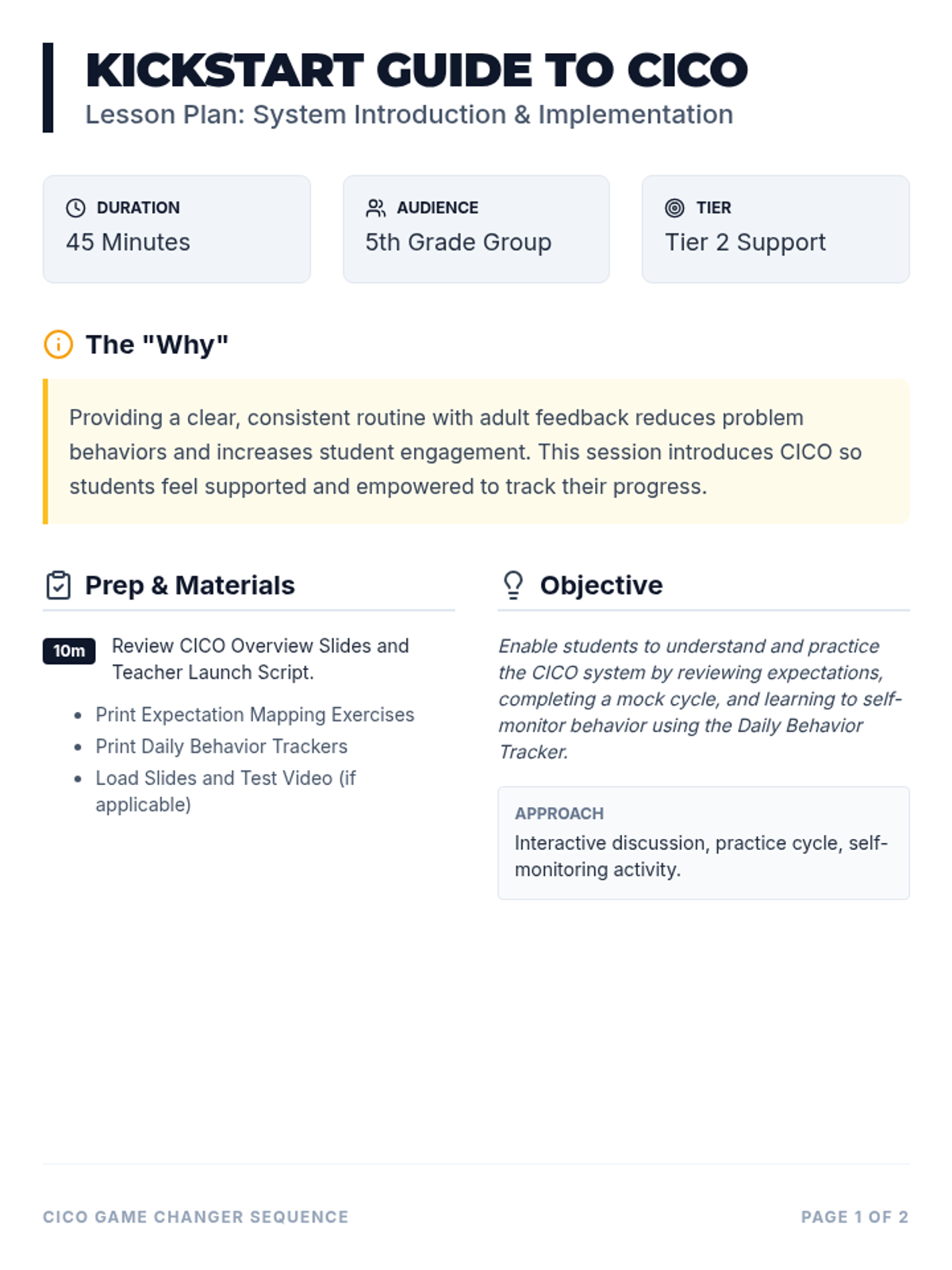 A 45-minute Tier 2 group lesson for 5th graders to introduce the Check-In/Check-Out (CICO) system. This session focuses on defining expectations, practicing the routine, and empowering students to self-monitor their behavior with a supportive adult coach.