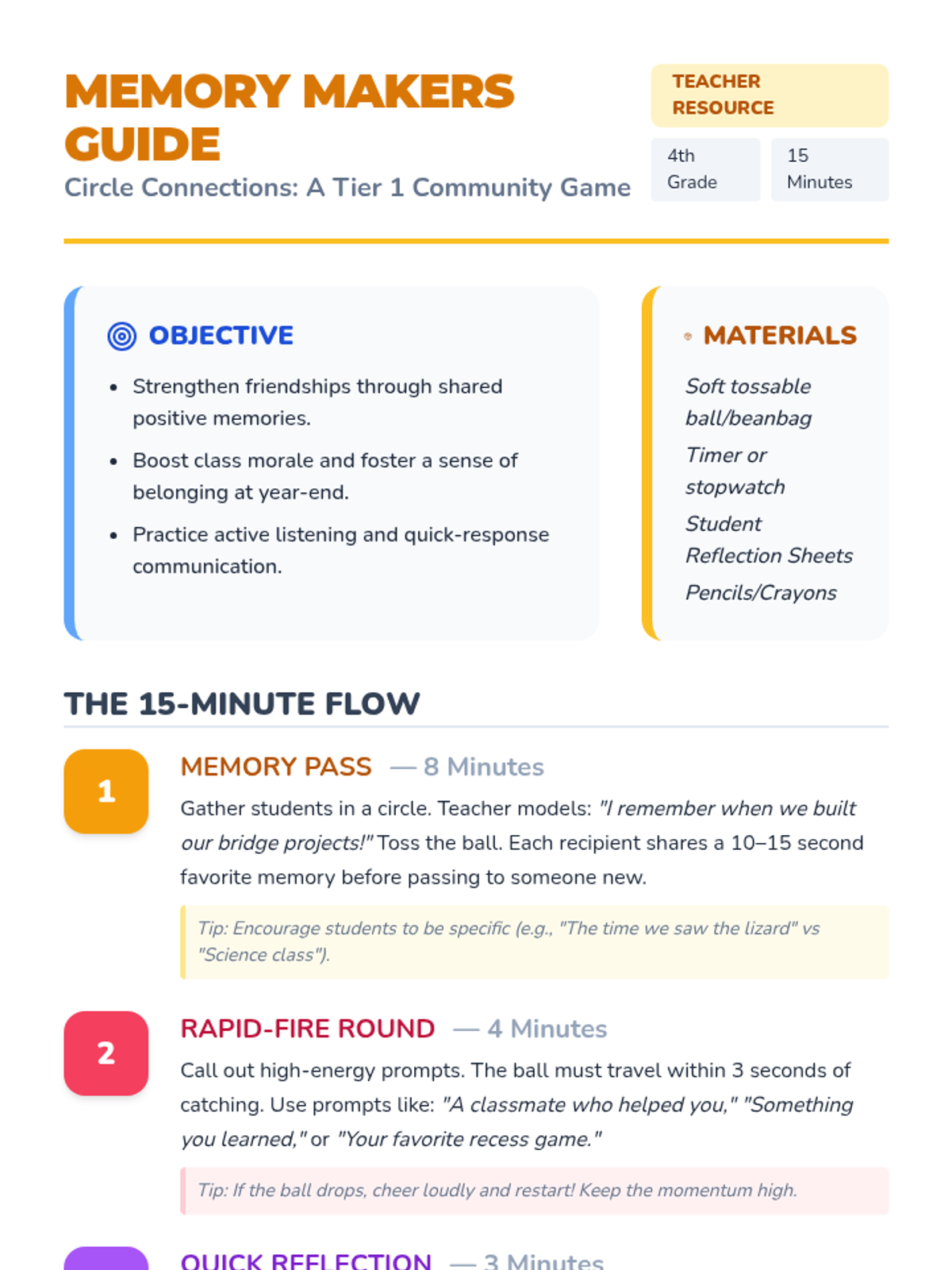 A 15-minute, end-of-year community-building game for 4th graders to celebrate memories and strengthen friendships through movement and reflection.