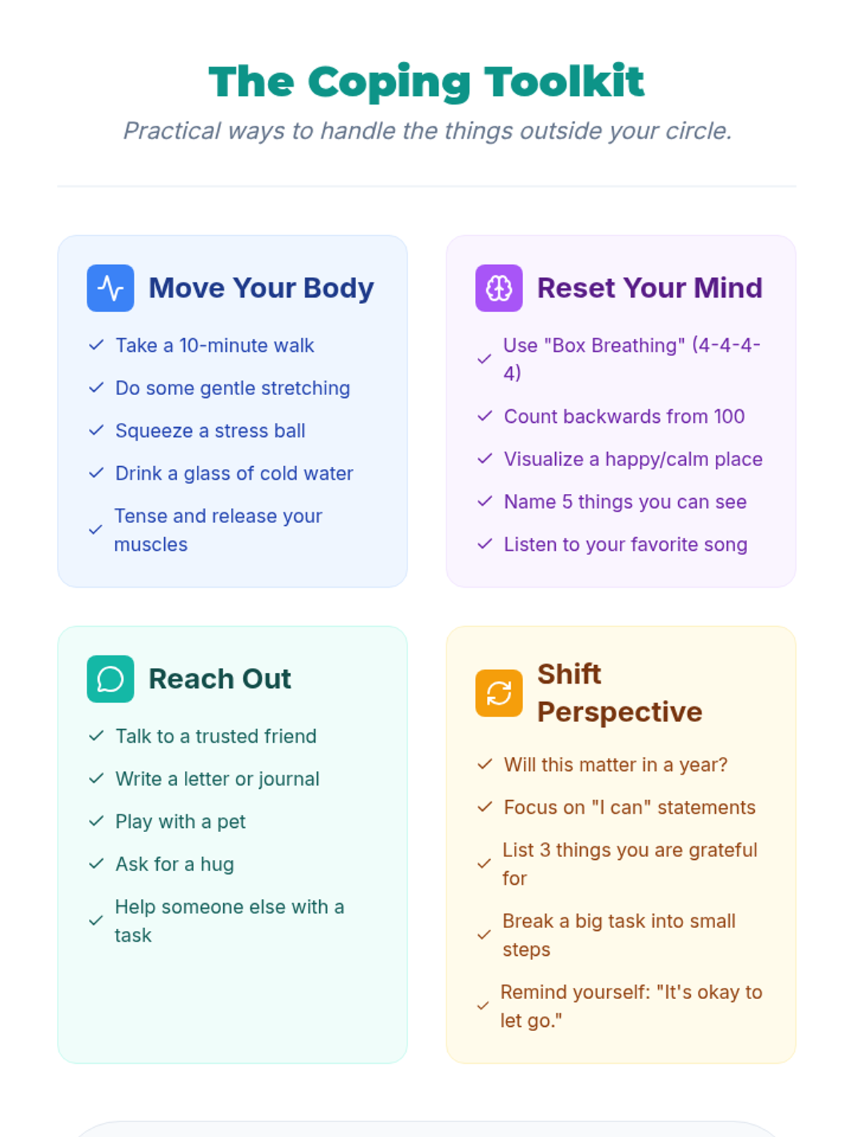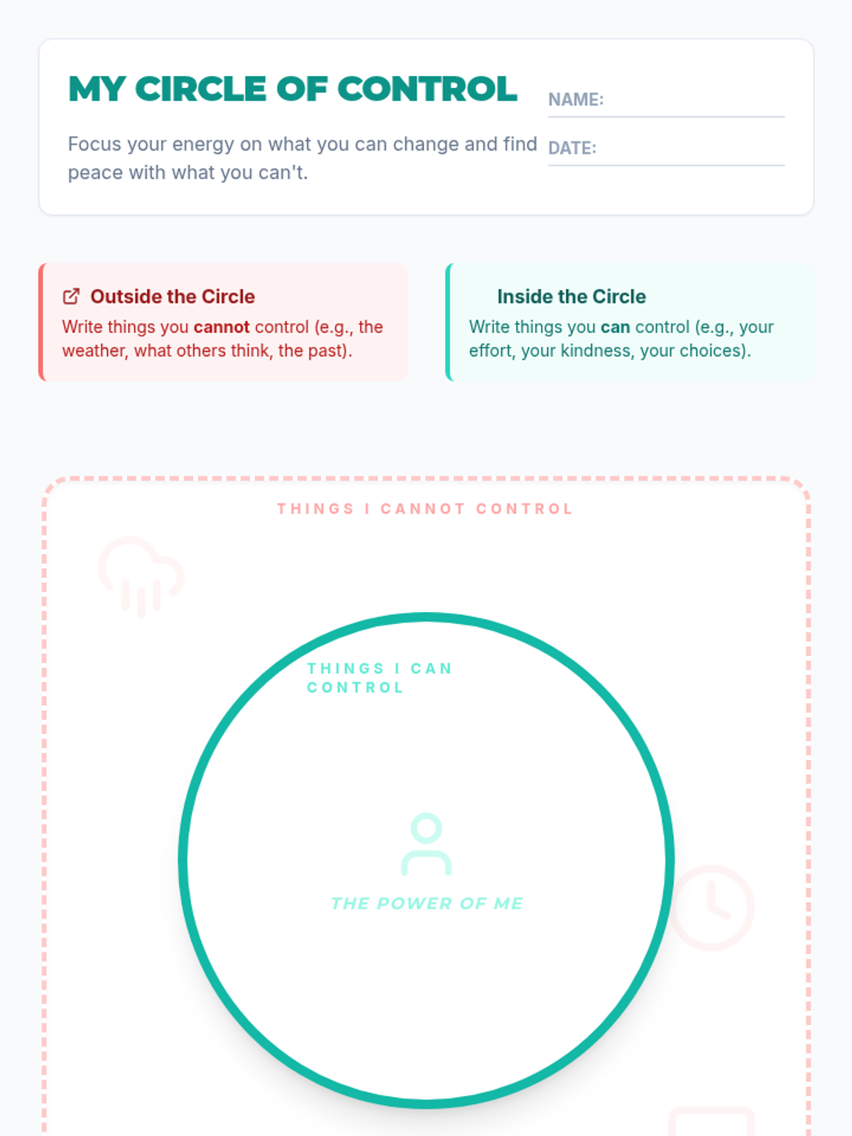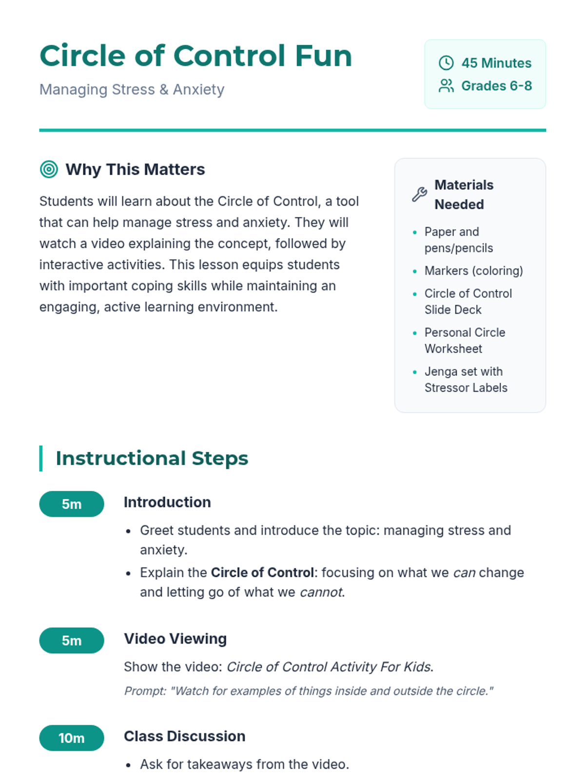 A middle school lesson introducing the Circle of Control concept to help students manage stress and anxiety through interactive activities and discussion.