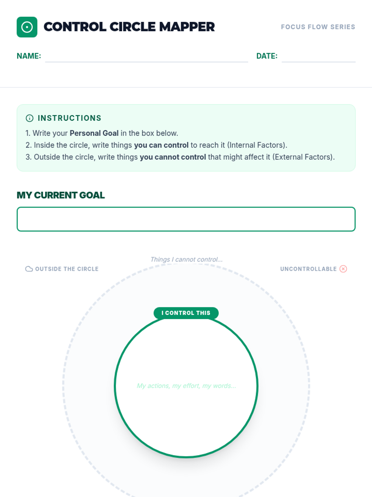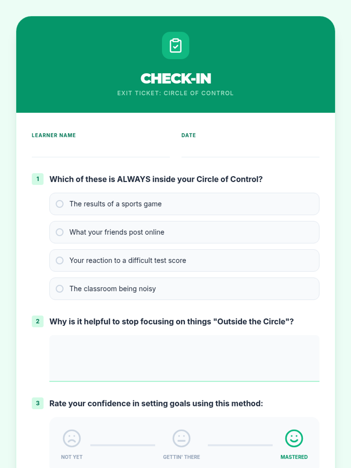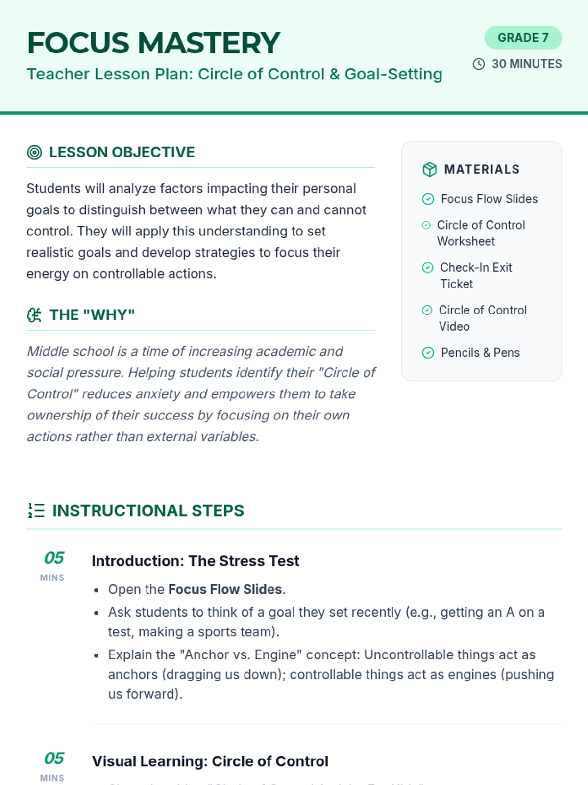 A lesson for 7th-grade students to understand the concept of the Circle of Control and apply it to setting manageable personal goals through interactive activities and reflection.