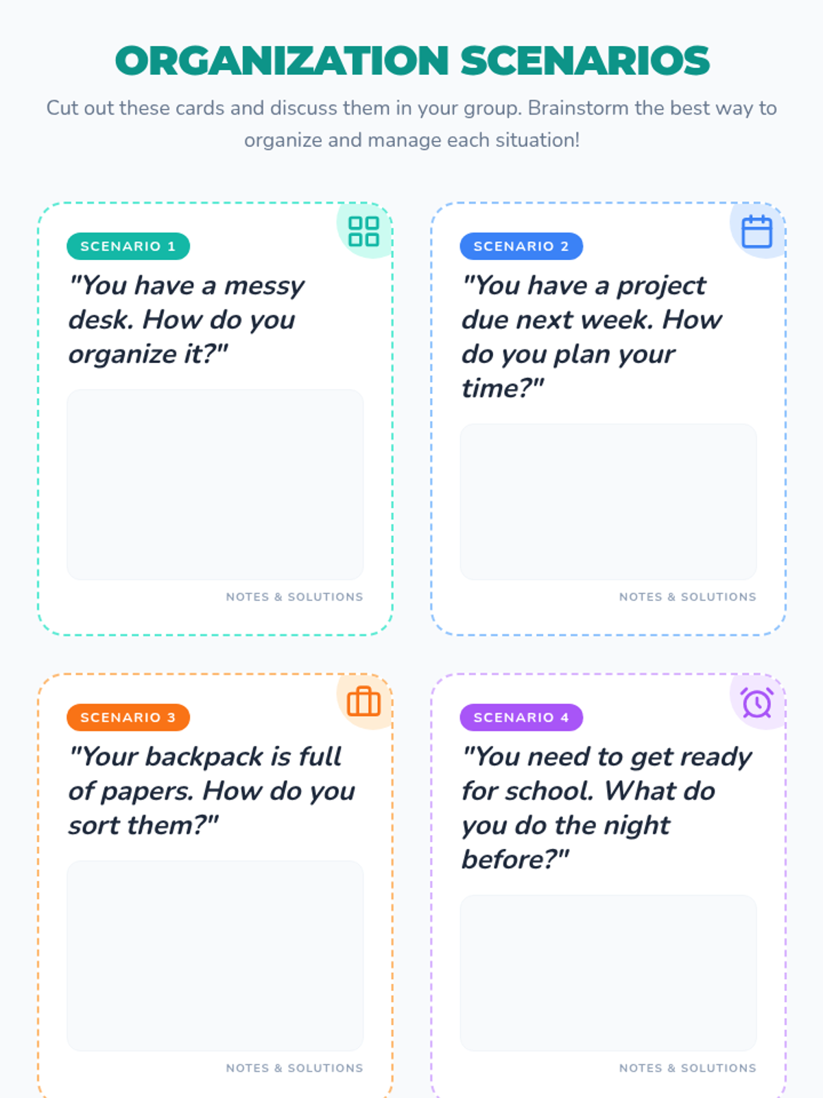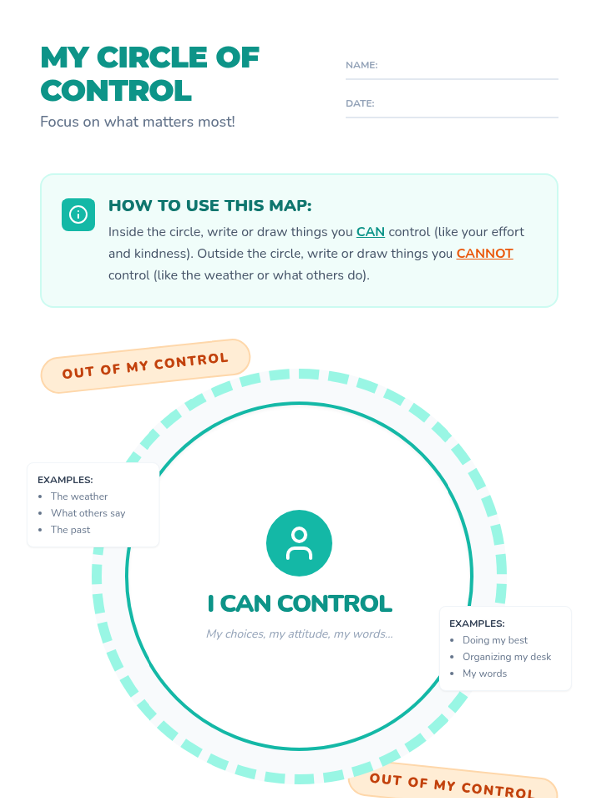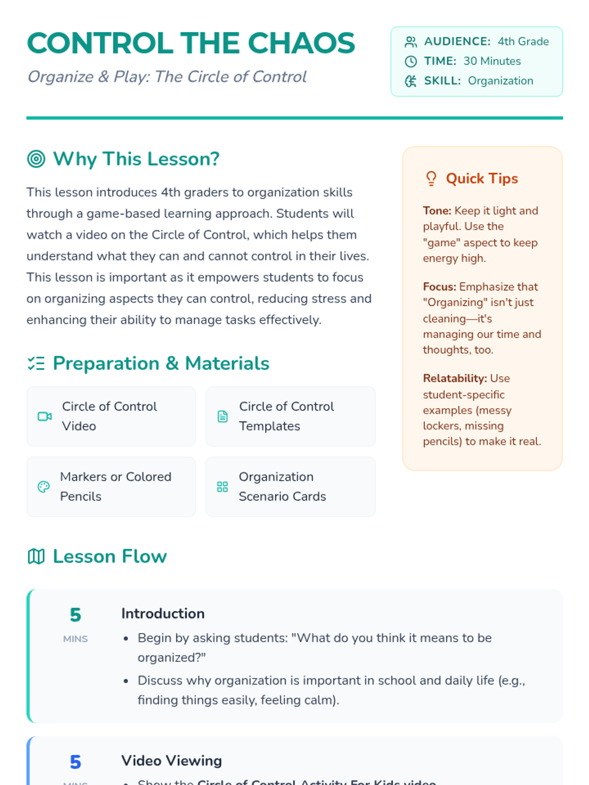 A 30-minute game-based lesson for 4th graders that teaches organization through the 'Circle of Control' concept, helping students focus on what they can manage to reduce stress.