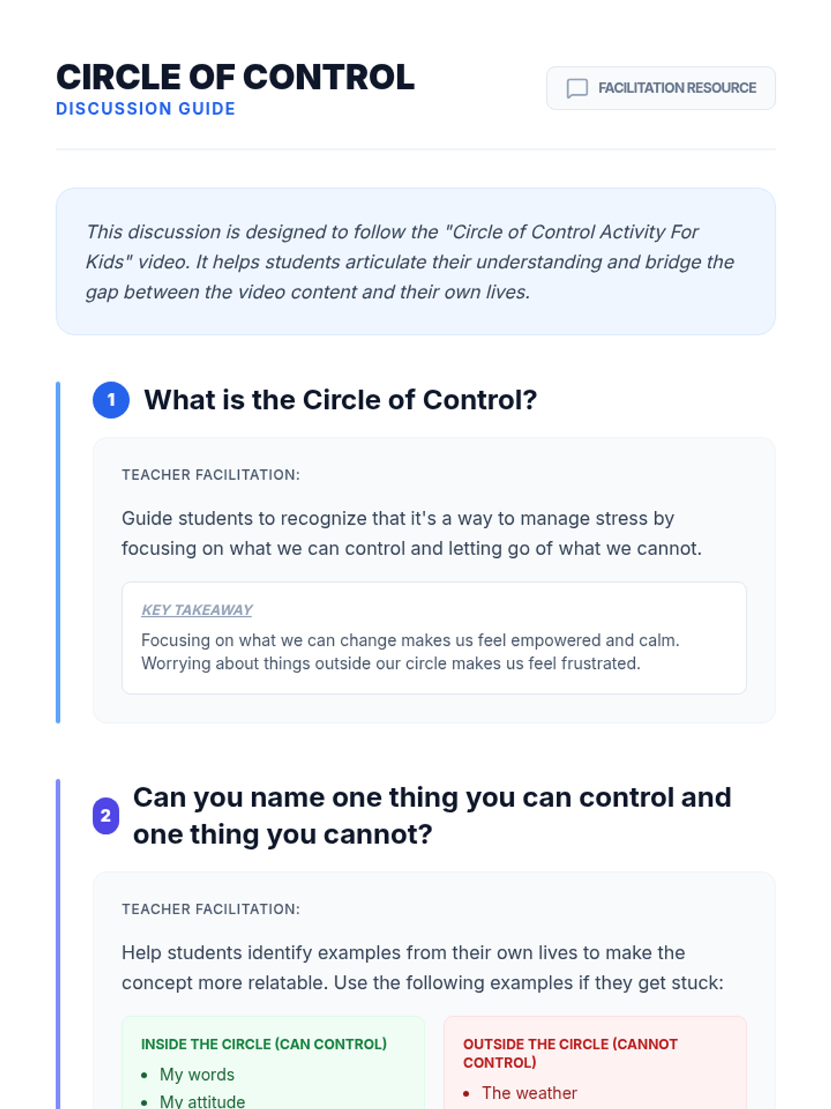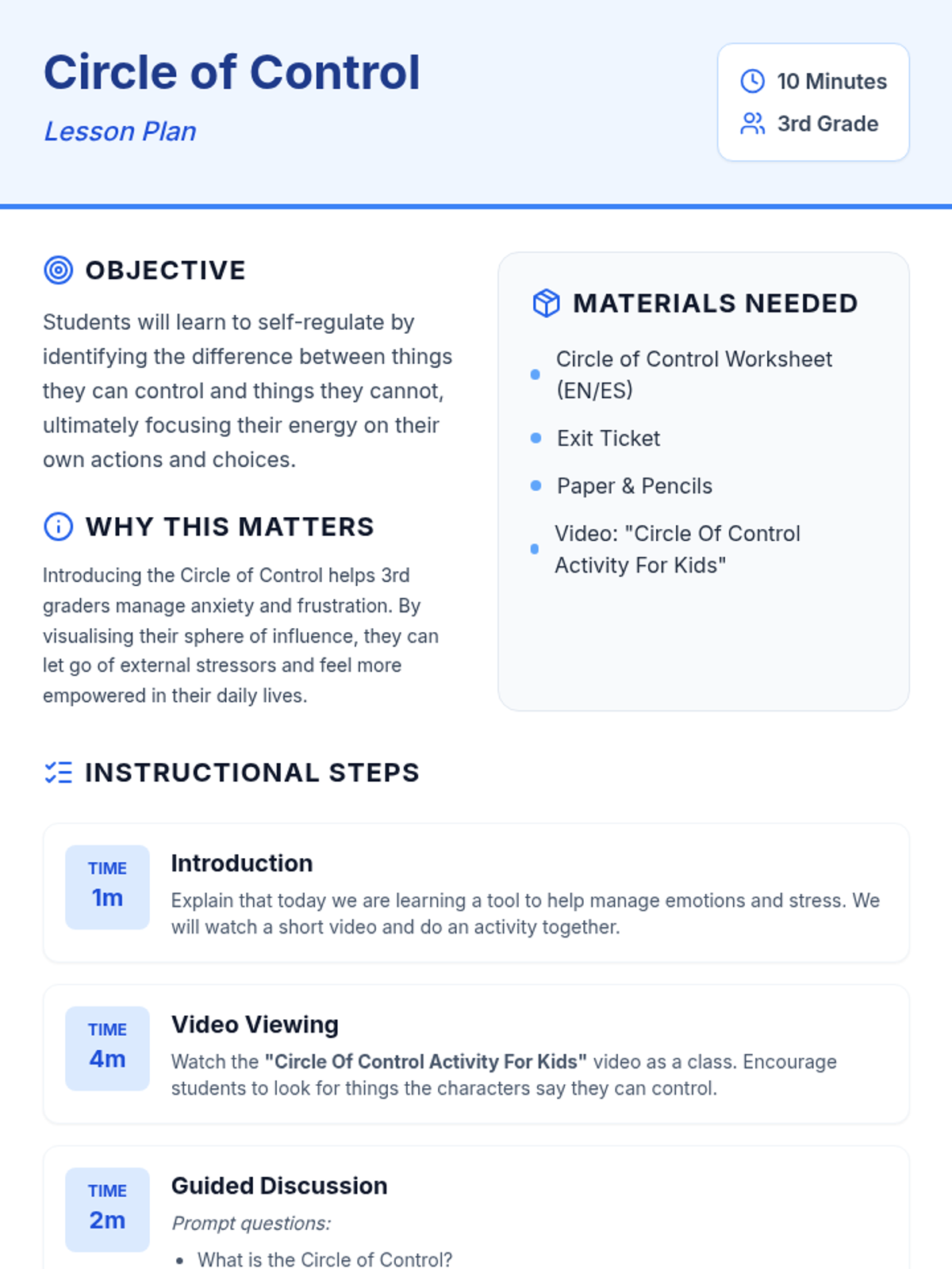 This lesson introduces the concept of the Circle of Control to help 3rd-grade students understand and manage their emotions by focusing on what they can control. The lesson includes a video, discussion, and activity to apply the concept practically.
