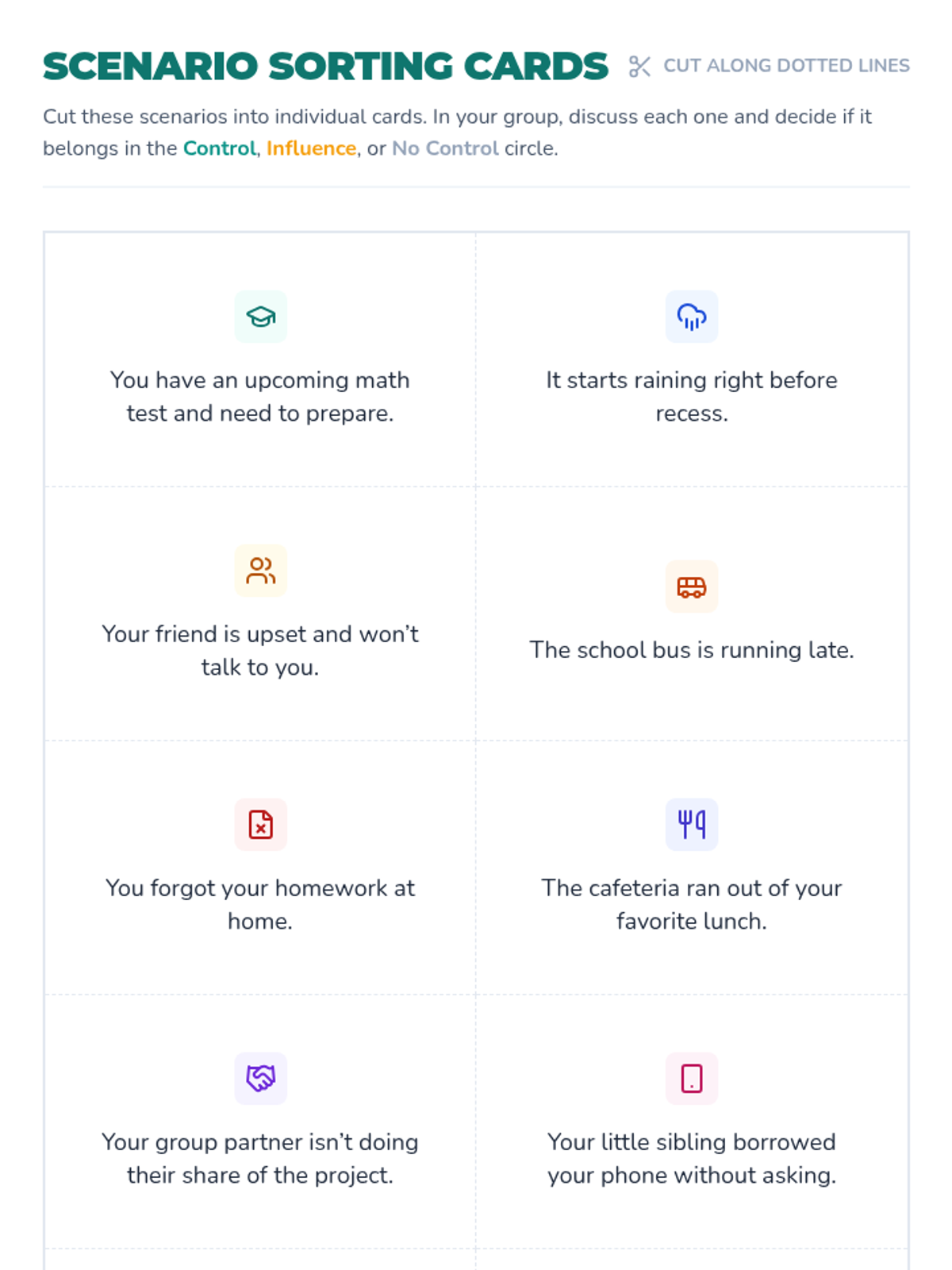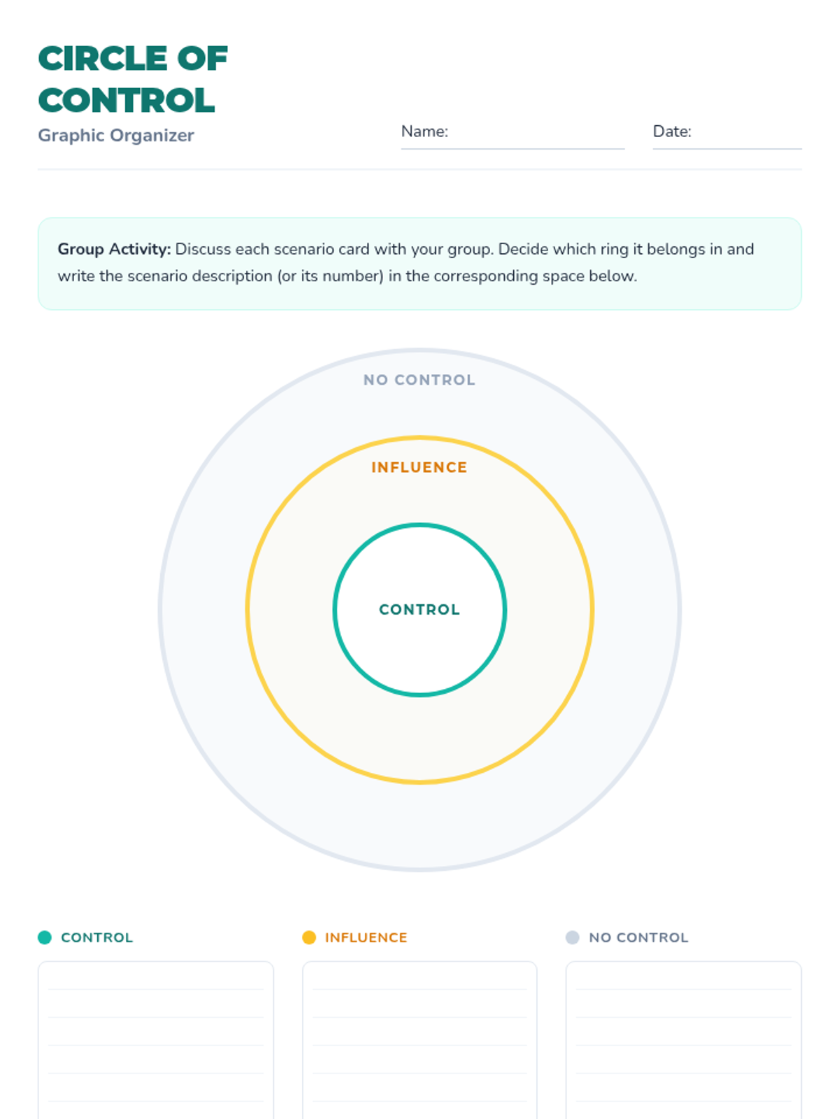 Students will explore the concept of the 'Circle of Control' to identify what they can and cannot influence in their daily lives. This essential life skill lesson empowers 6th graders to boost resilience and reduce anxiety by focusing energy on what they can change.