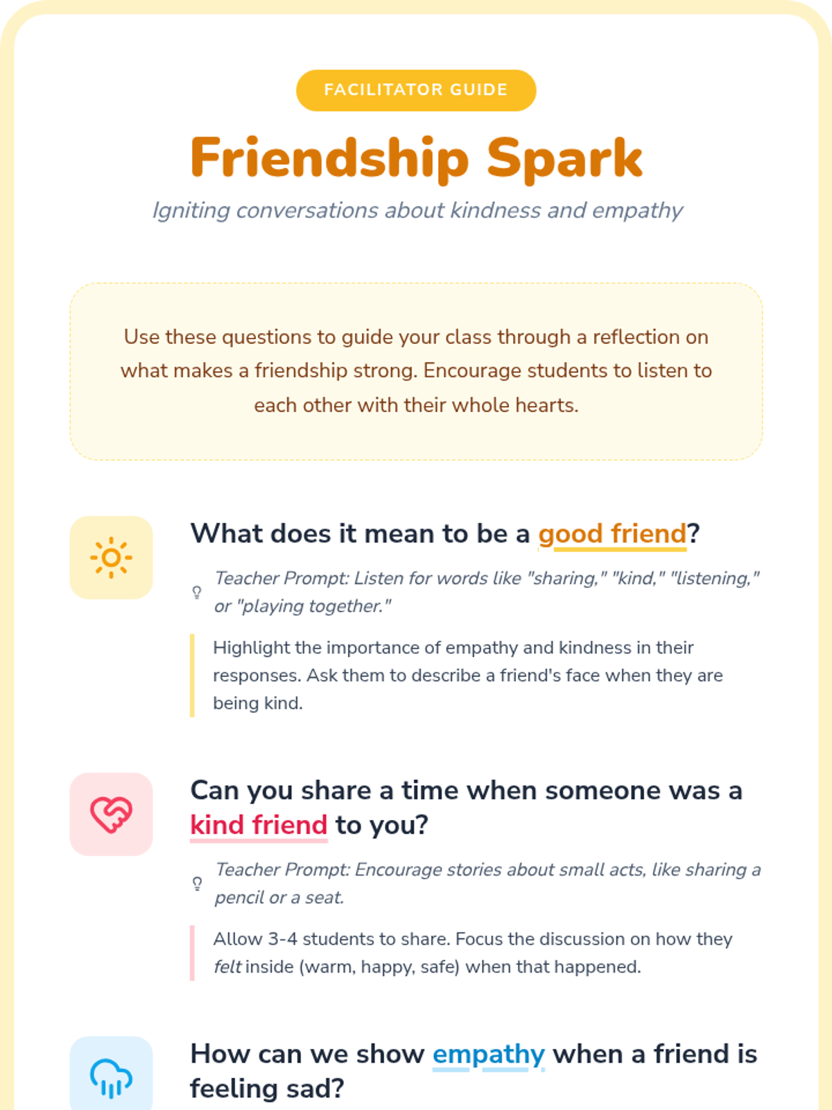 Students explore the foundations of building and keeping friendships through role-play and creative expression, focusing on empathy and kindness as essential tools for social-emotional growth.