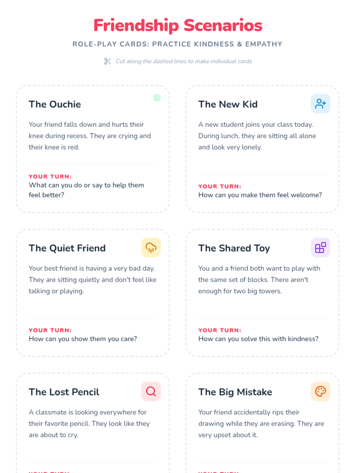A lesson designed to help students distinguish between Small and Big Problems and choose safe regulation strategies instead of physical reactions. It includes a social story, practice worksheet, and strategy reference guide.
