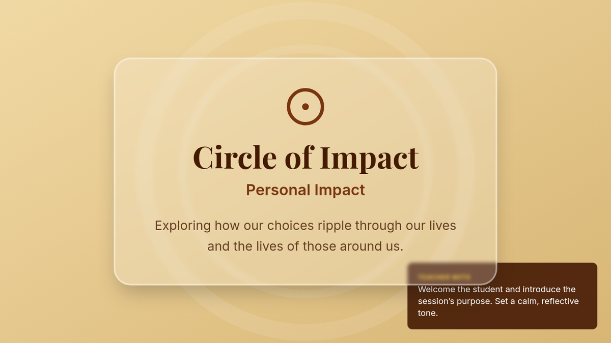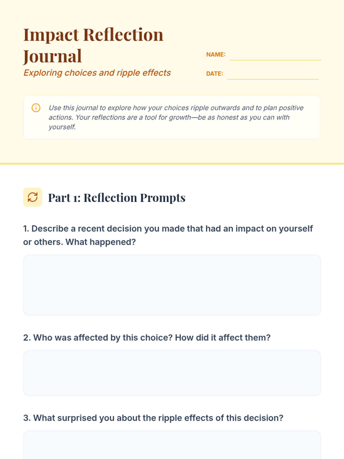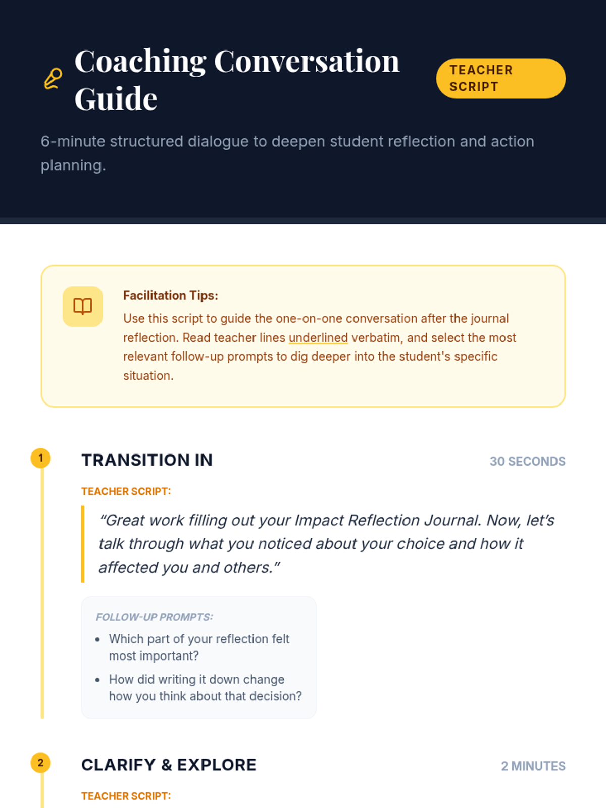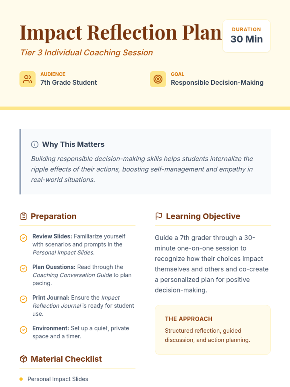 A 30-minute Tier 3 individual coaching session for 7th graders focused on CA SEL's Responsible Decision-Making. Students explore the ripple effects of their choices through scenarios, reflective journaling, and guided conversation to build a personalized action plan.