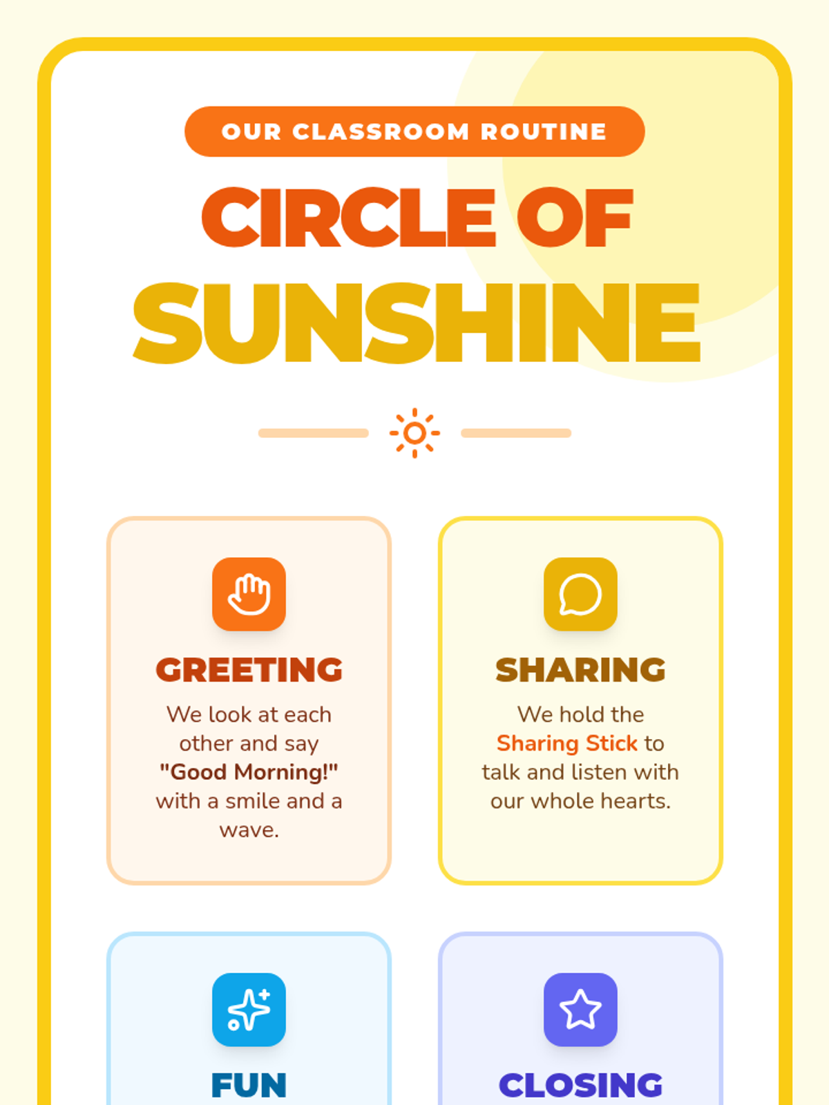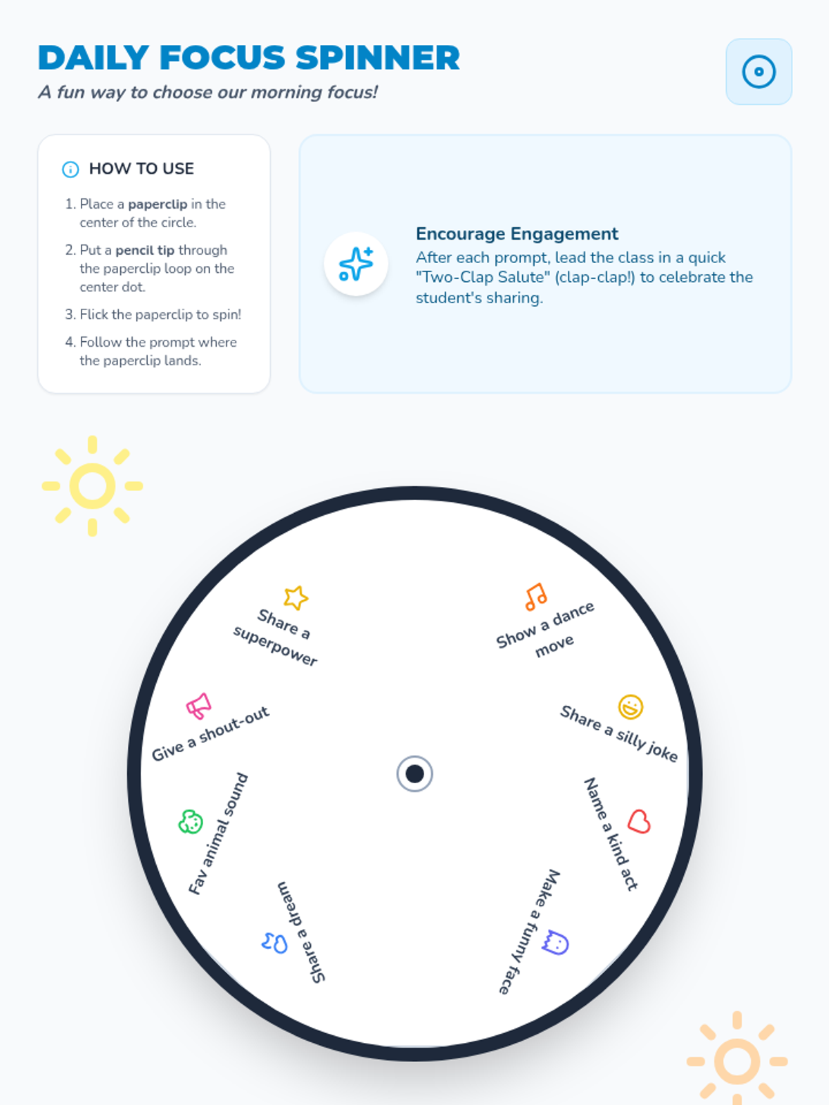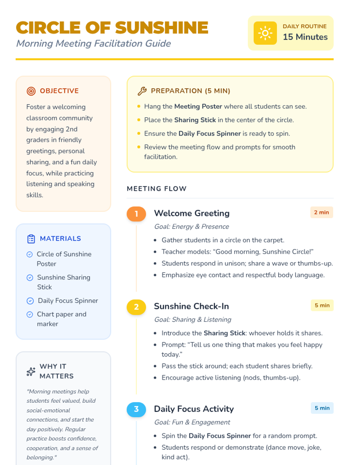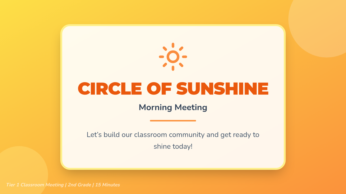 A cheerful 15-minute Tier 1 morning meeting for 2nd graders to build community and set a positive tone for the day through greetings, sharing, and a fun daily focus.