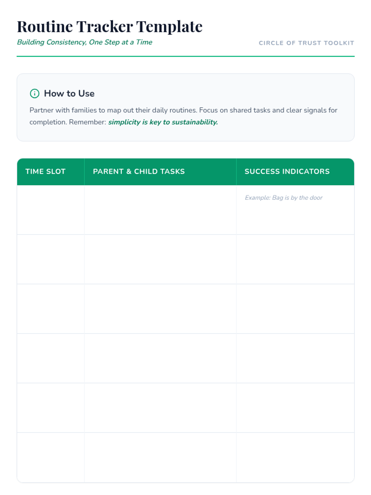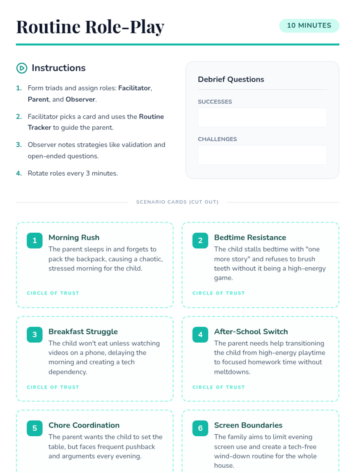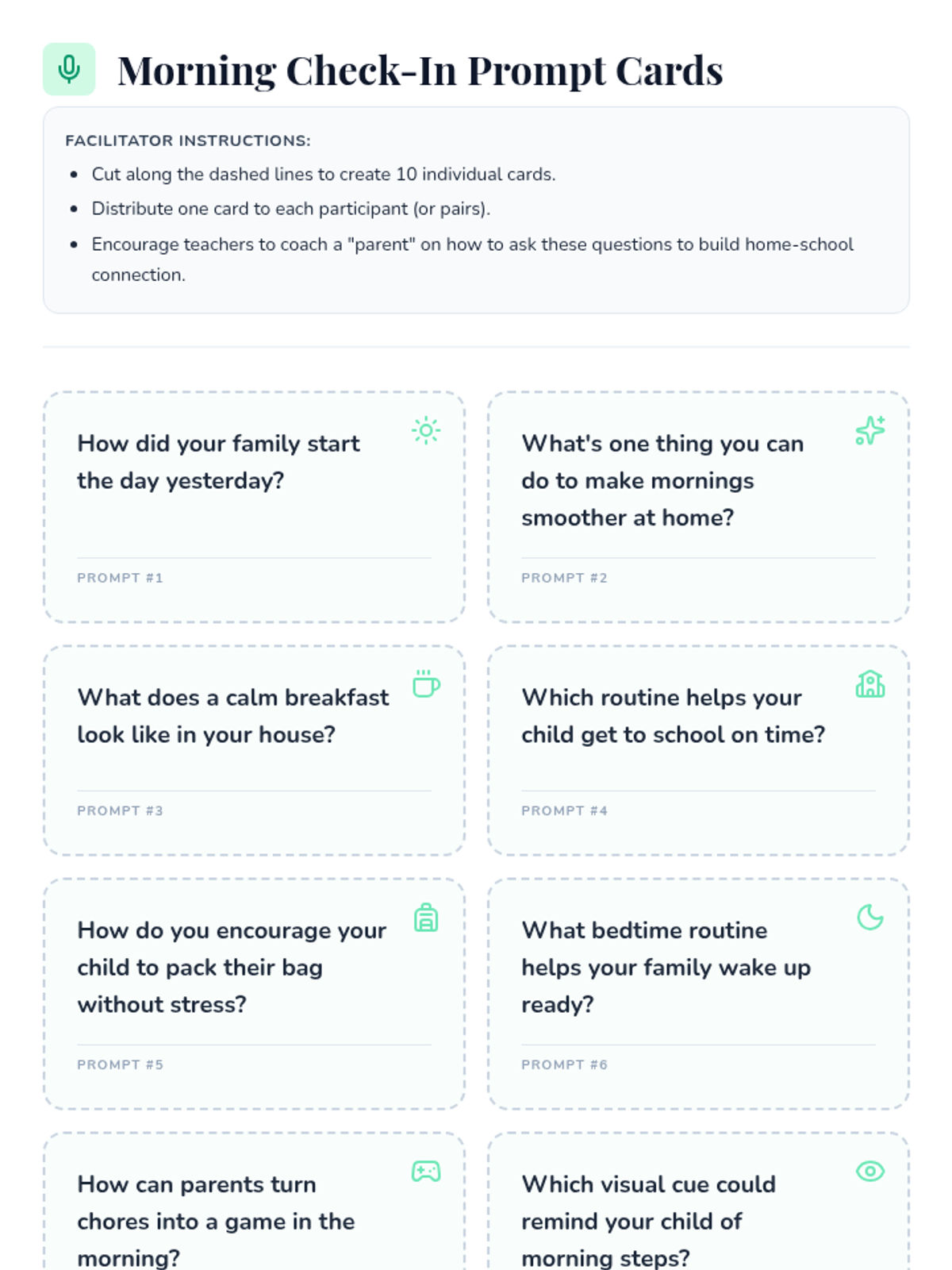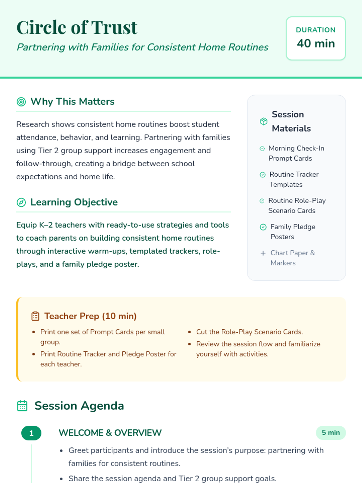 A 40-minute professional development session for K-2 teachers on coaching parents to build consistent home routines. Teachers will practice facilitation through role-plays and leave with actionable tools like prompt cards and routine trackers.