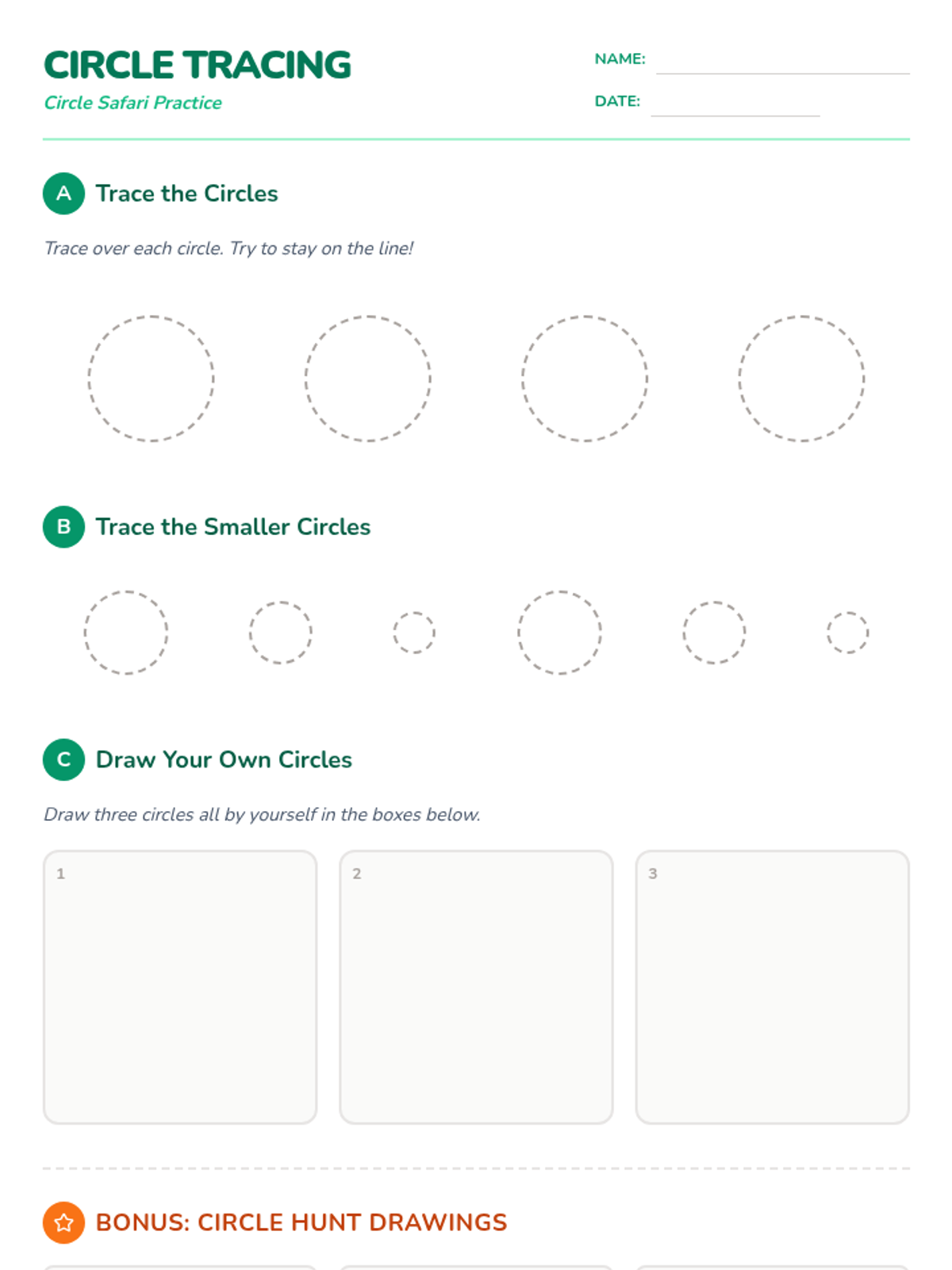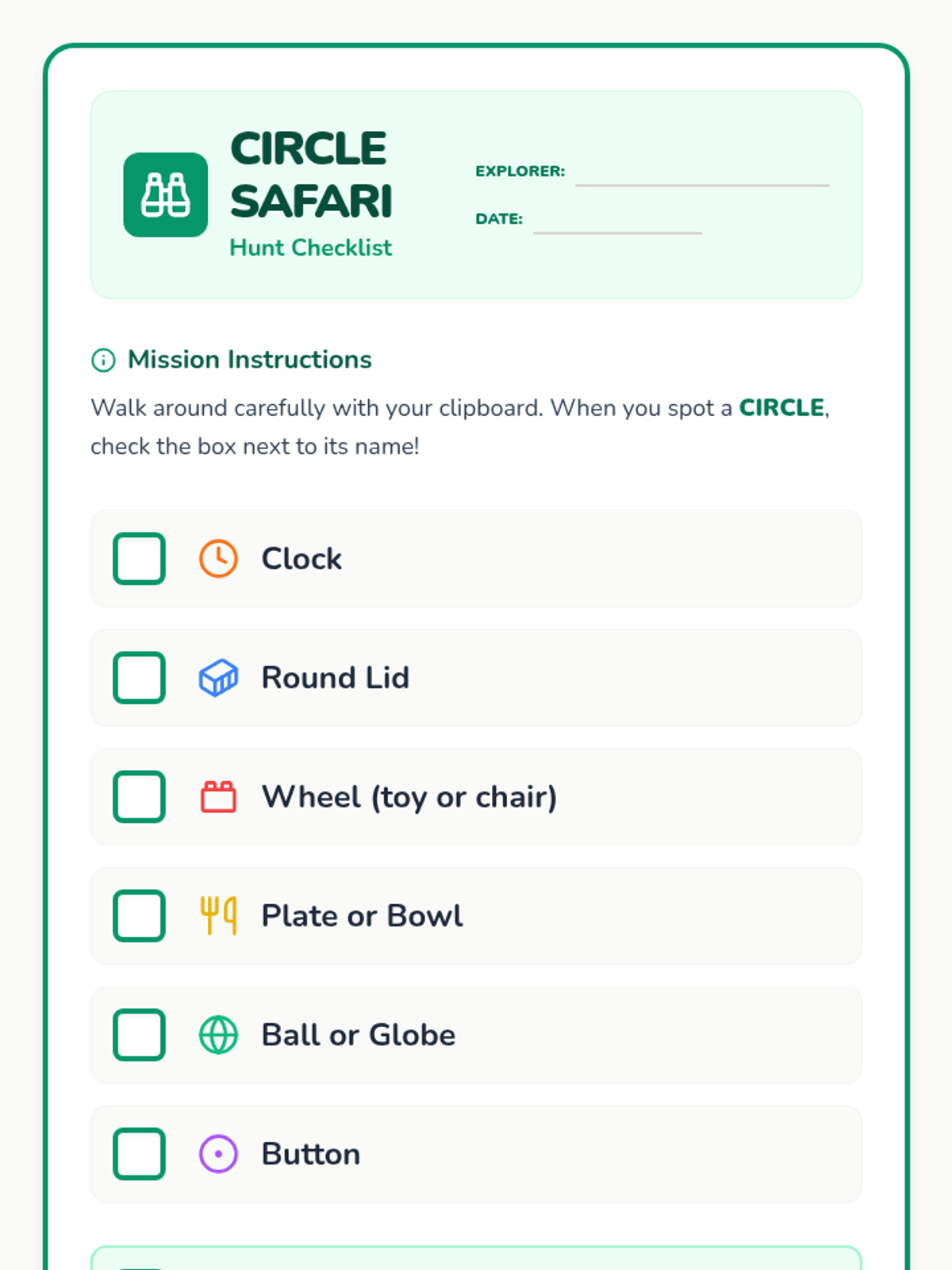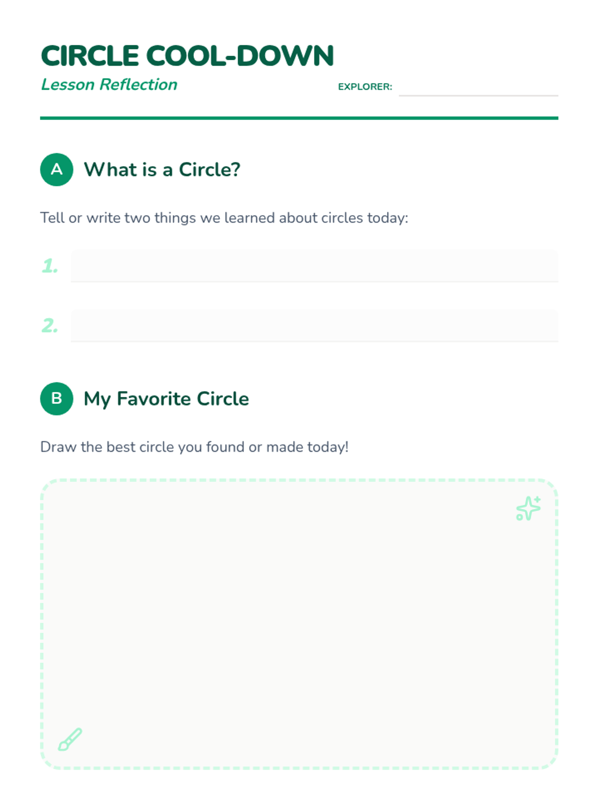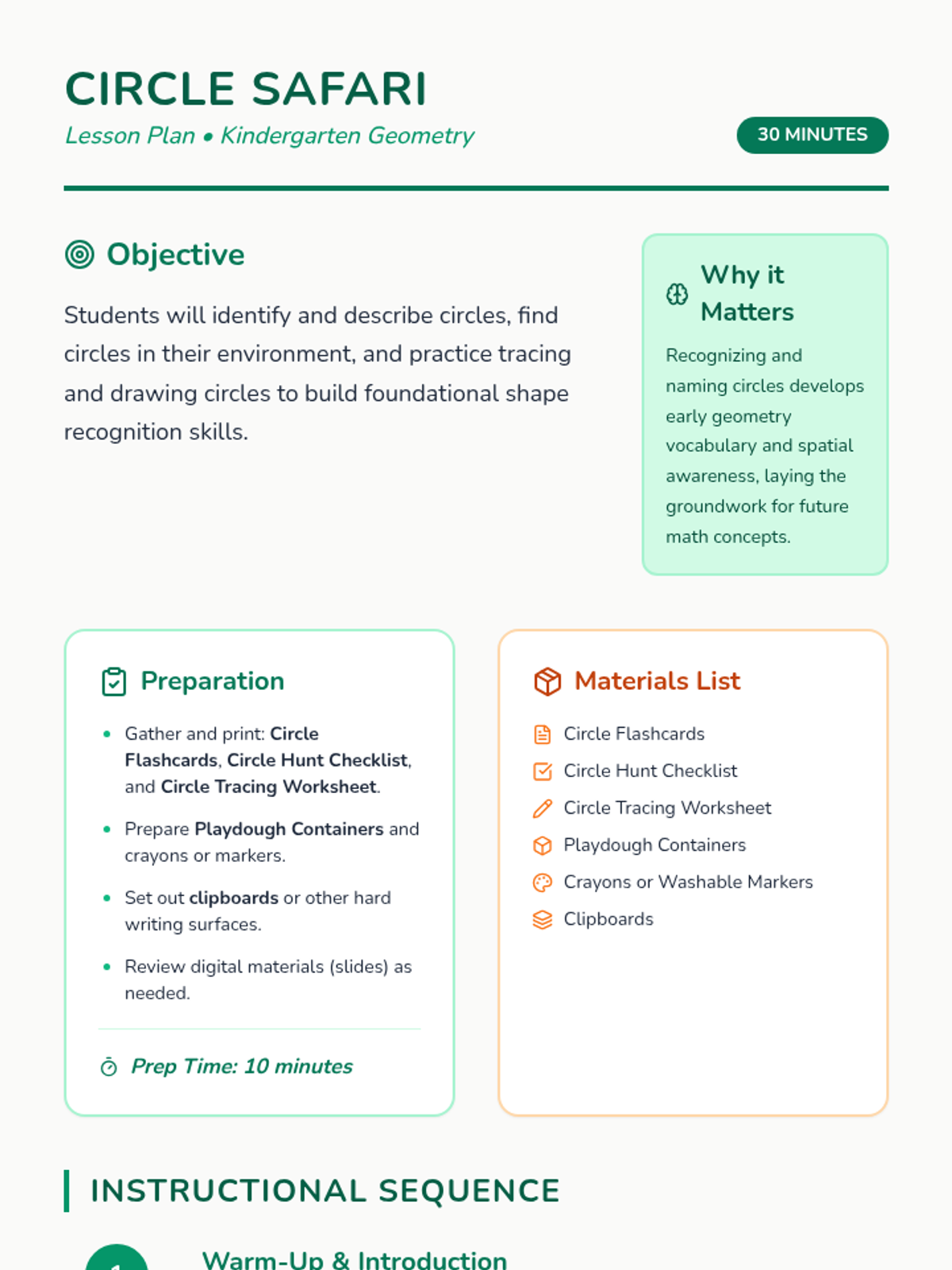 A hands-on kindergarten lesson where students explore, identify, and draw circles through a 'safari' scavenger hunt and creative play.