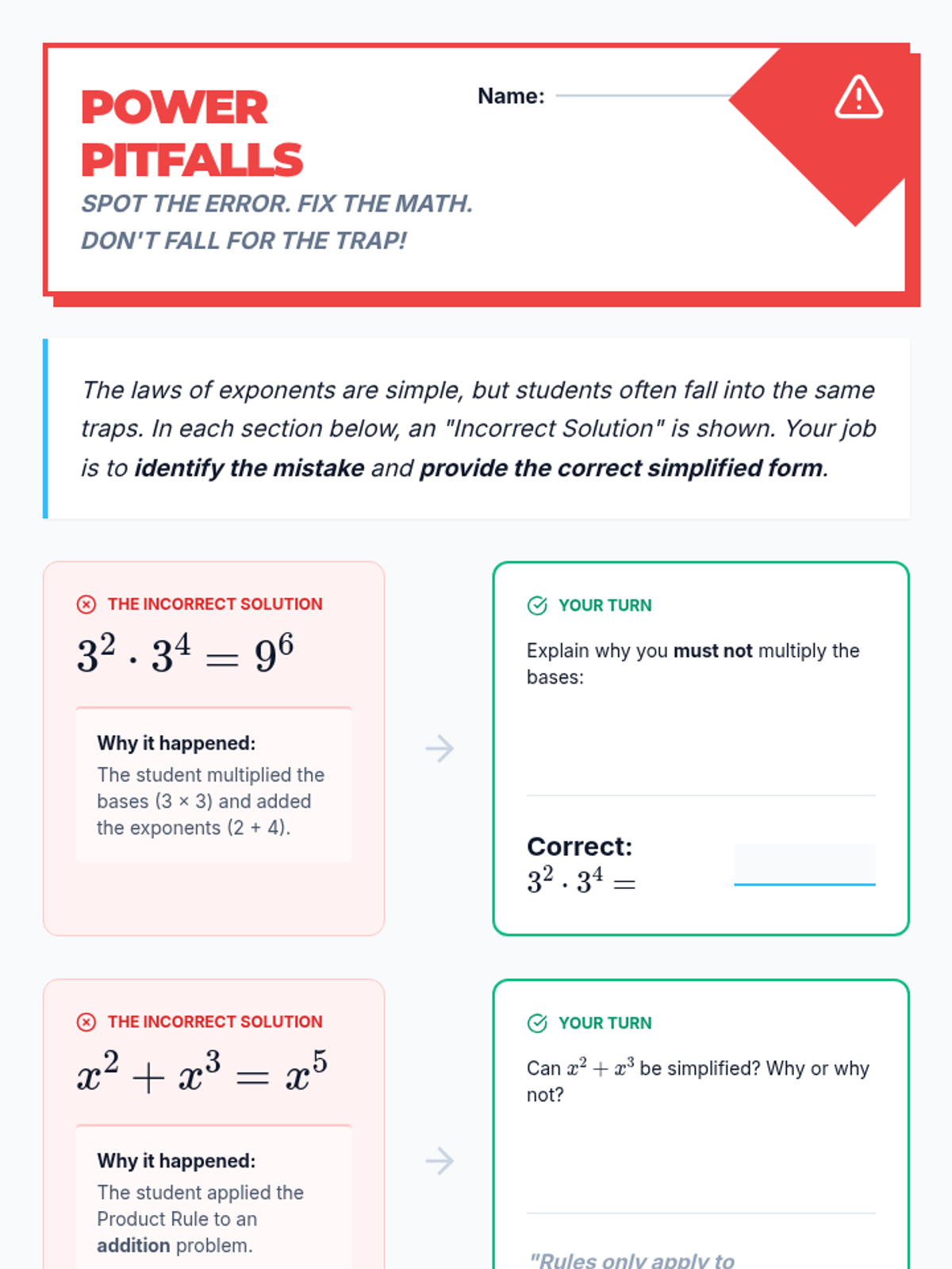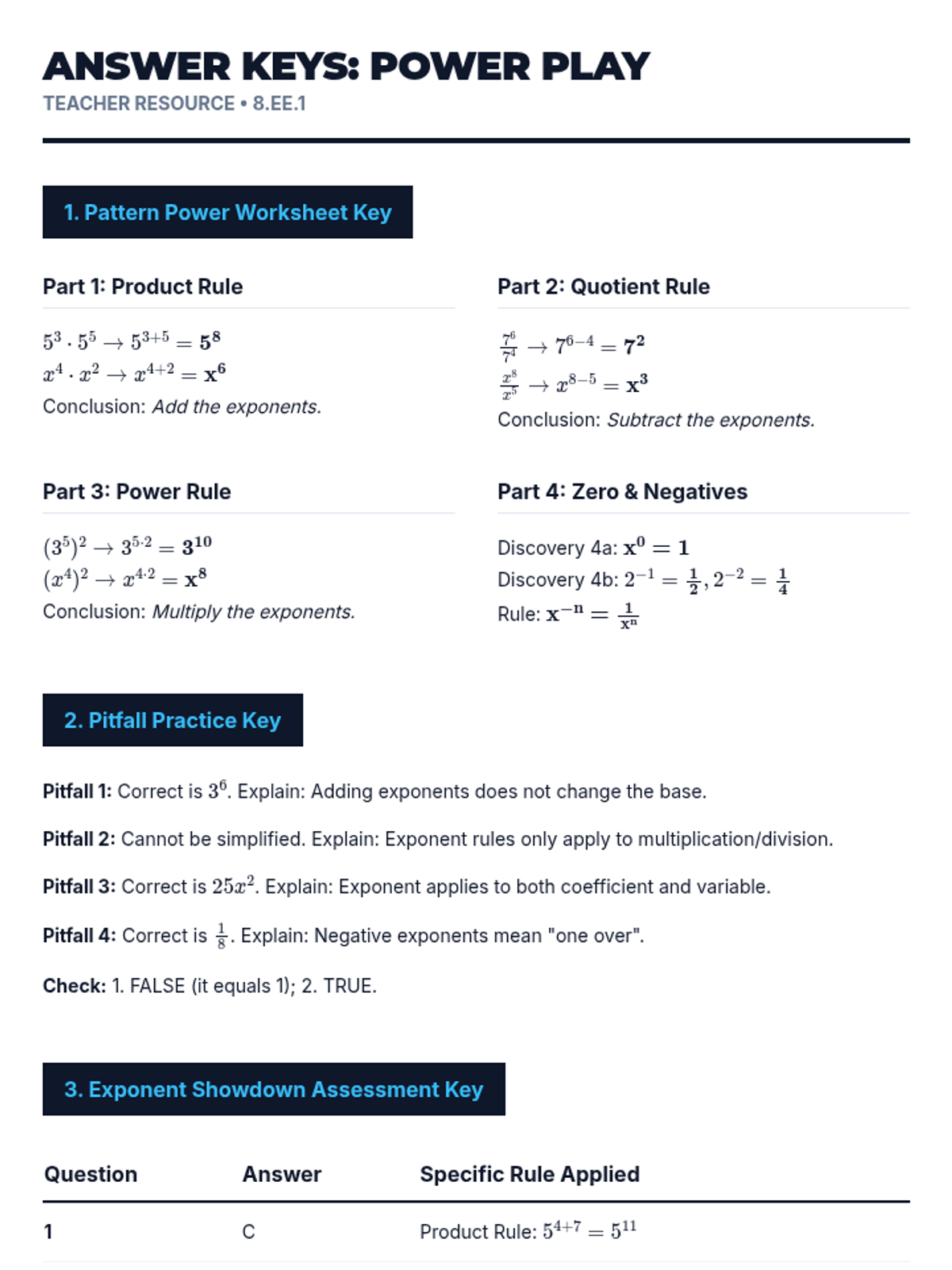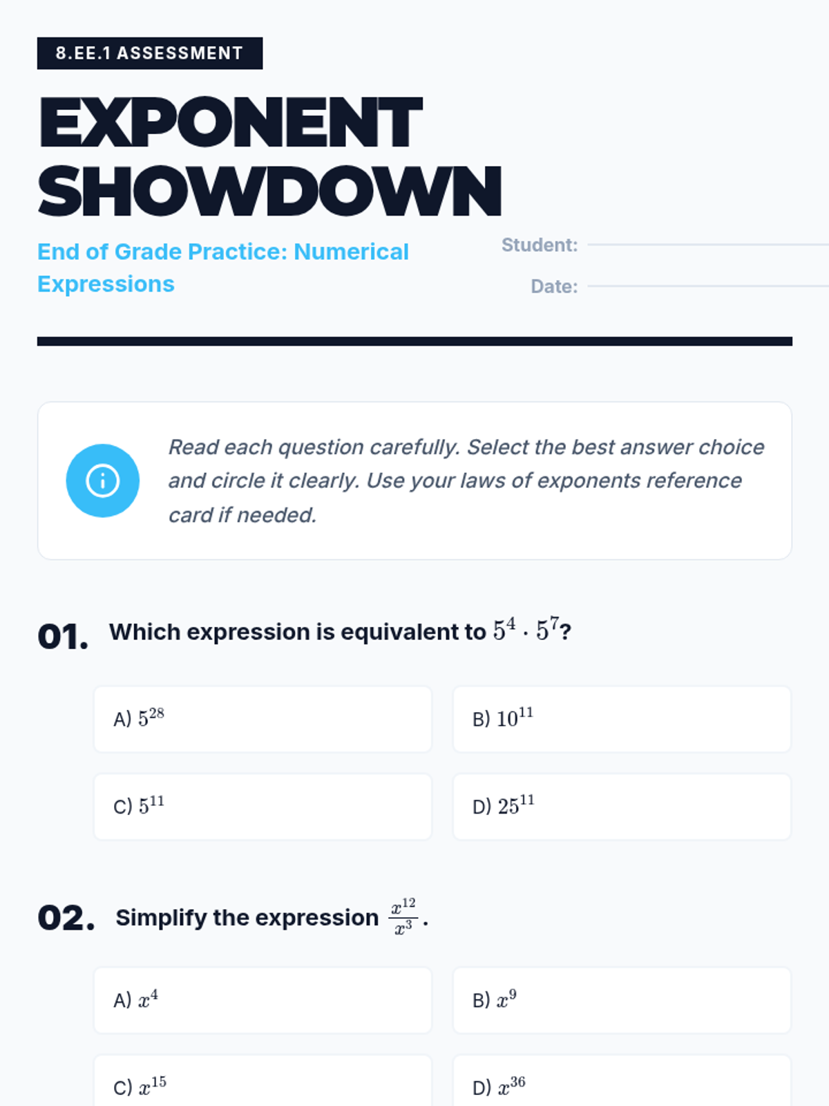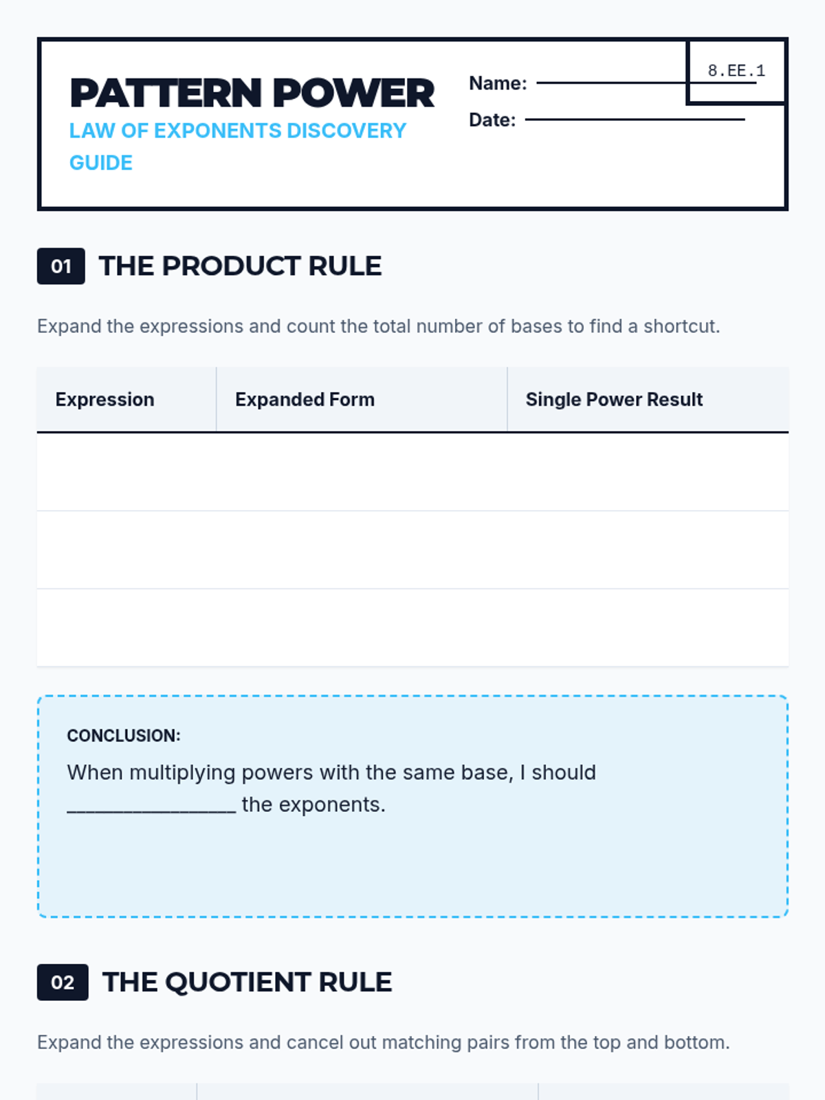 A comprehensive lesson on the laws of exponents where students discover rules through patterns and apply them to simplify numerical expressions. Aligned to NCSCOS 8.EE.1.
