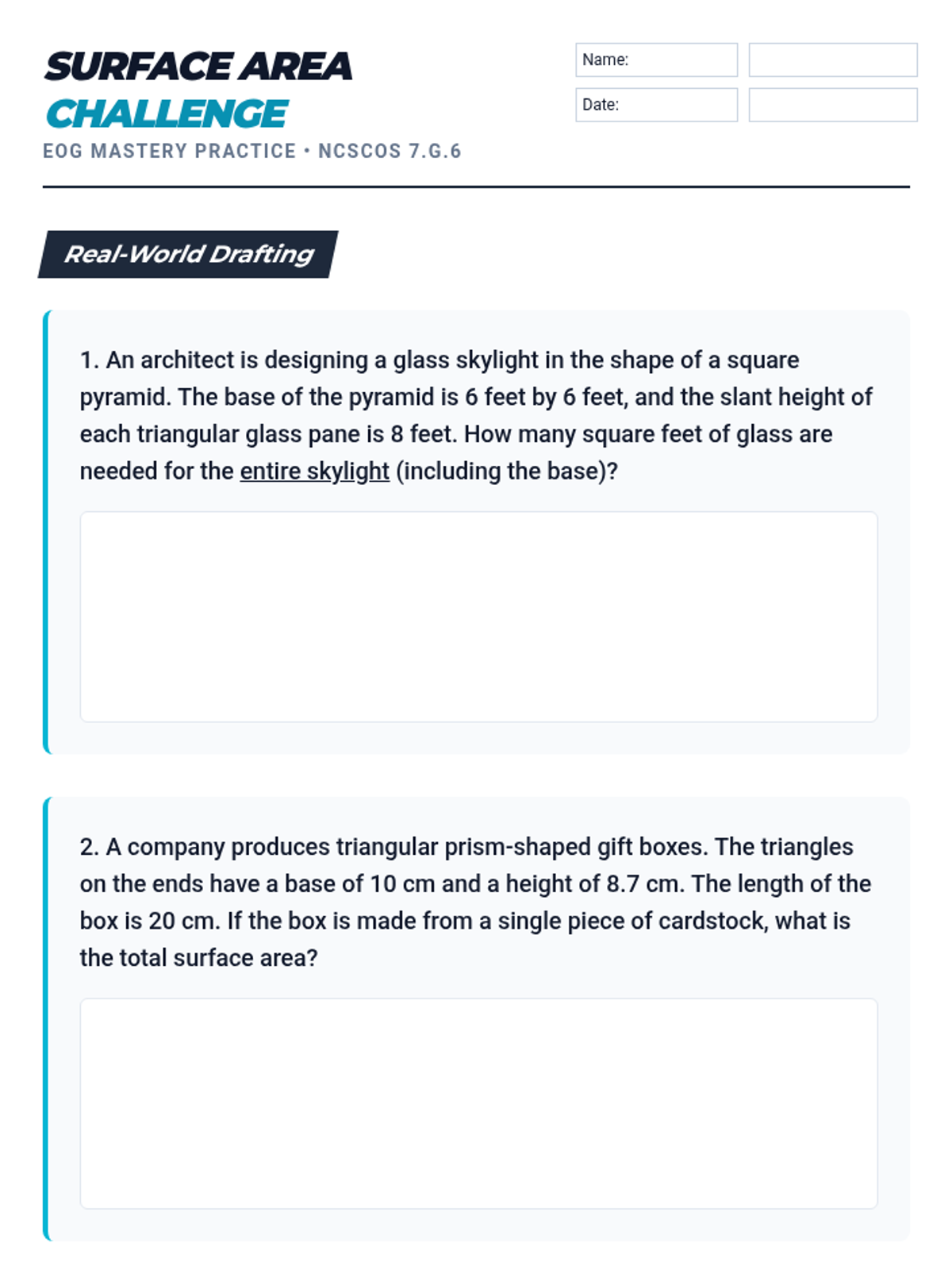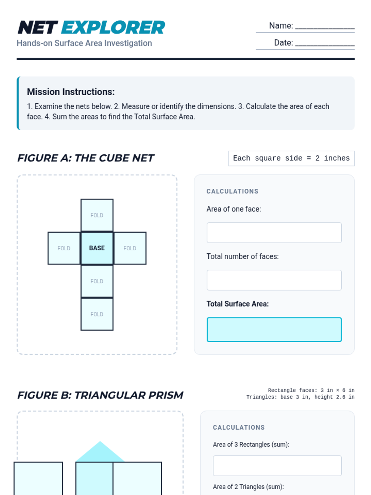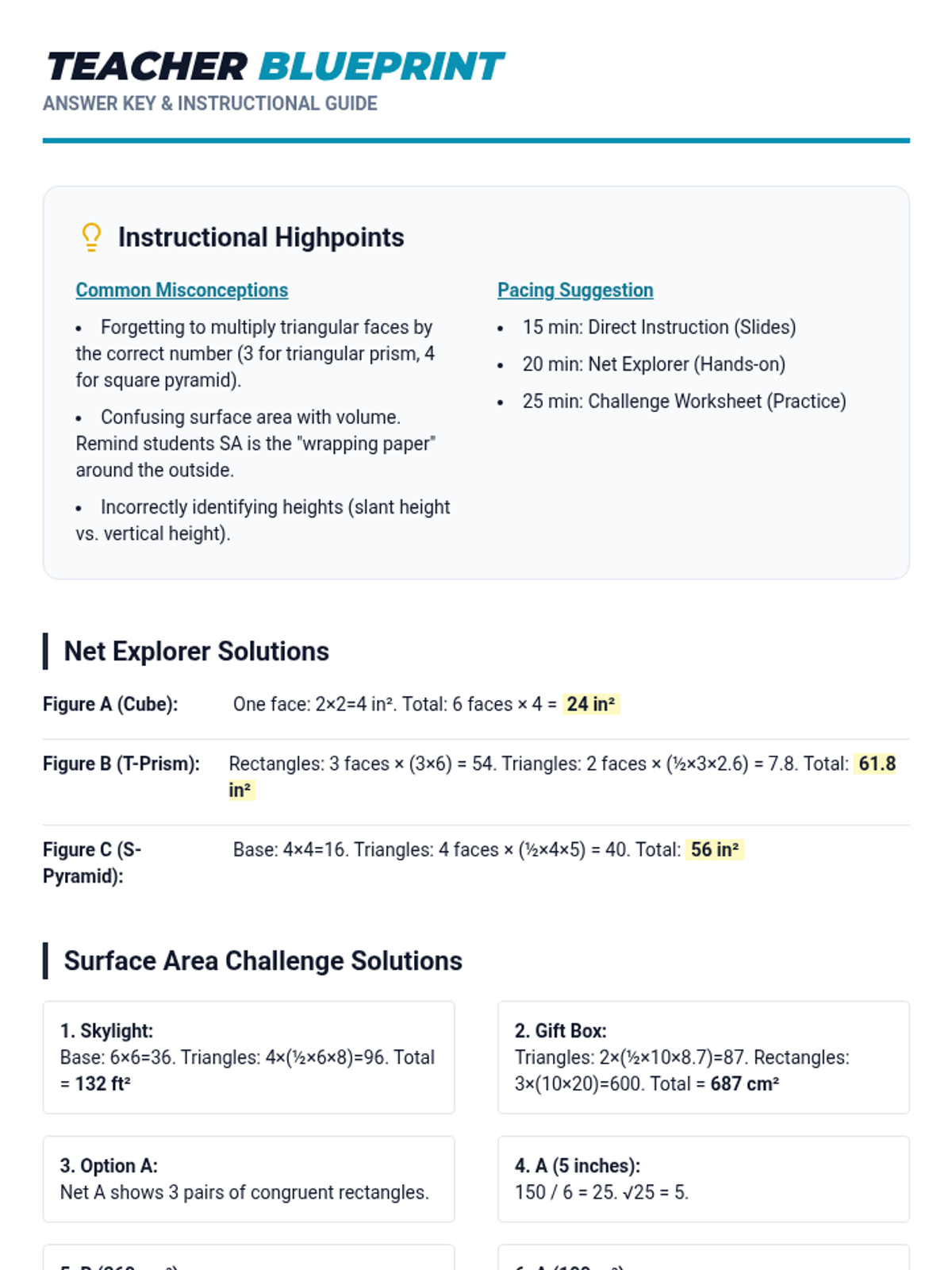 A comprehensive lesson on surface area and nets of 3D figures, focusing on prisms and pyramids through hands-on exploration and EOG-style practice.