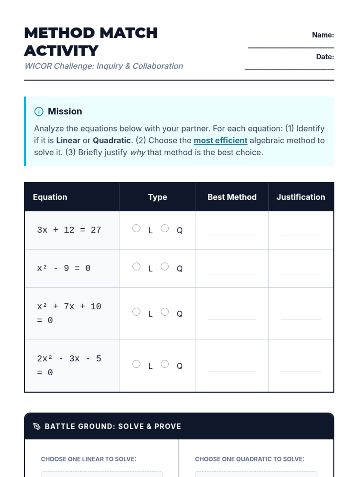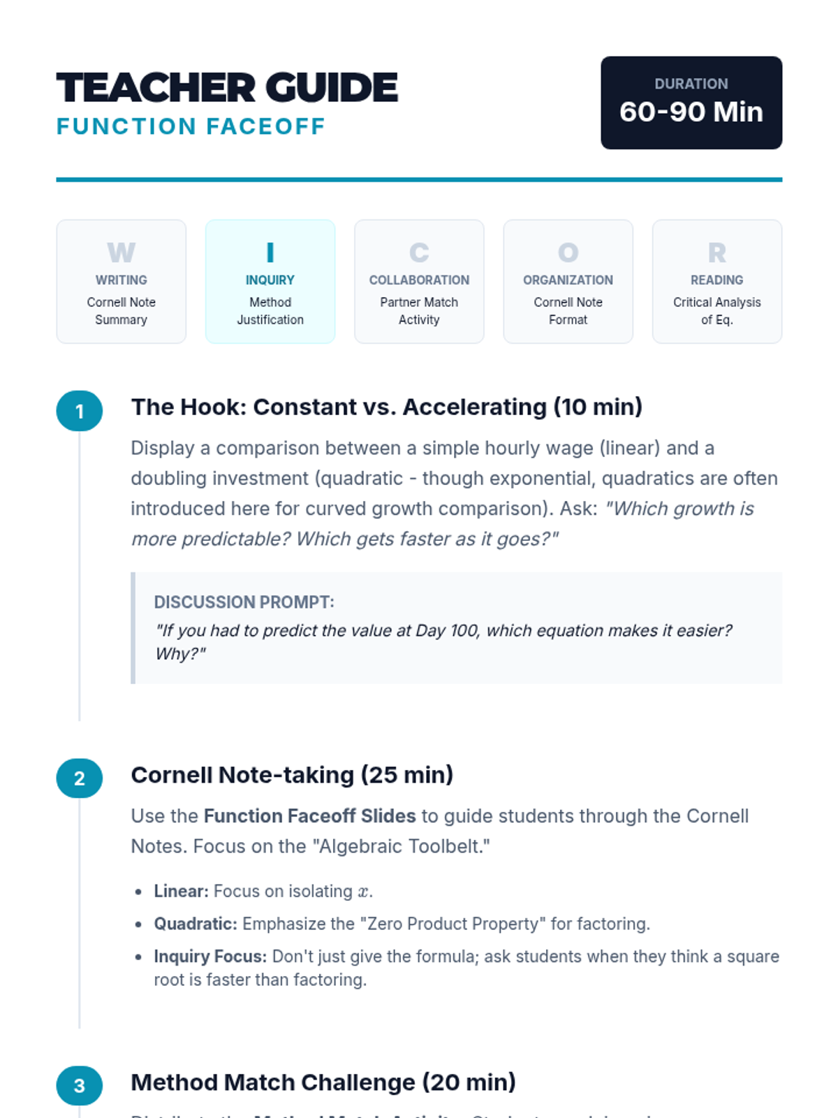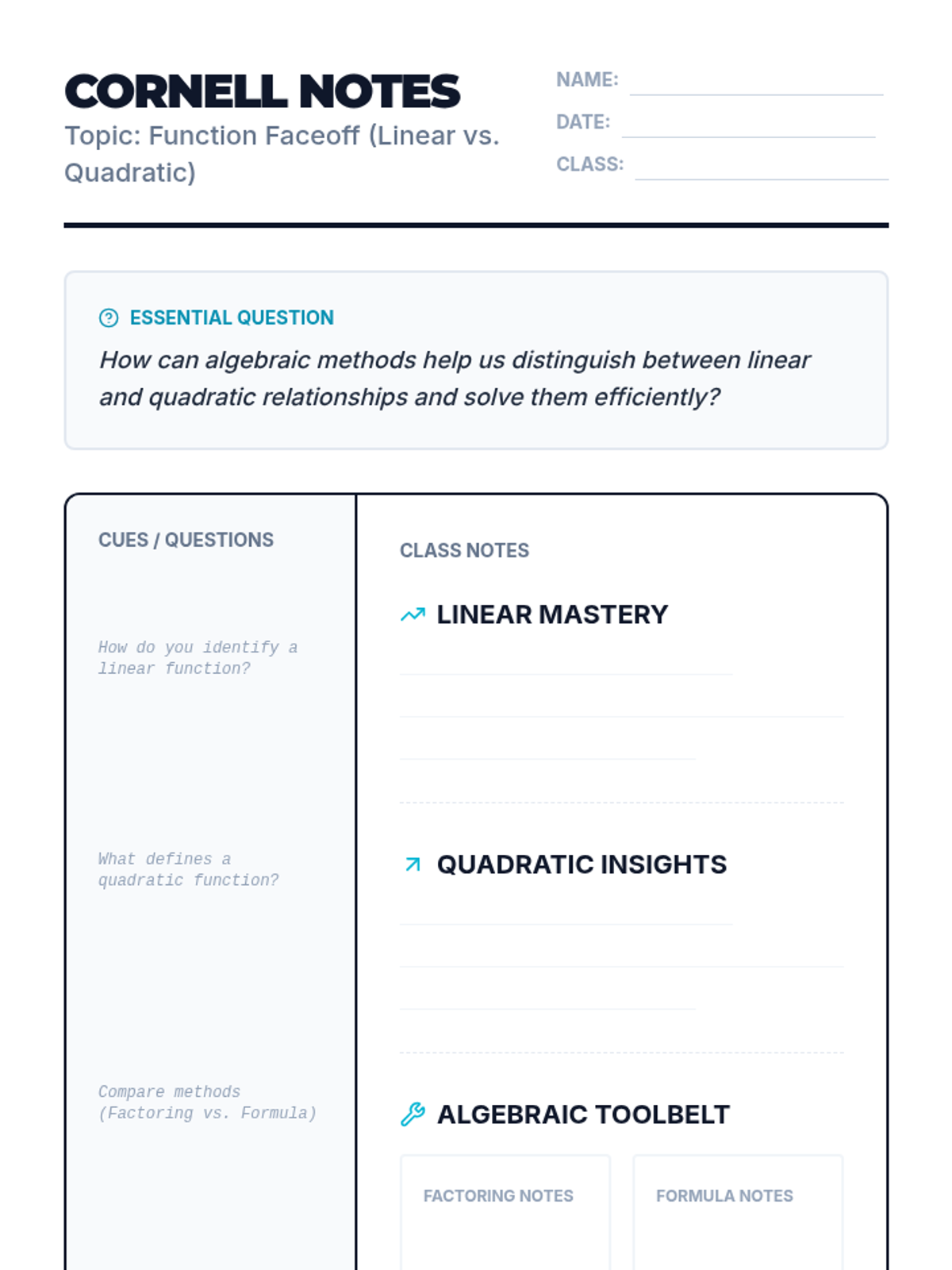 A comprehensive AVID-style lesson comparing linear and quadratic functions through inquiry-based algebraic methods and Cornell Note-taking.