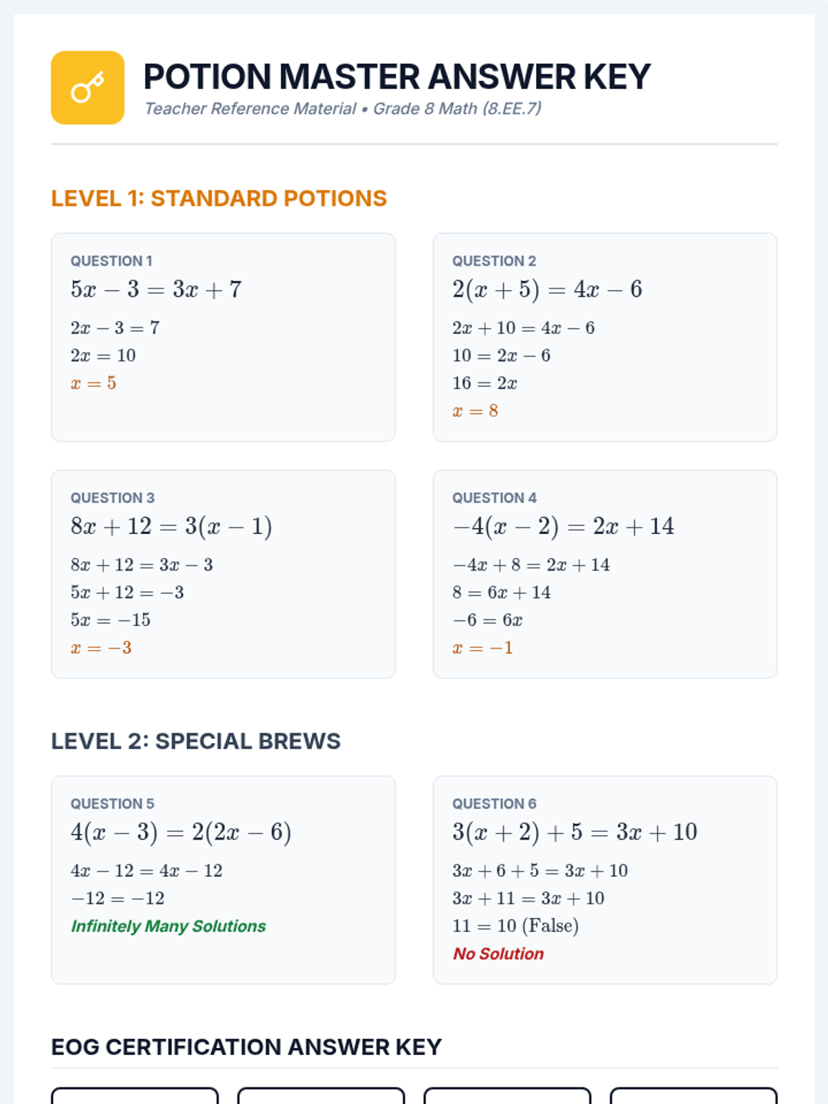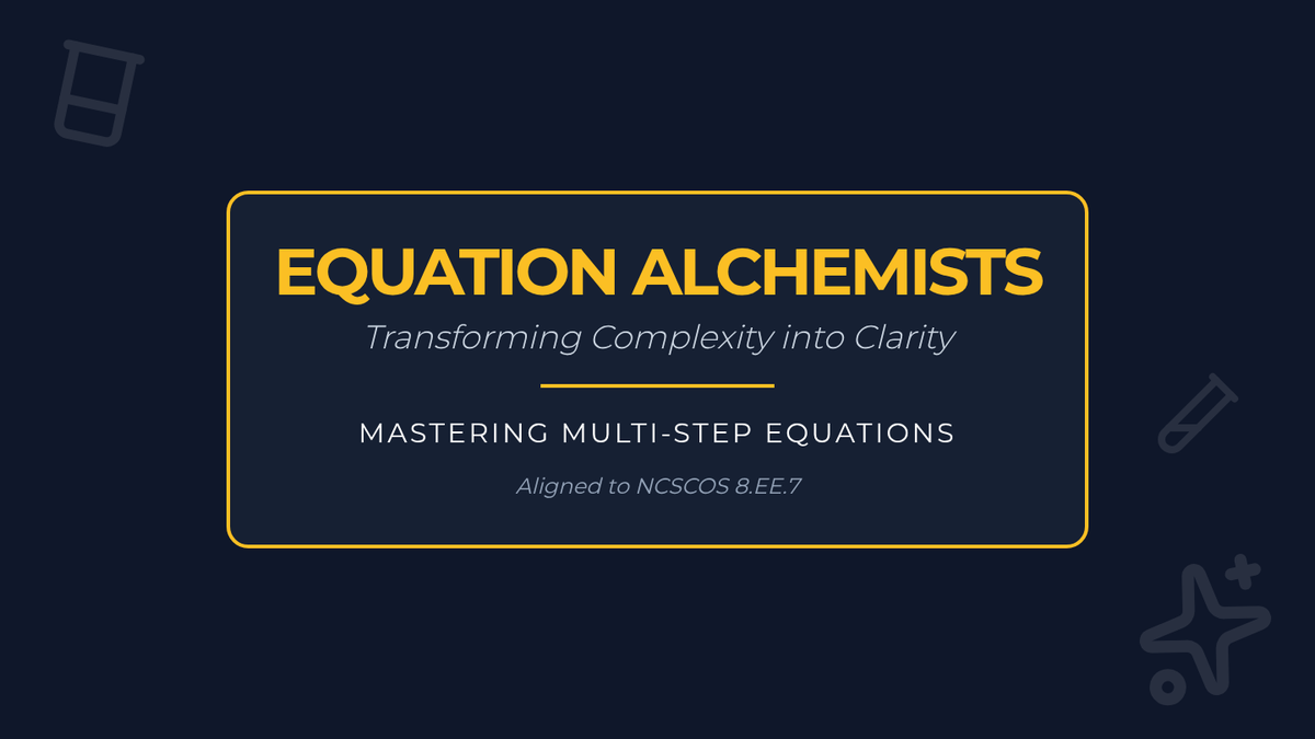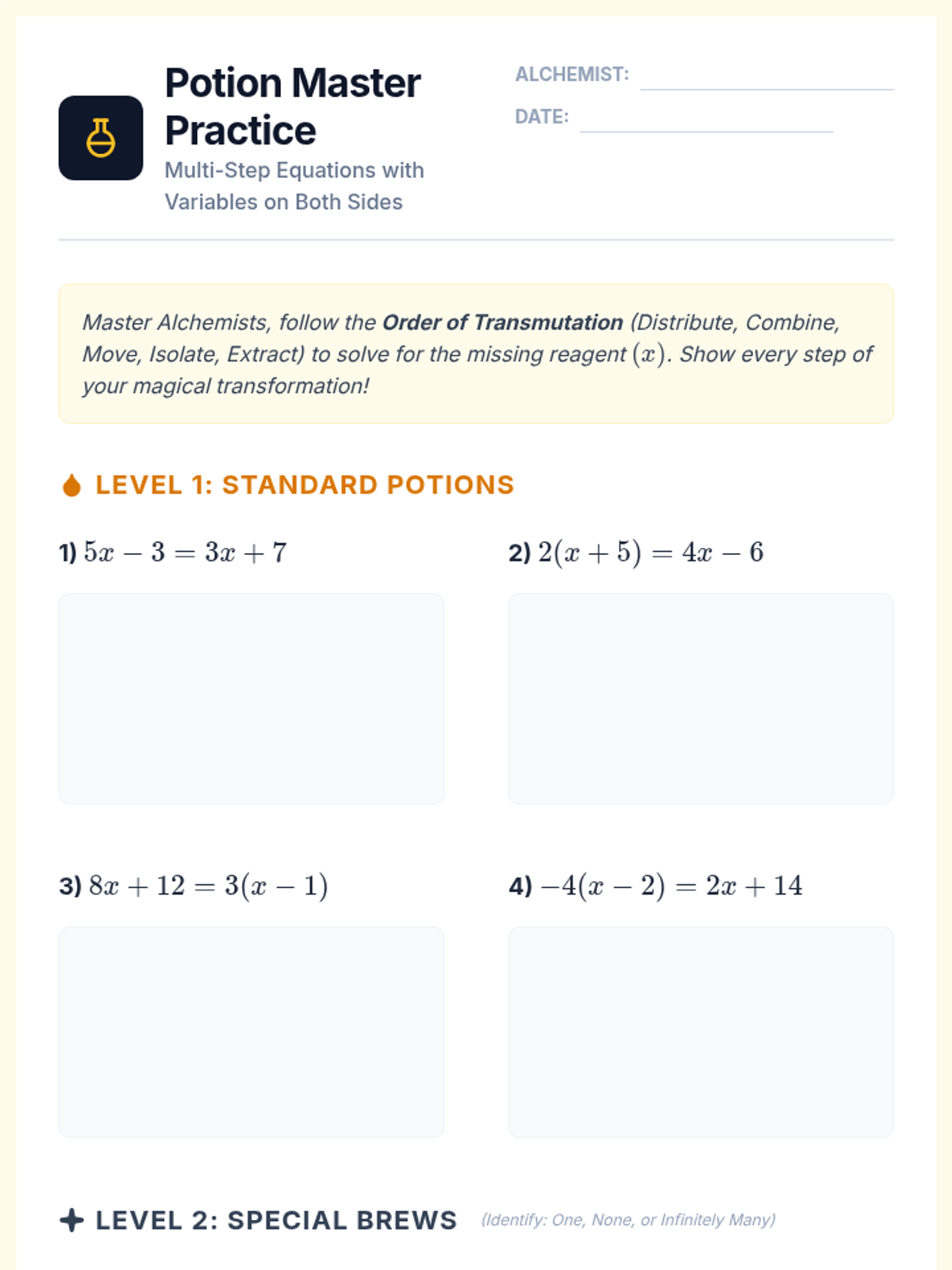 A comprehensive lesson on solving multi-step equations with variables on both sides, featuring a mystical 'Equation Alchemists' theme. Students learn to master distribution, combining like terms, and handling variables on both sides of the equal sign.