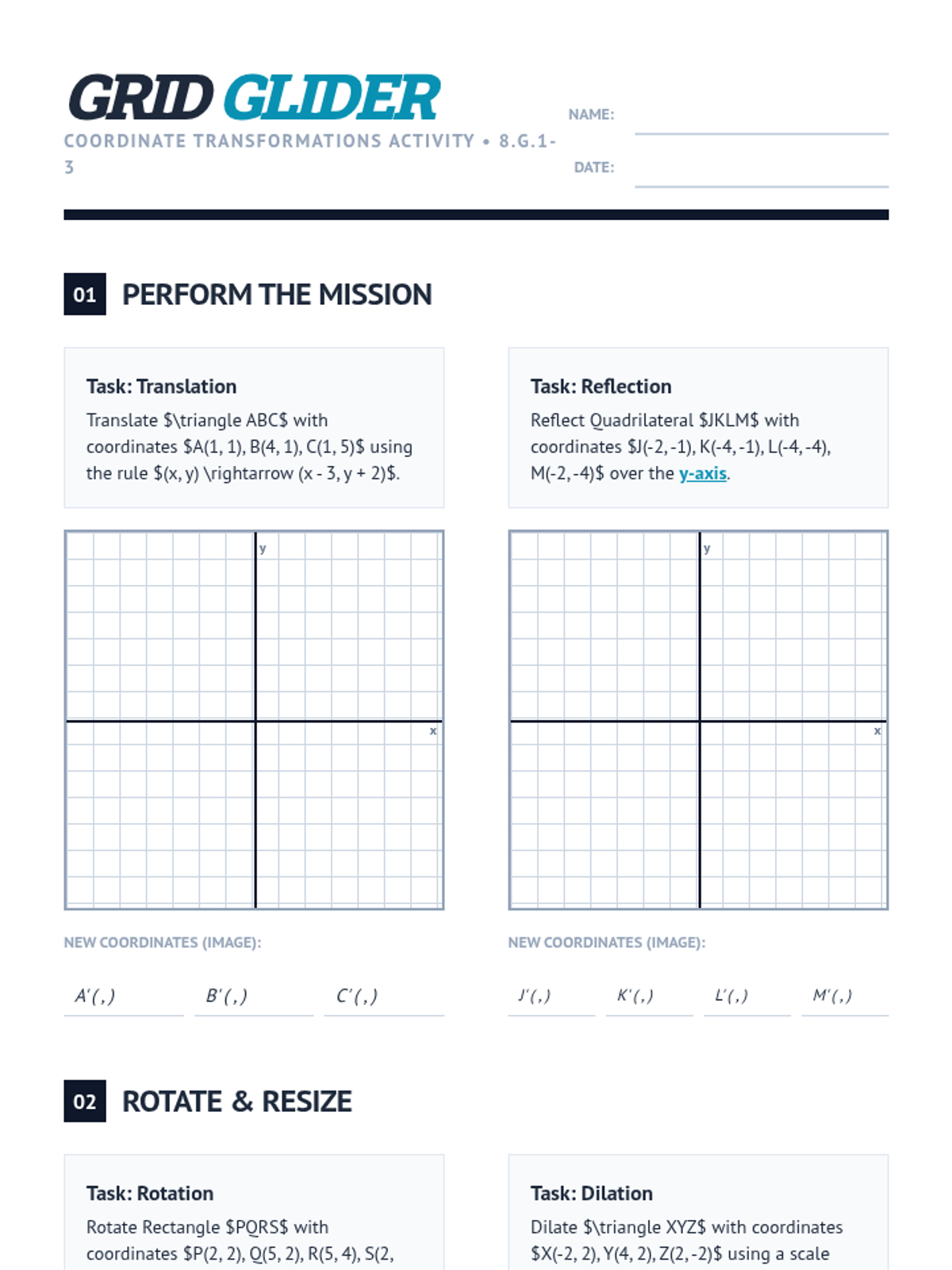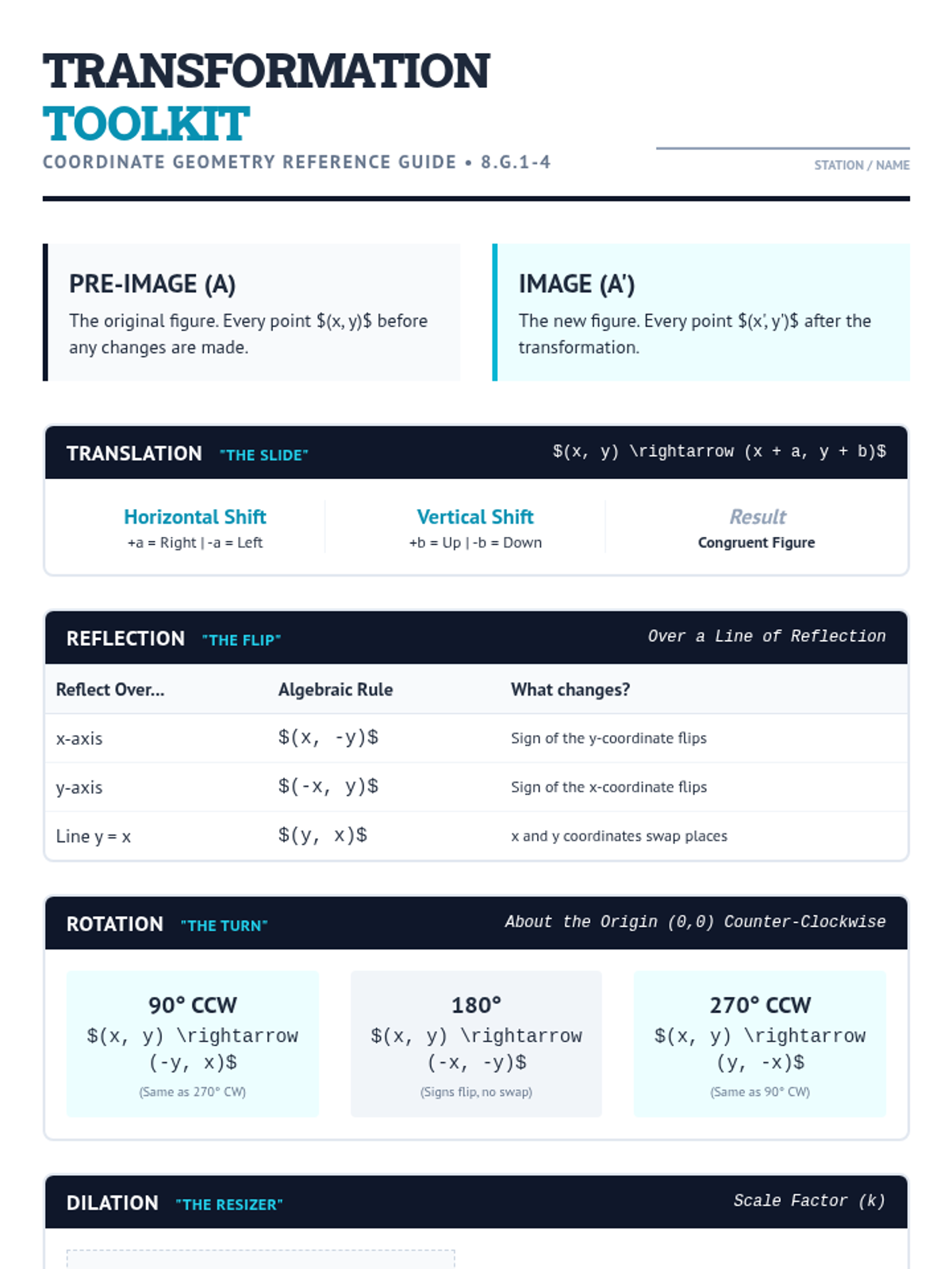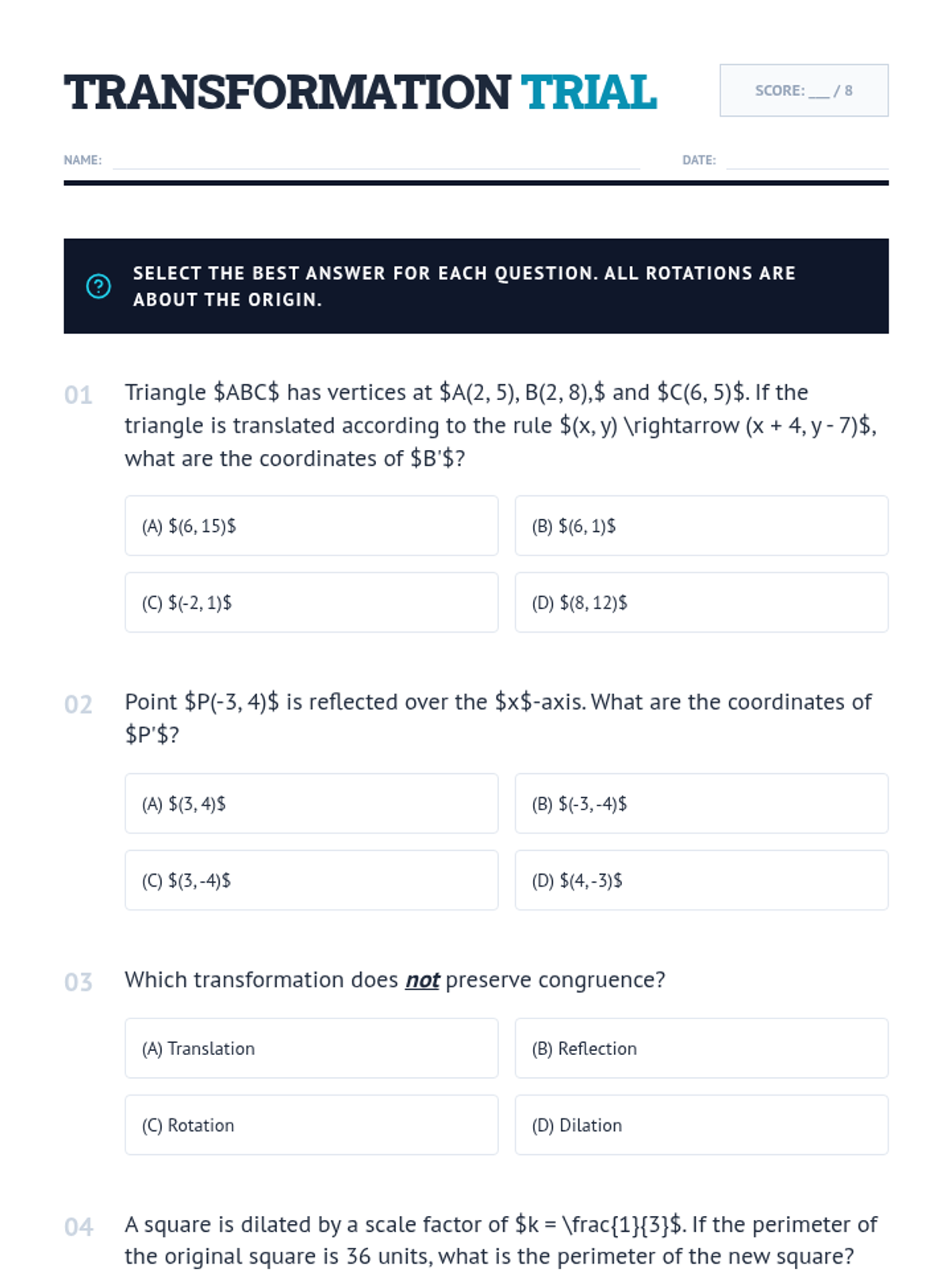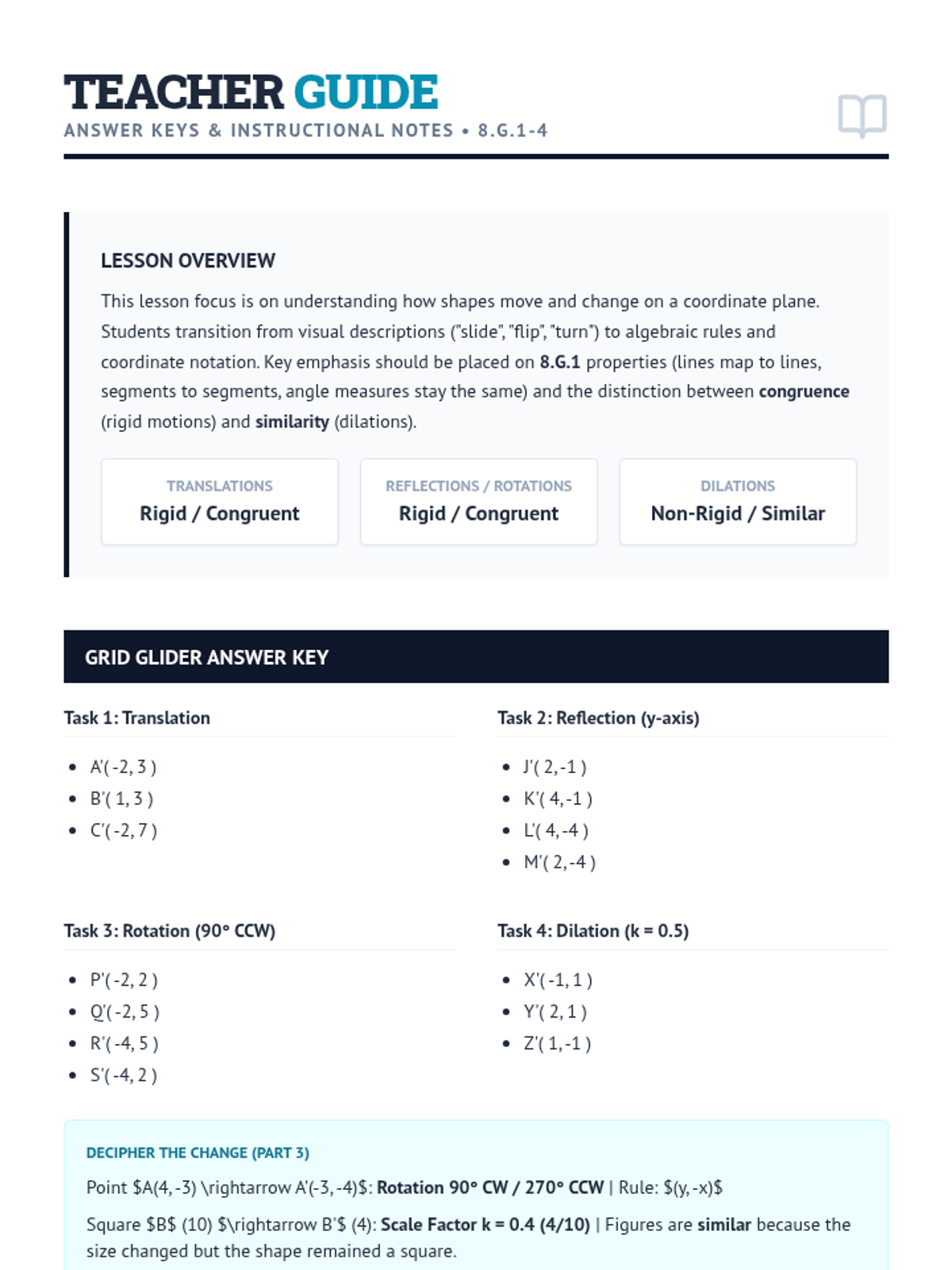 This lesson covers the four types of geometric transformations: translations, reflections, rotations, and dilations. Students will learn to perform these transformations on a coordinate plane, describe them using algebraic notation, and distinguish between congruent and similar figures.