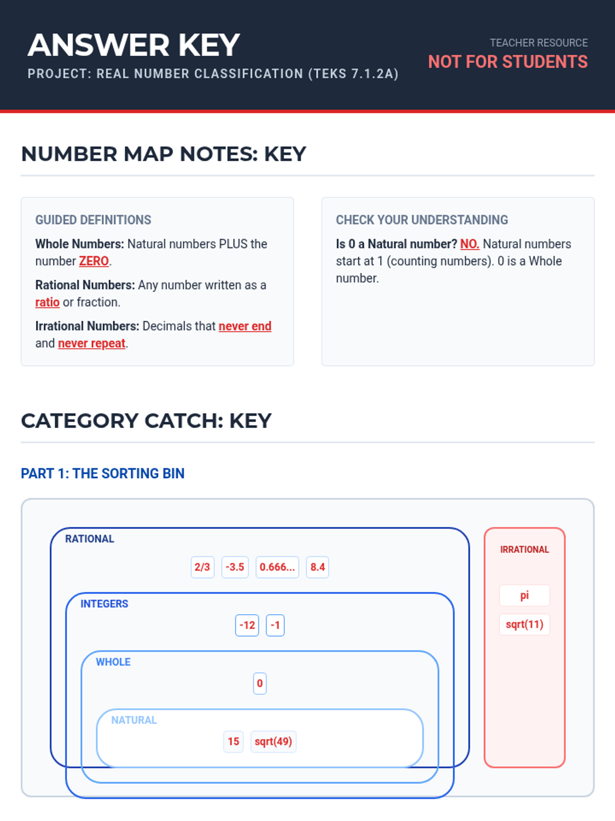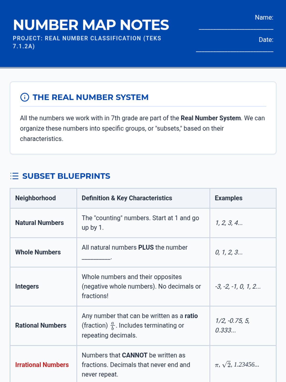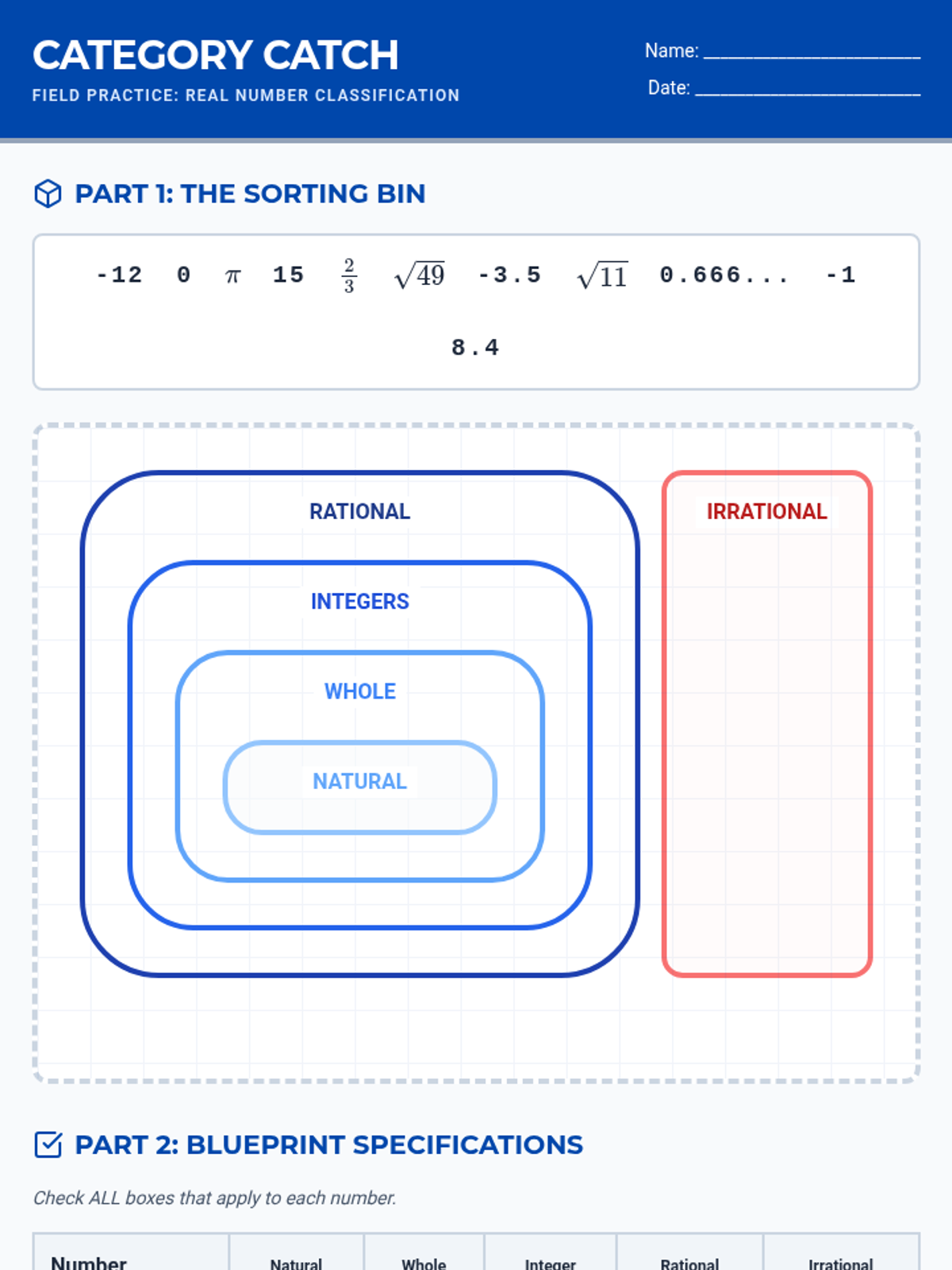 Students will learn to classify and place real numbers into their appropriate subsets: Natural, Whole, Integers, Rational, and Irrational numbers, using a Venn diagram model.