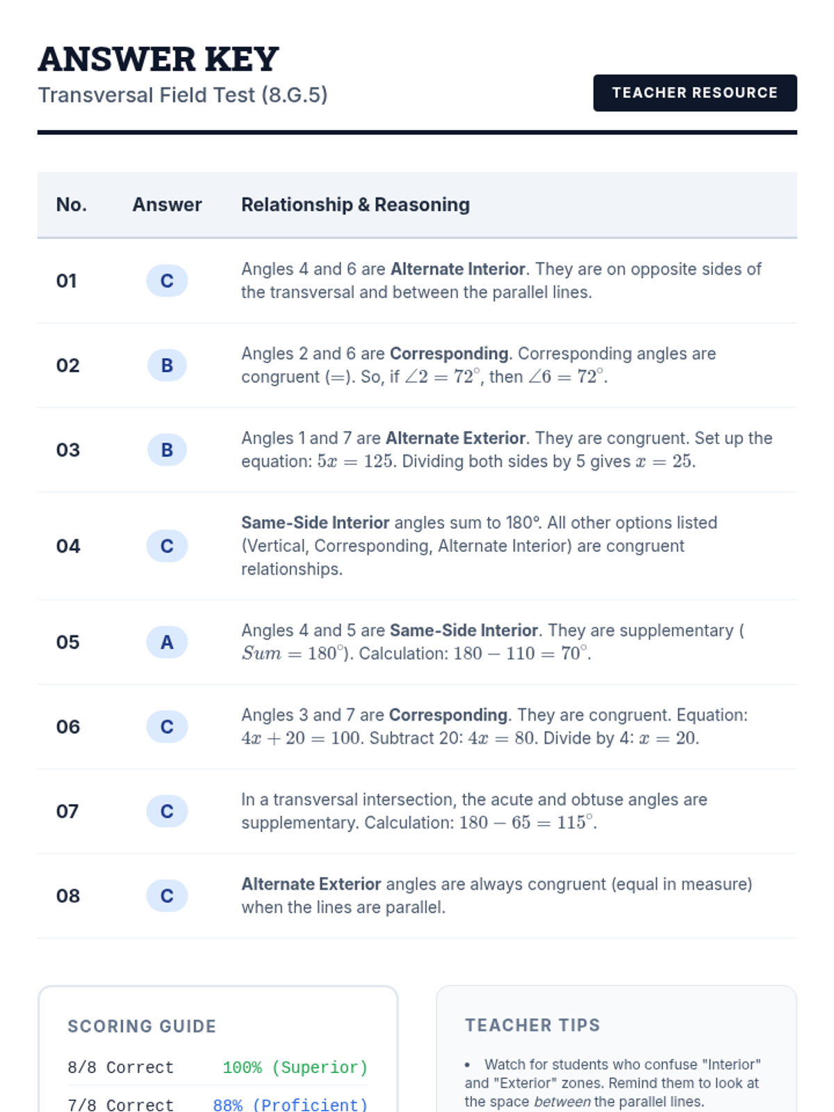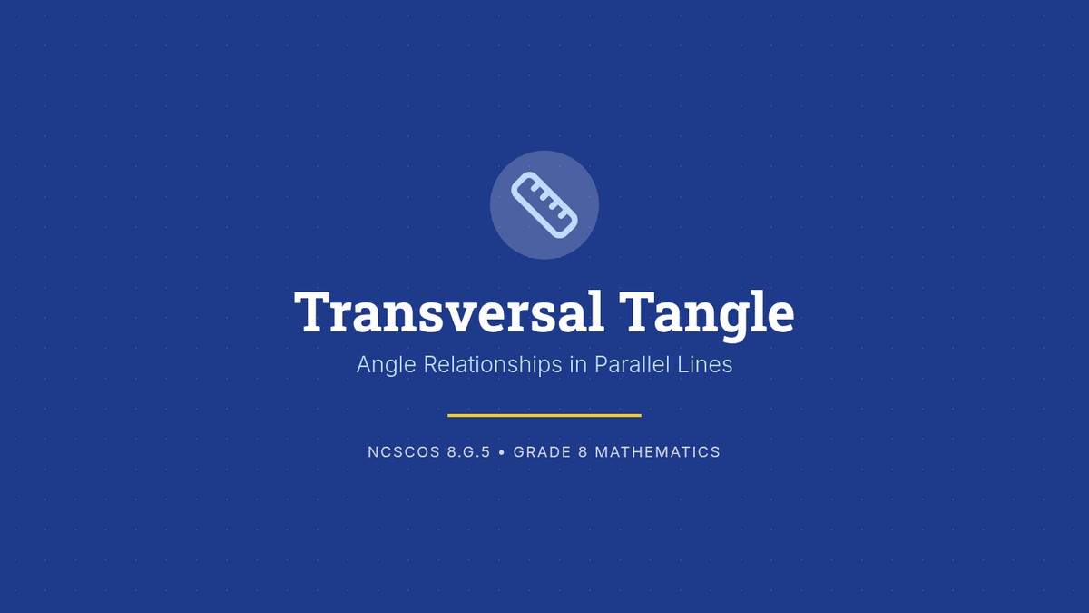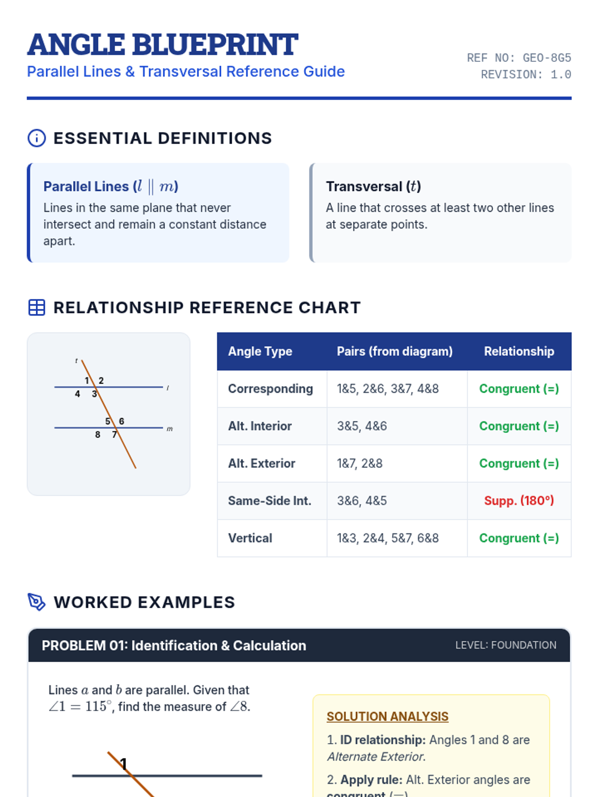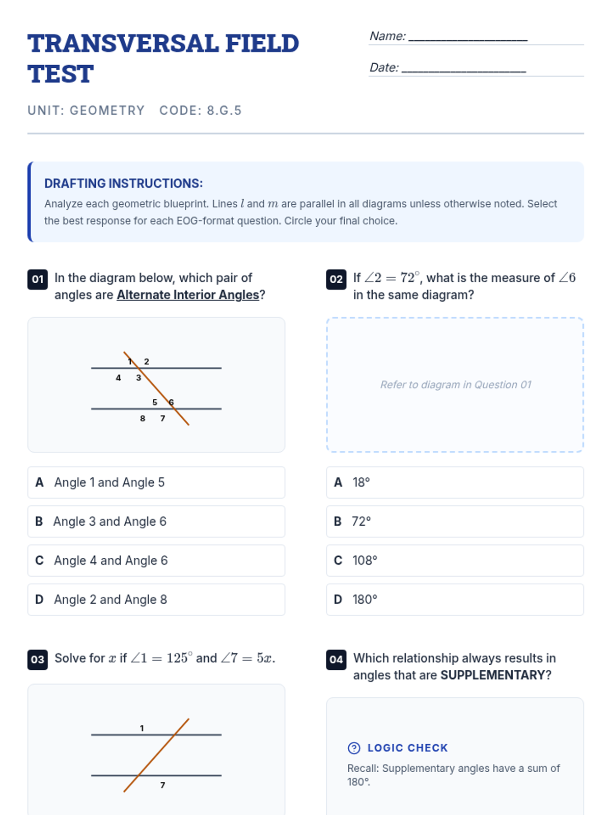 A comprehensive lesson on angle relationships created by parallel lines and a transversal, featuring a blueprint-themed instructional guide and EOG-style practice.