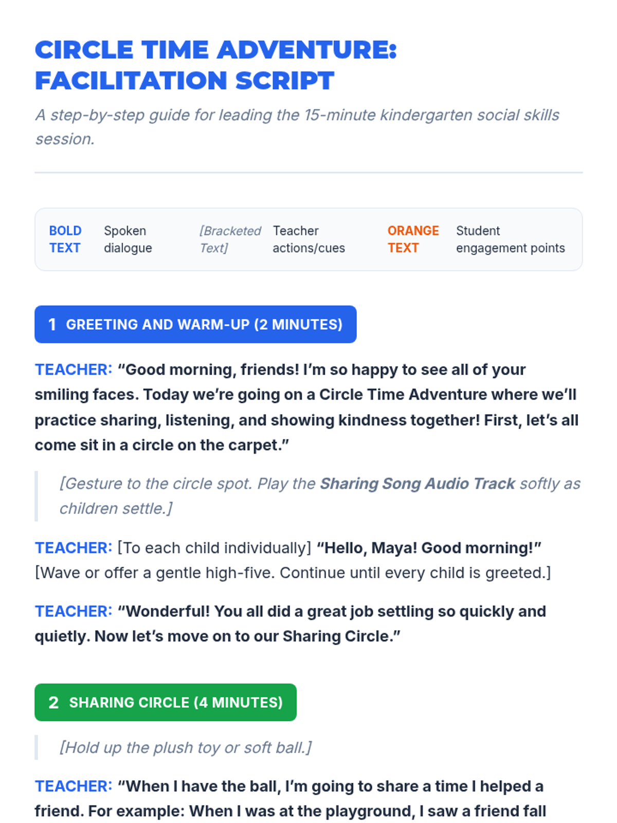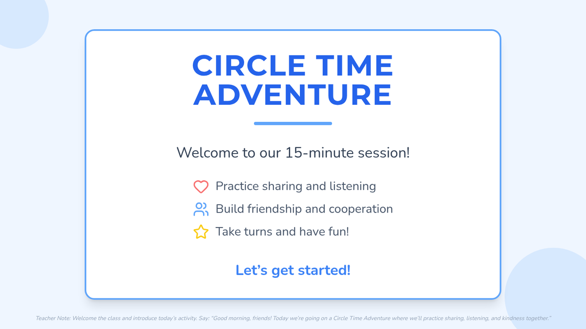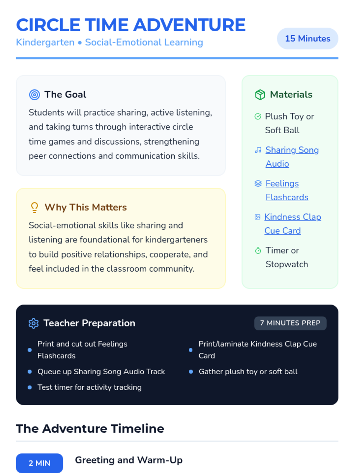 A 15-minute kindergarten group session focused on social-emotional skills like sharing, active listening, and taking turns through interactive games and community building.