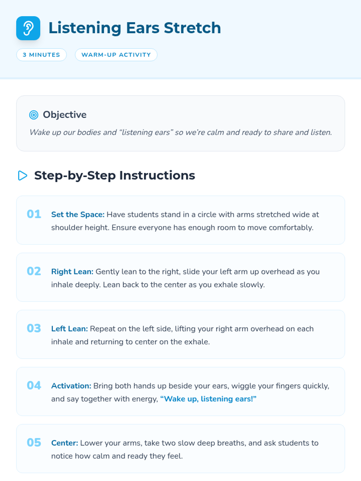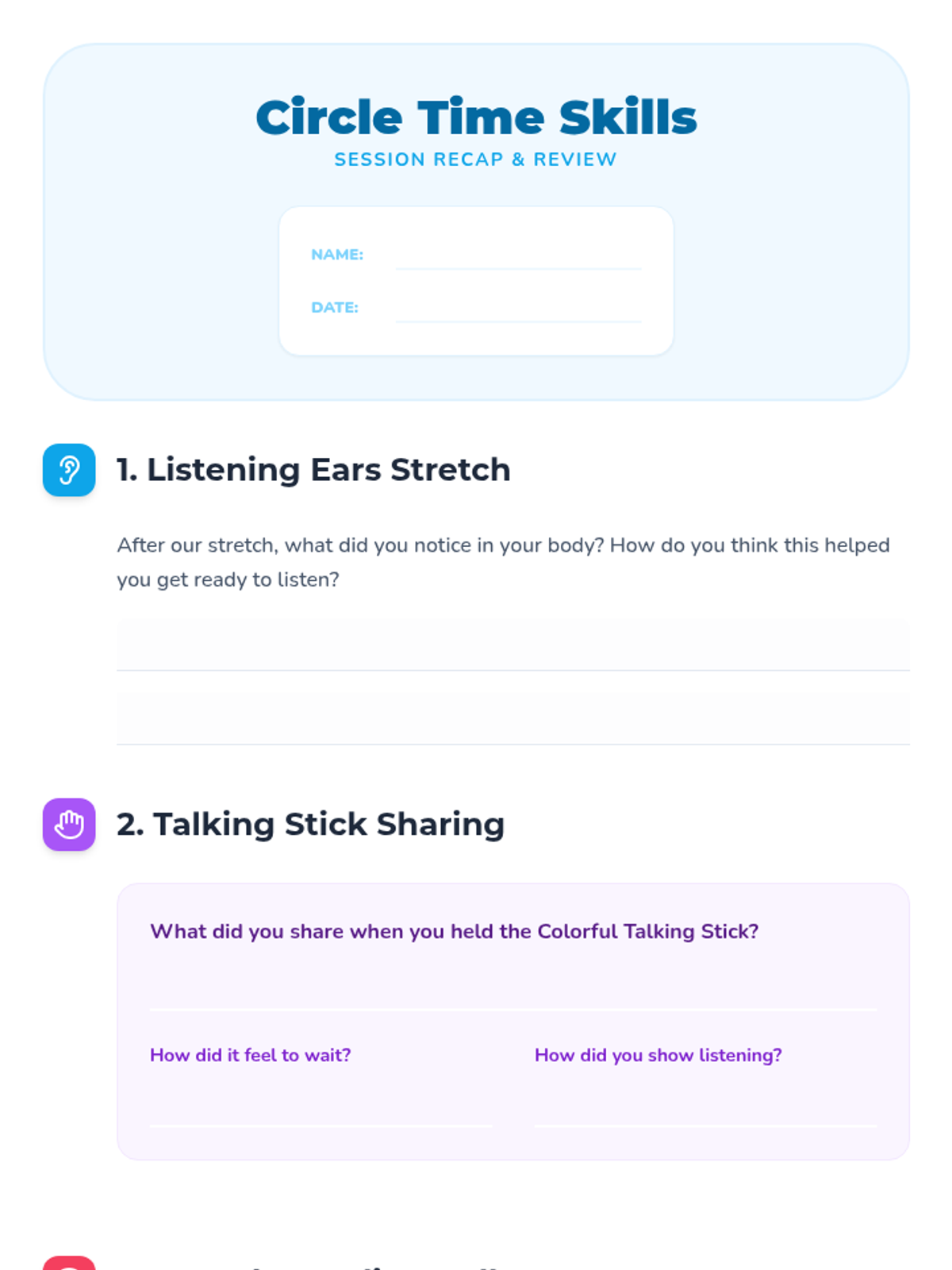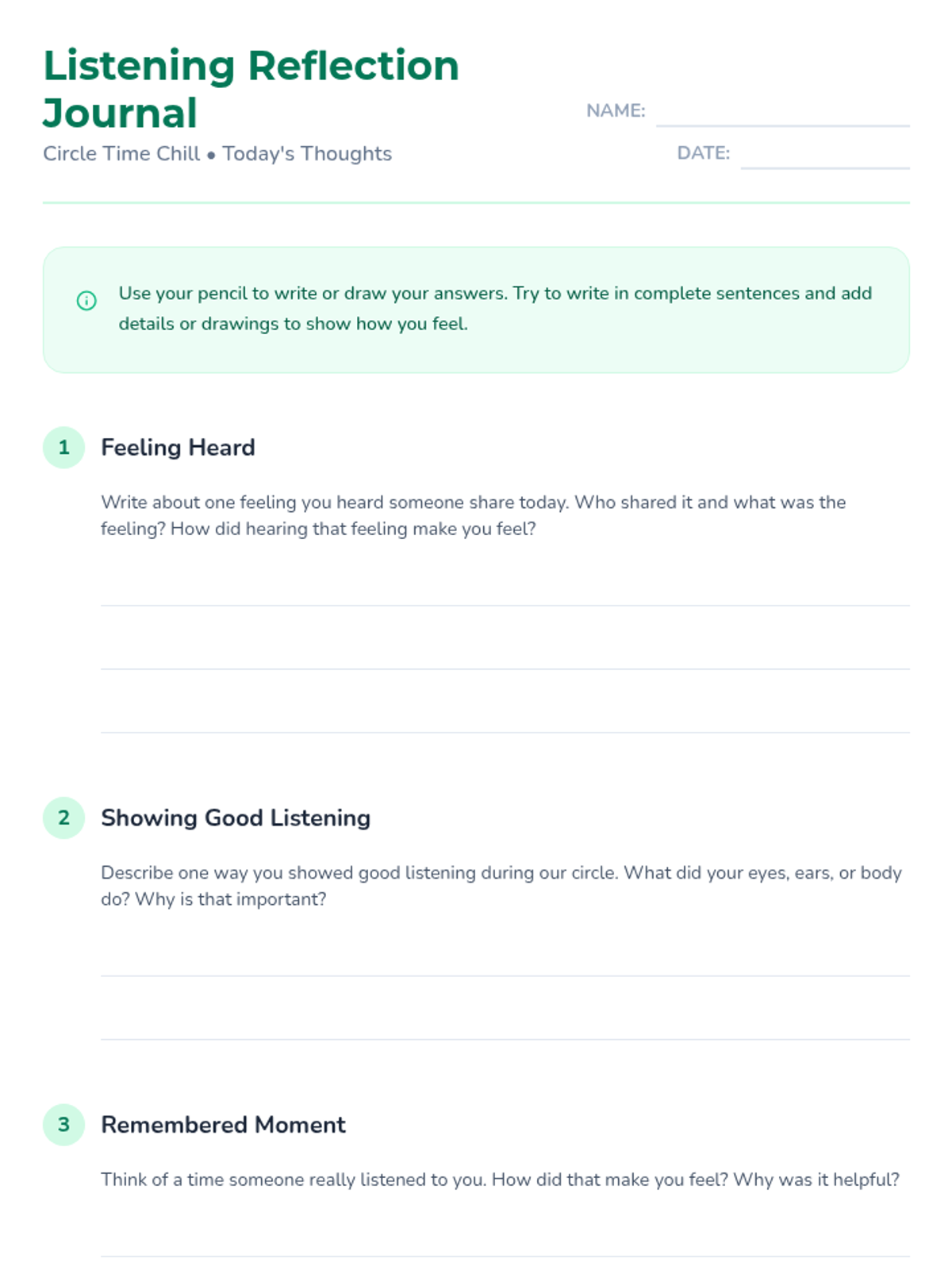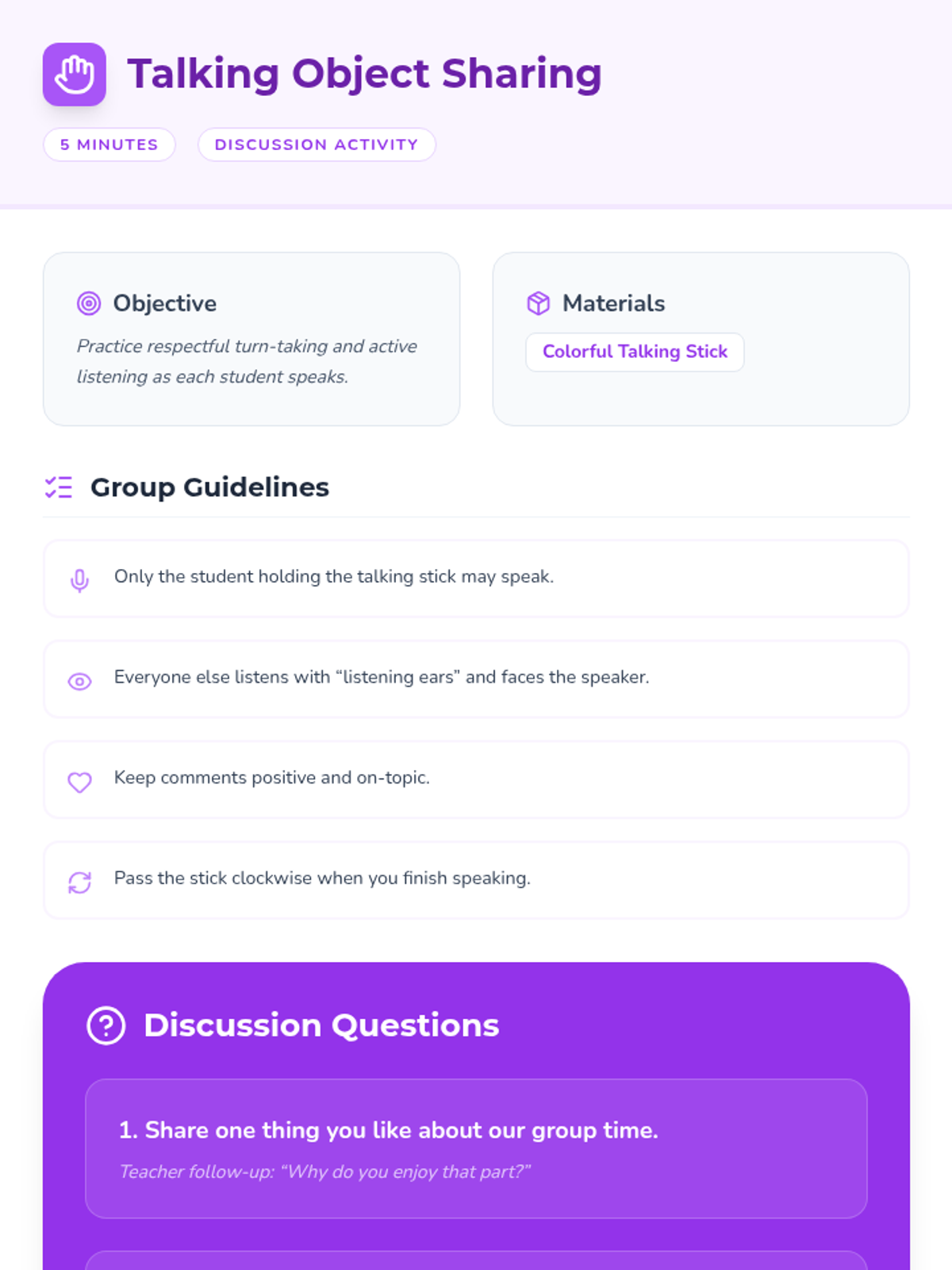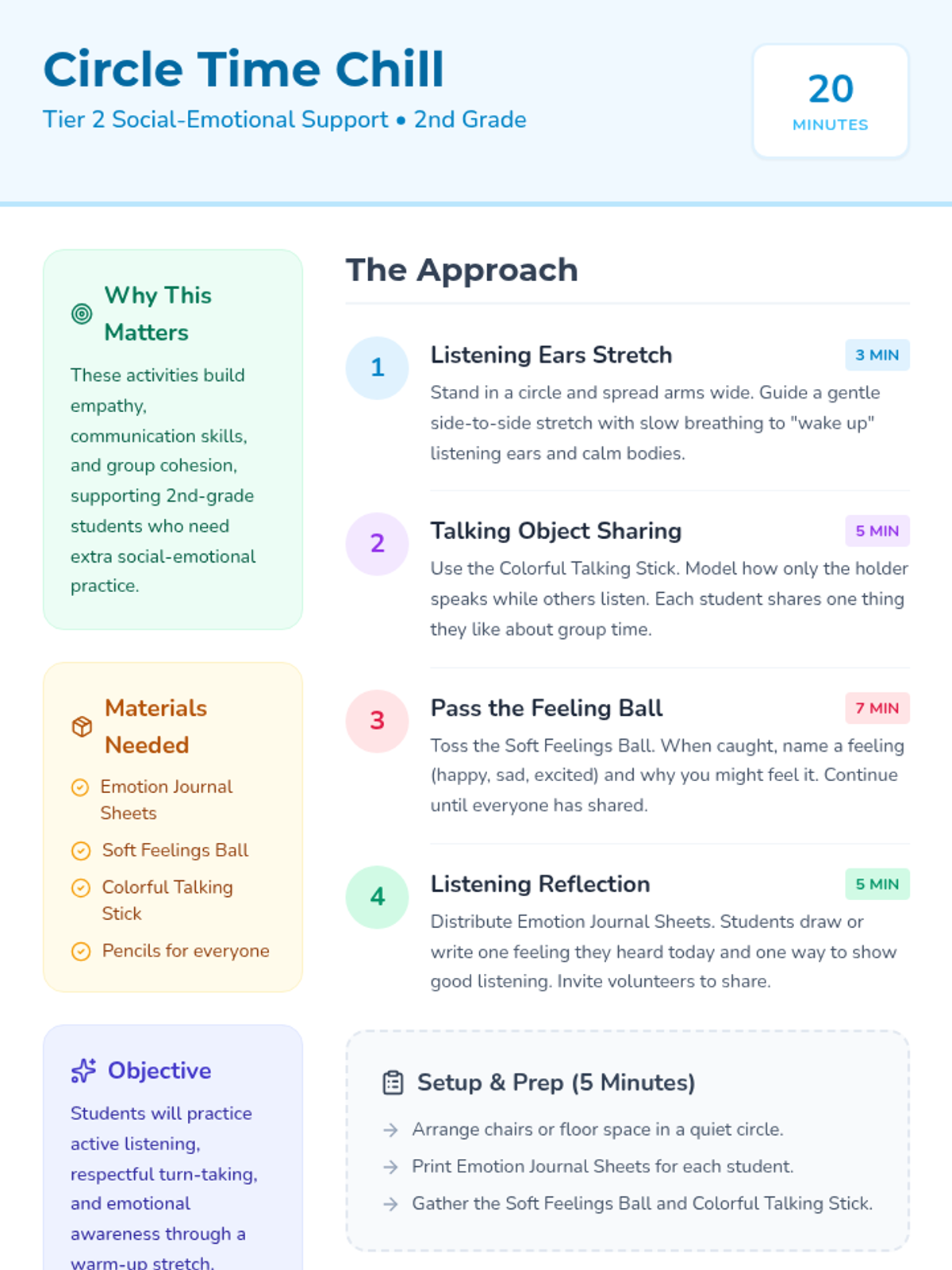 A 20-minute Tier 2 small-group session for 2nd graders focused on active listening, respectful turn-taking, and emotional awareness through structured circle activities.