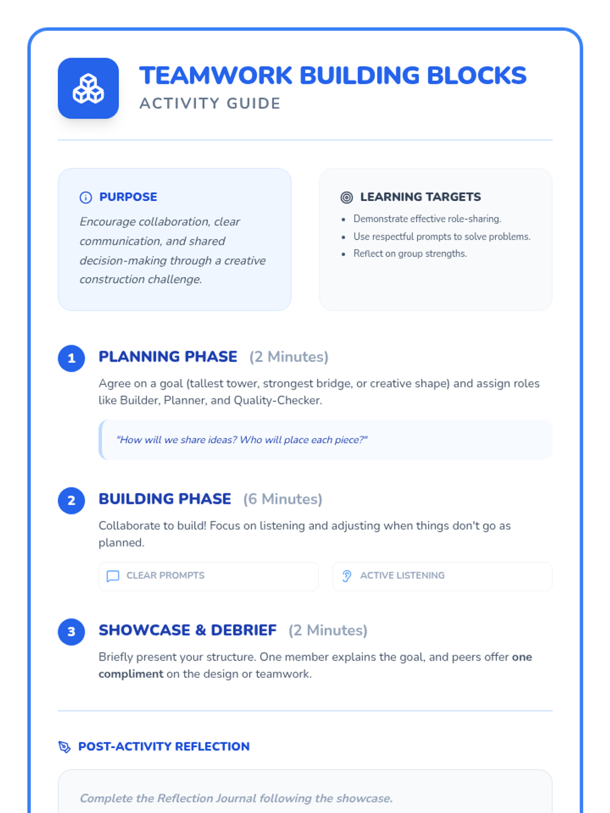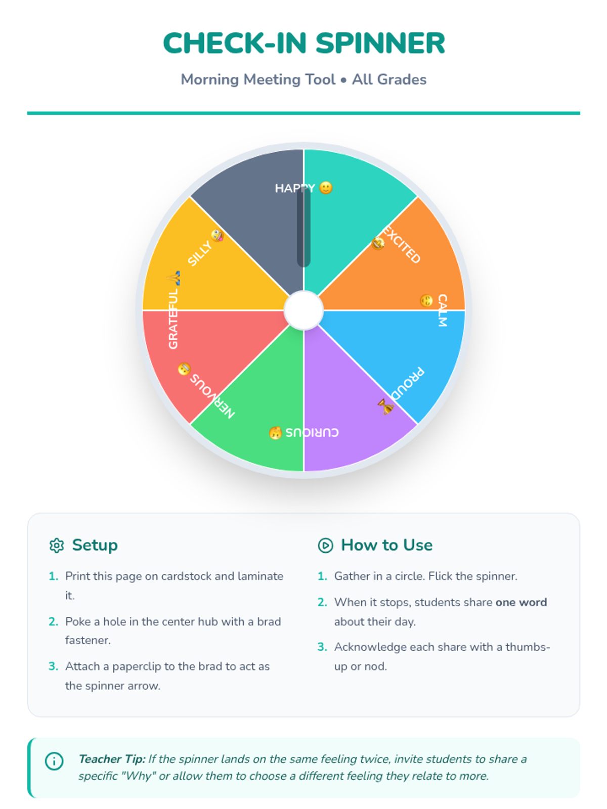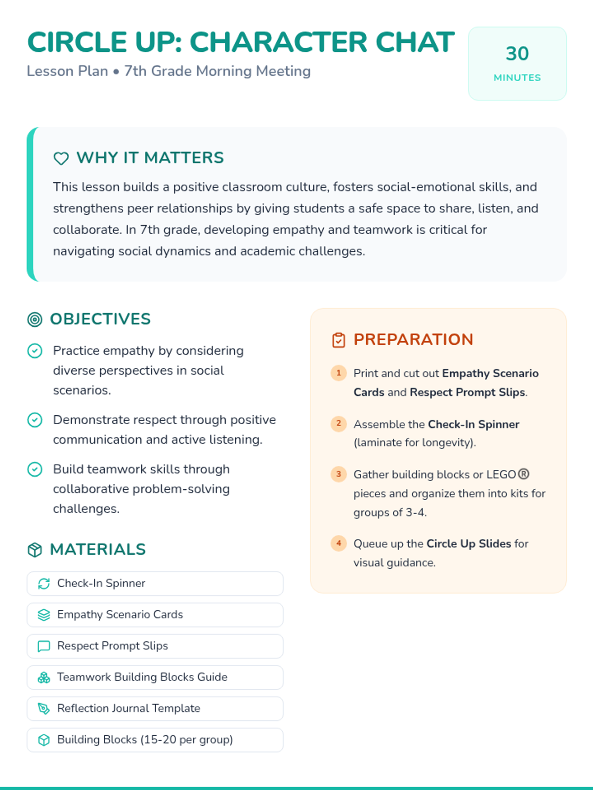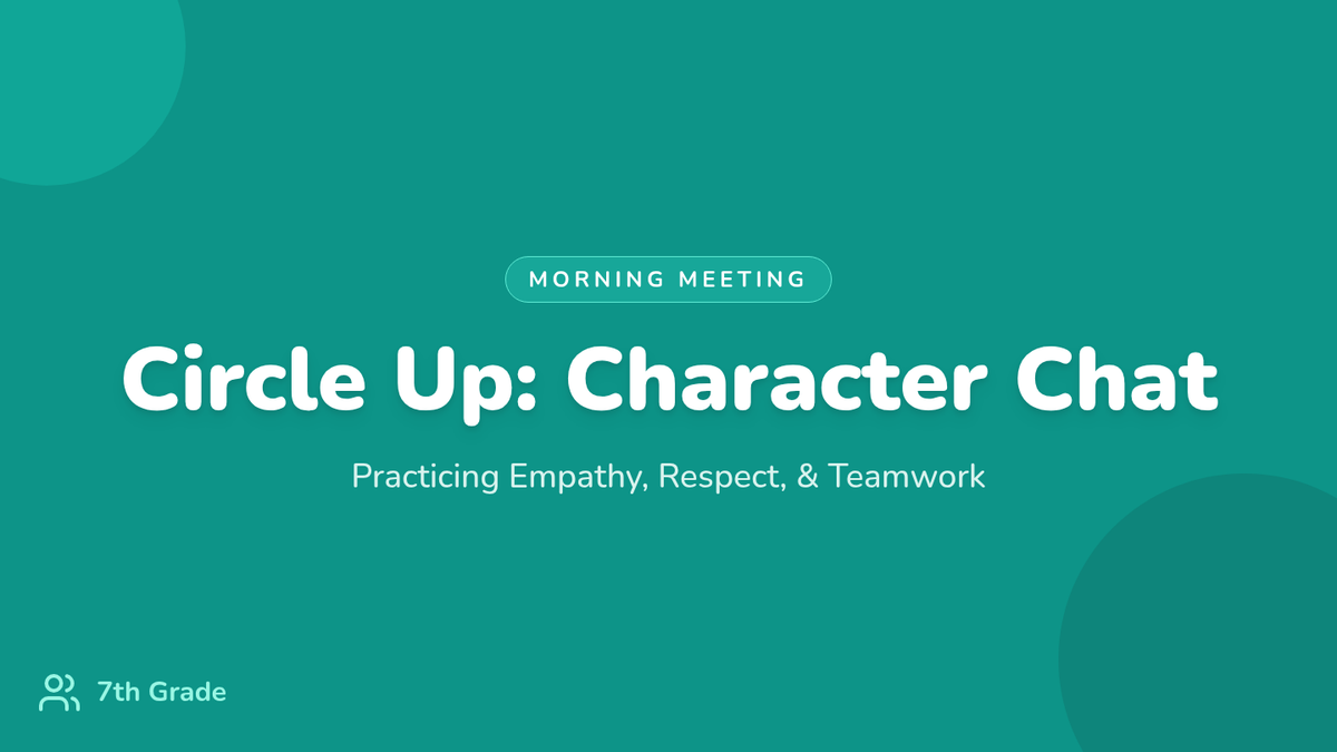 A 30-minute 7th grade morning meeting focused on social-emotional learning and character building through check-ins, guided discussions, and teamwork activities.