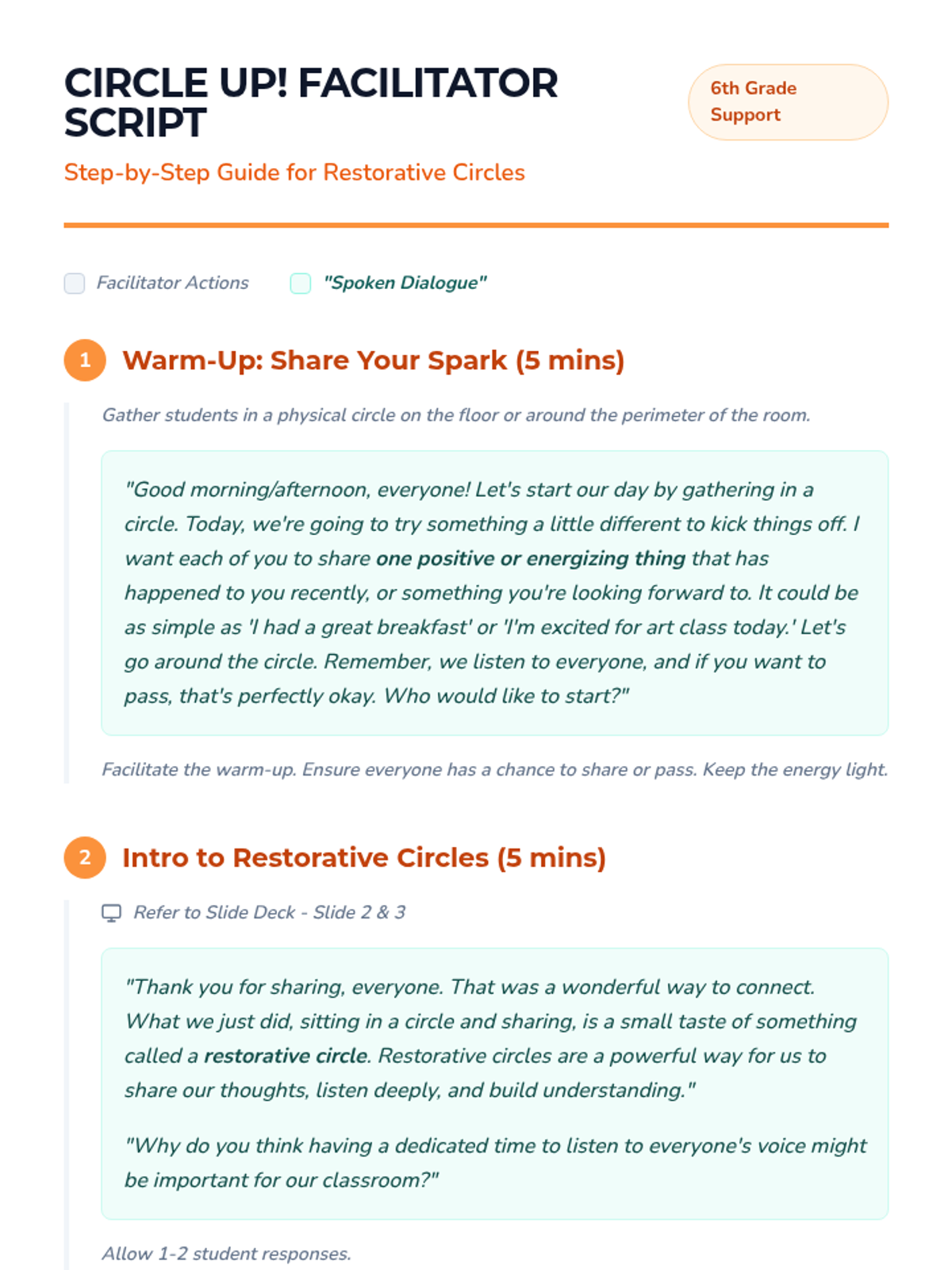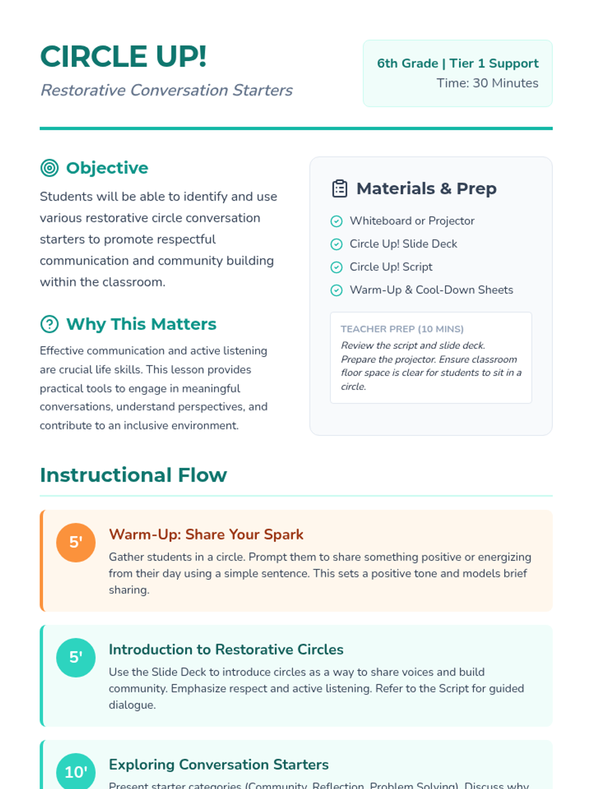 This lesson introduces 6th-grade students to restorative circle conversation starters, fostering a positive classroom community and enhancing communication skills. Students learn to respectfully share and listen through interactive discussion and guided practice.