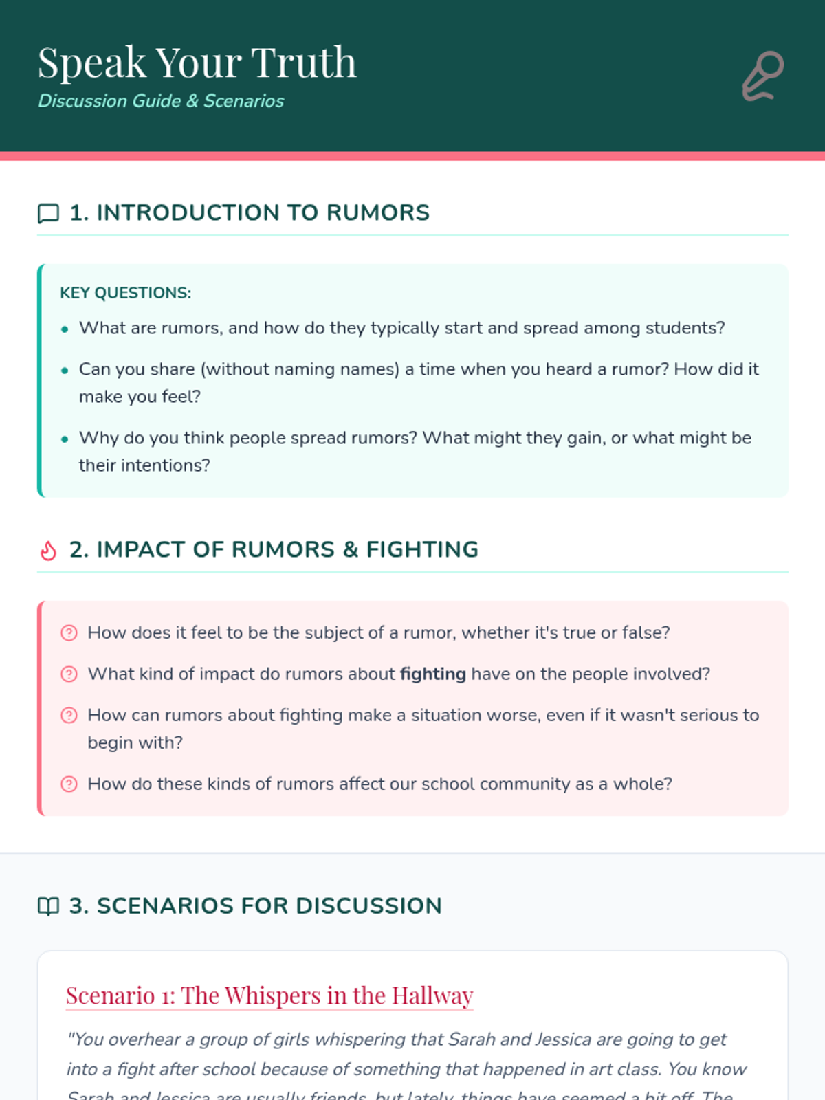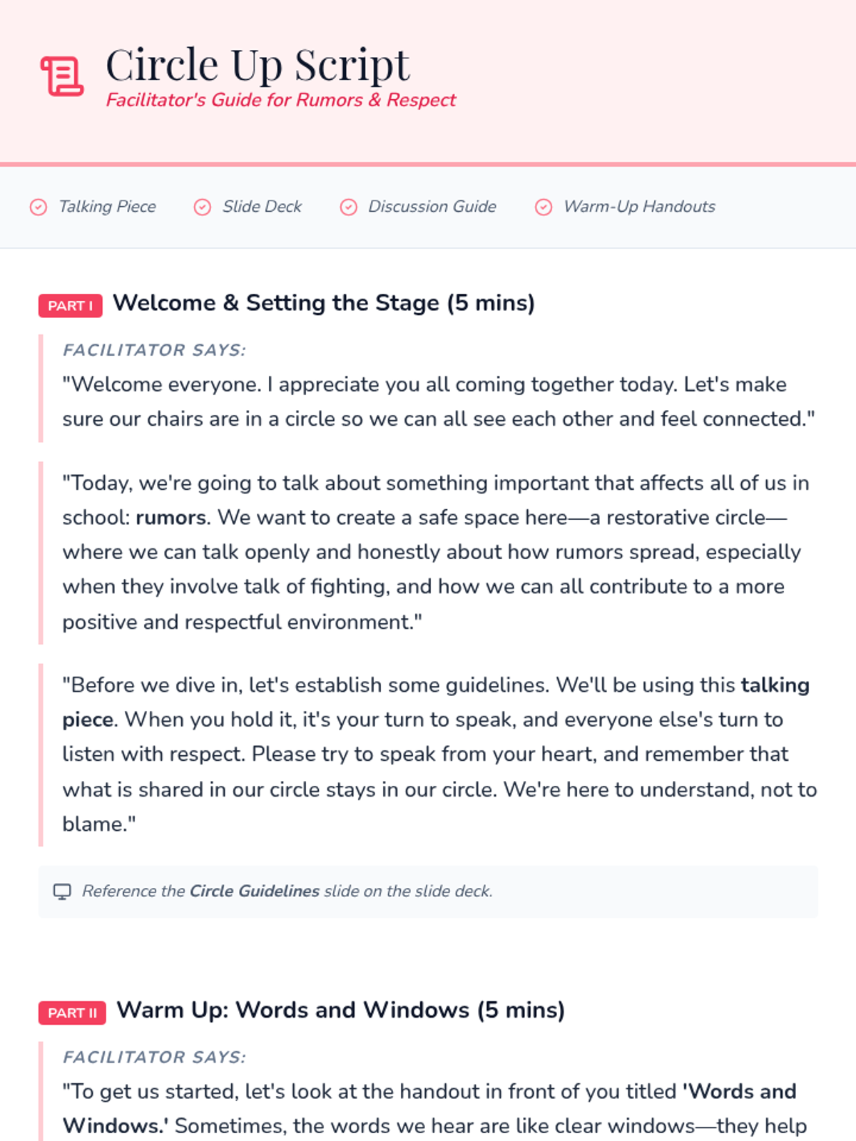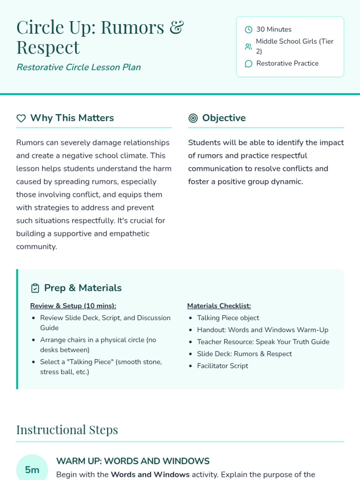 A 30-minute restorative circle for middle school girls focused on identifying the impact of rumors and practicing respectful communication to foster a positive school environment.