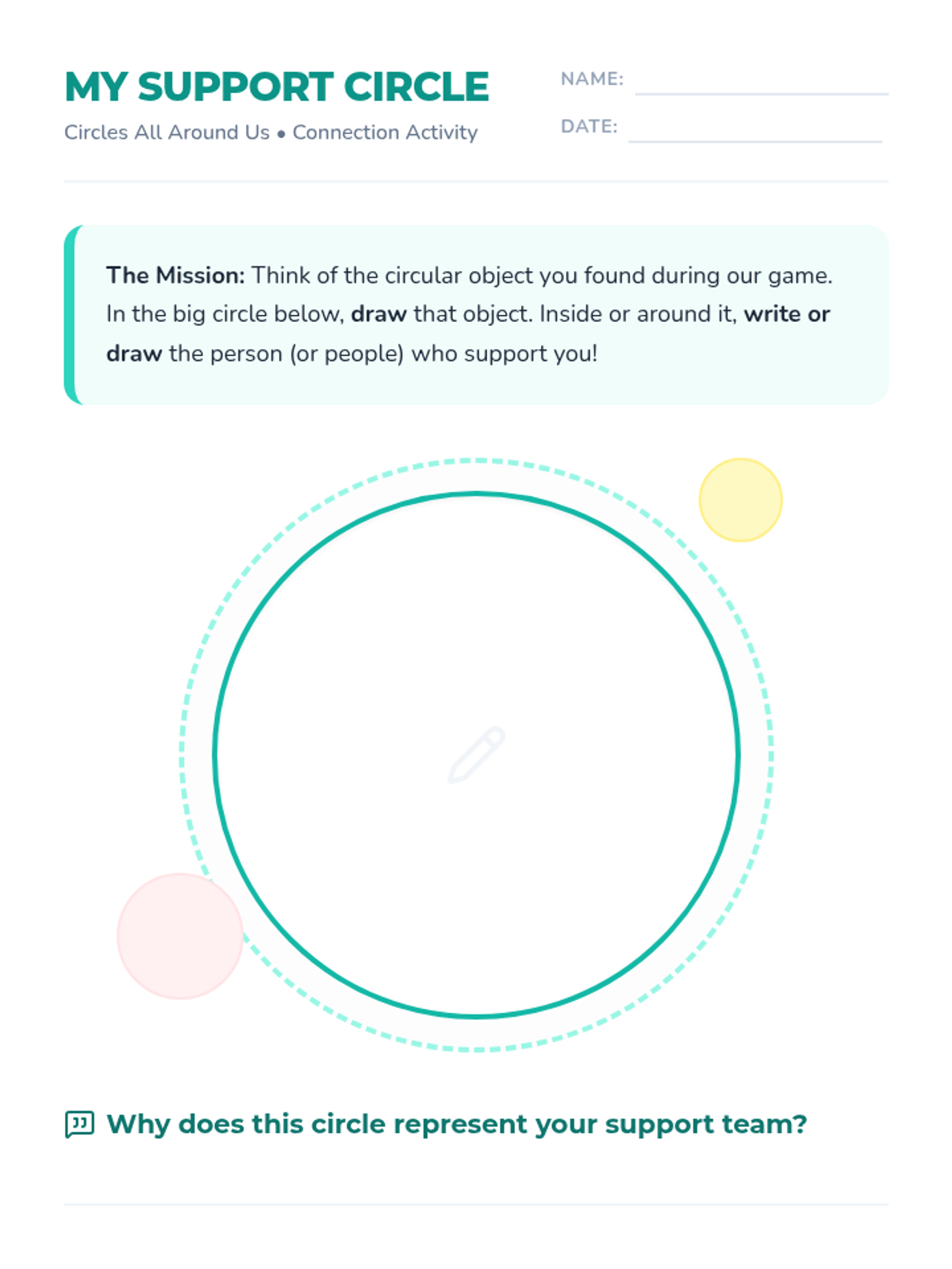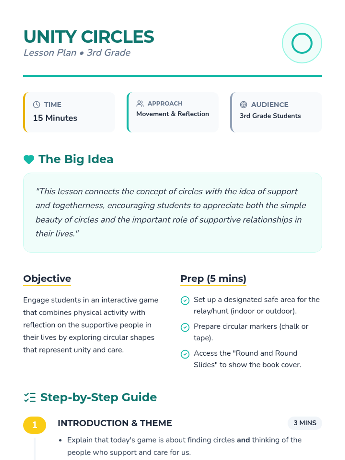 A 15-minute interactive lesson for 3rd graders that connects the geometric concept of circles with themes of unity, togetherness, and supportive relationships inspired by the book 'Circles All Around Us'. Students participate in a movement-based scavenger hunt to find circular shapes and link them to people who care for them.