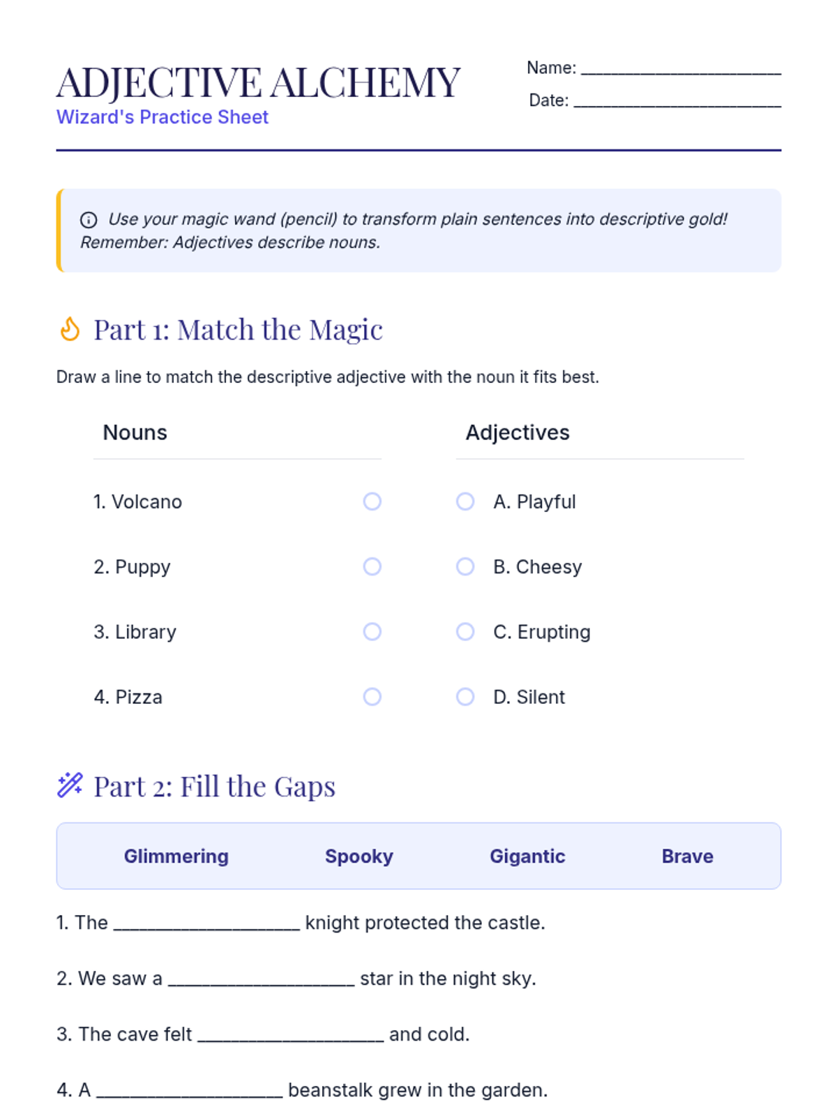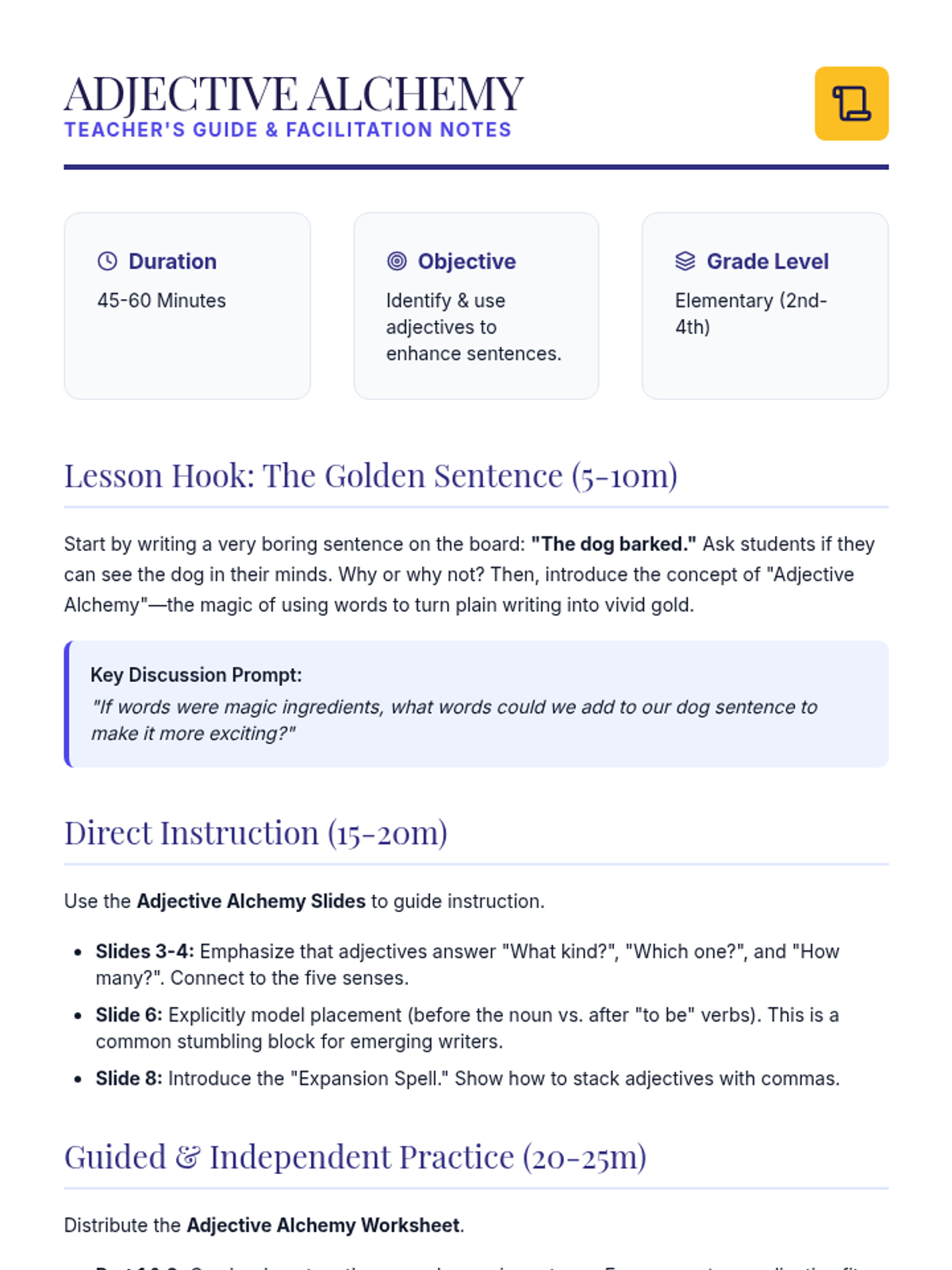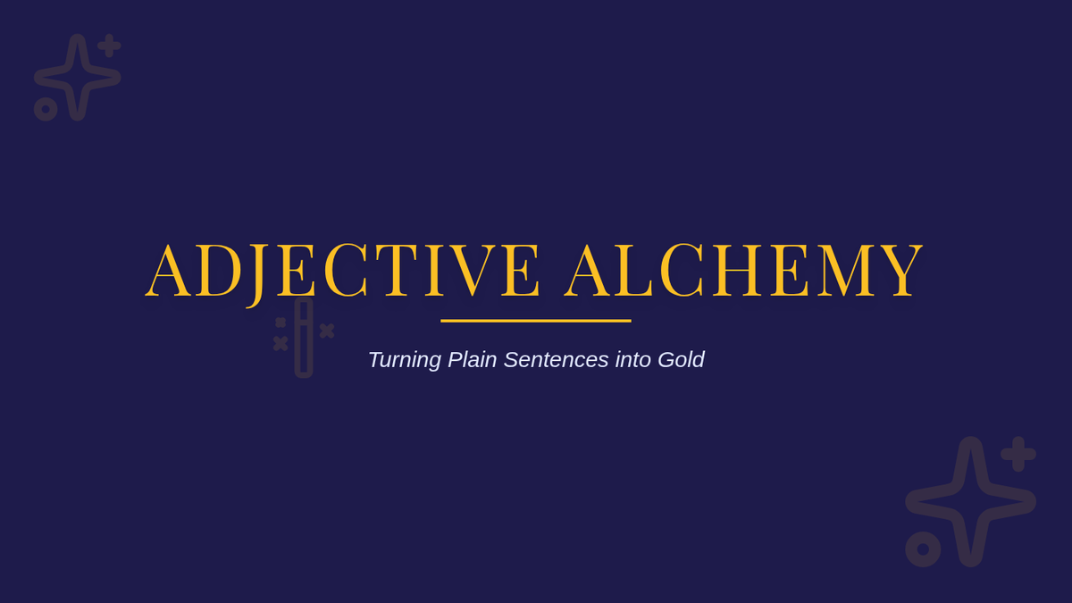 A magical lesson exploring how adjectives transform plain sentences into descriptive ones through 'Adjective Alchemy'. Students will identify, match, and apply adjectives to enhance their writing.
