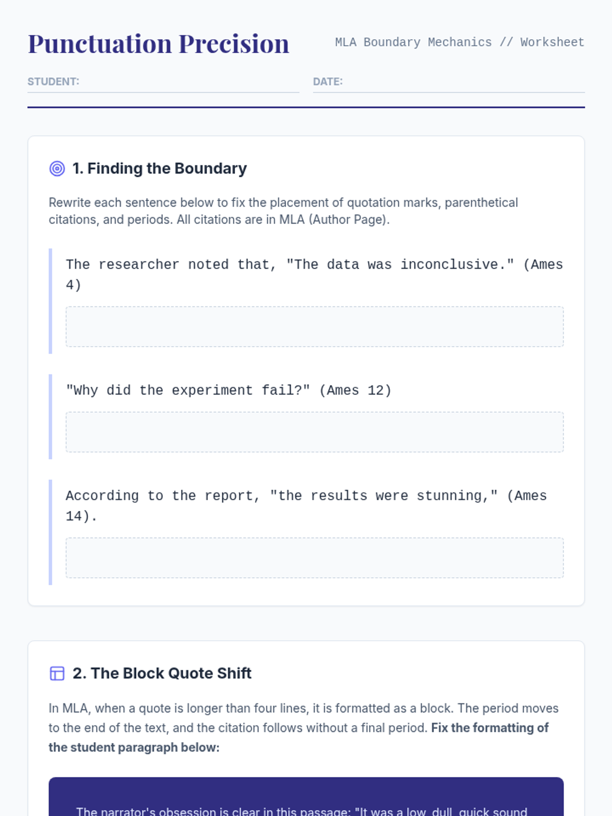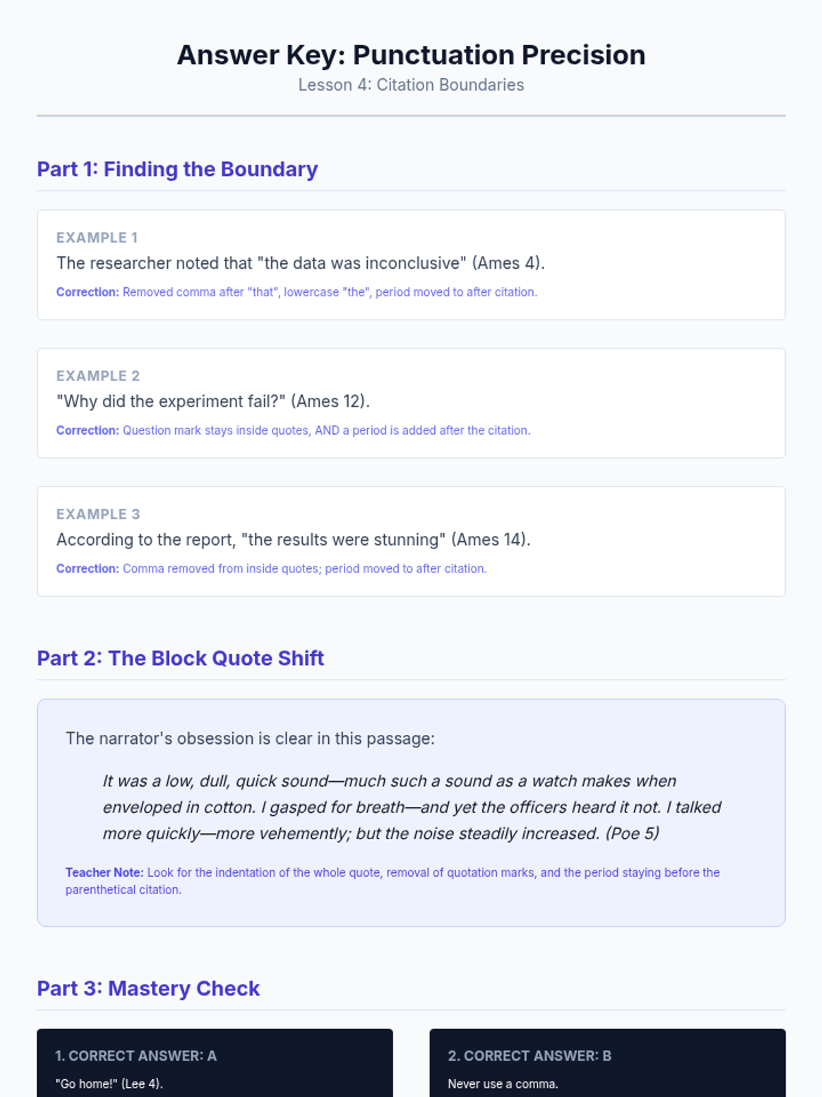 Addresses the specific punctuation rules of MLA/APA citations. Students learn where periods and question marks go in relation to parenthetical citations.