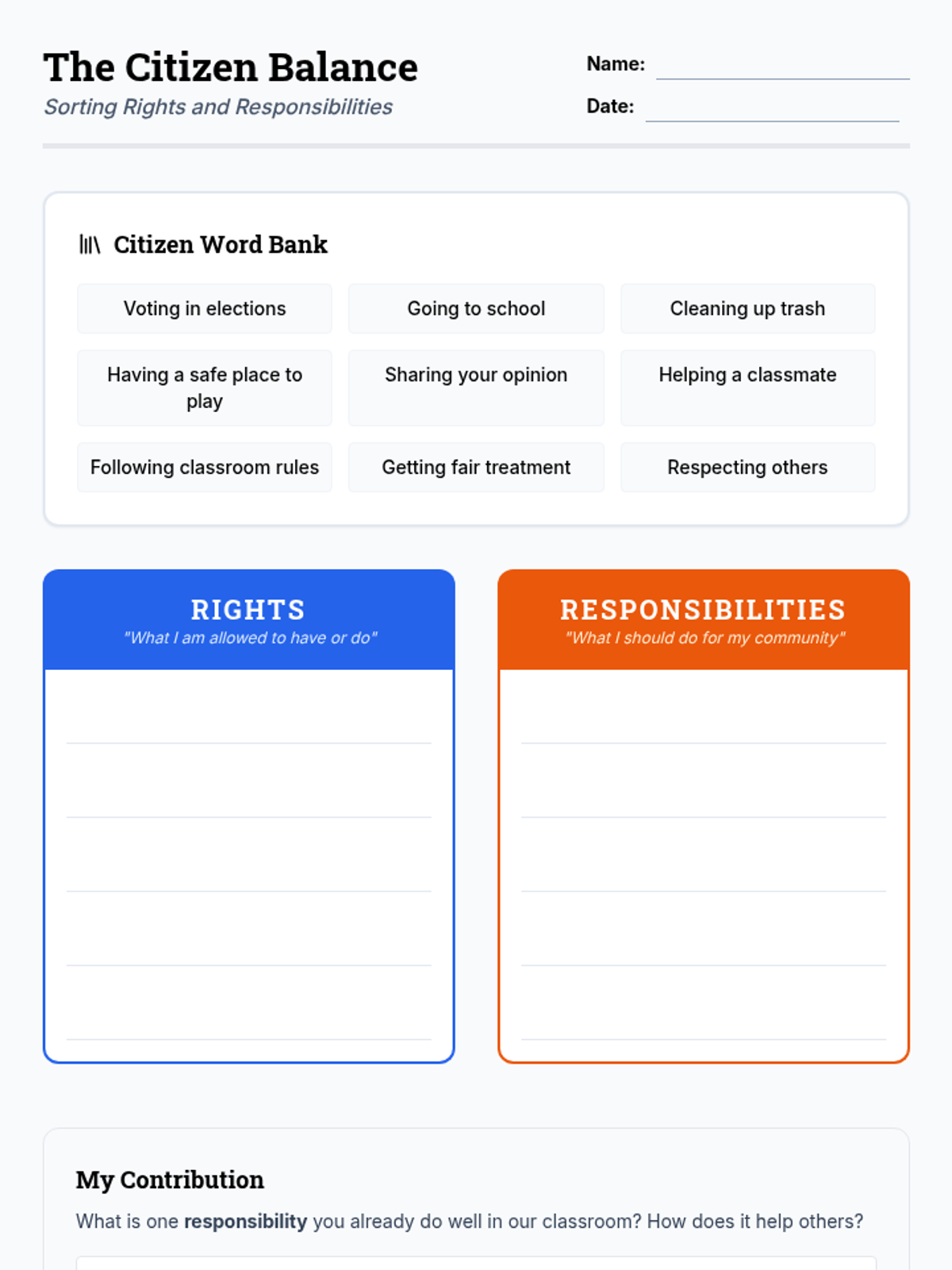 Students distinguish between the rights granted to citizens and the responsibilities citizens have to their community. They explore how active participation is essential for a healthy political system.