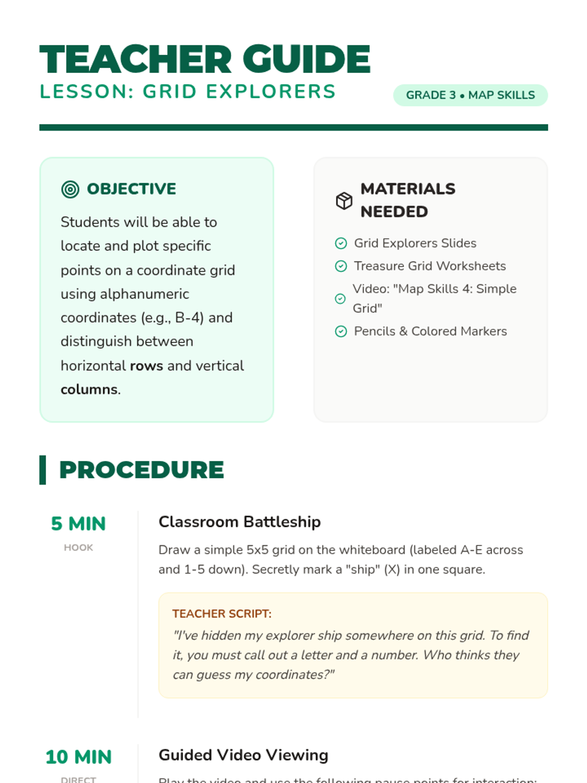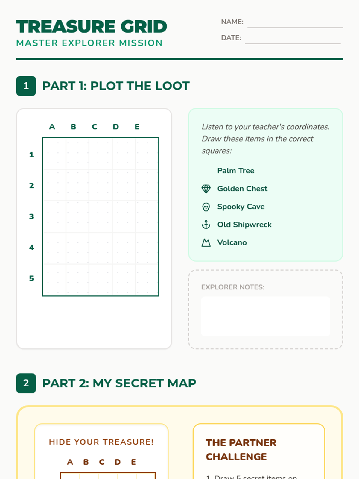 Students will learn to navigate and create maps using a coordinate grid system. Through a video-guided drawing activity, interactive safari practice, and a treasure map creation project, students will master the use of alphanumeric coordinates (e.g., A-3) and distinguish between rows and columns.