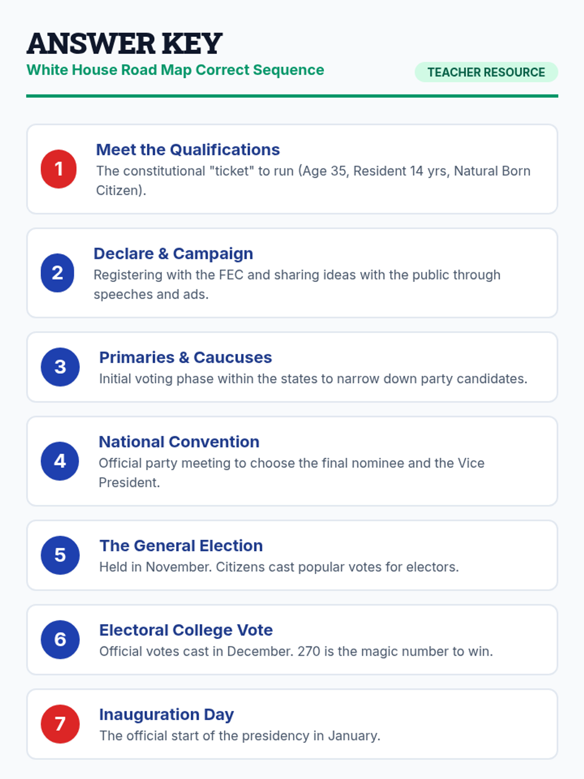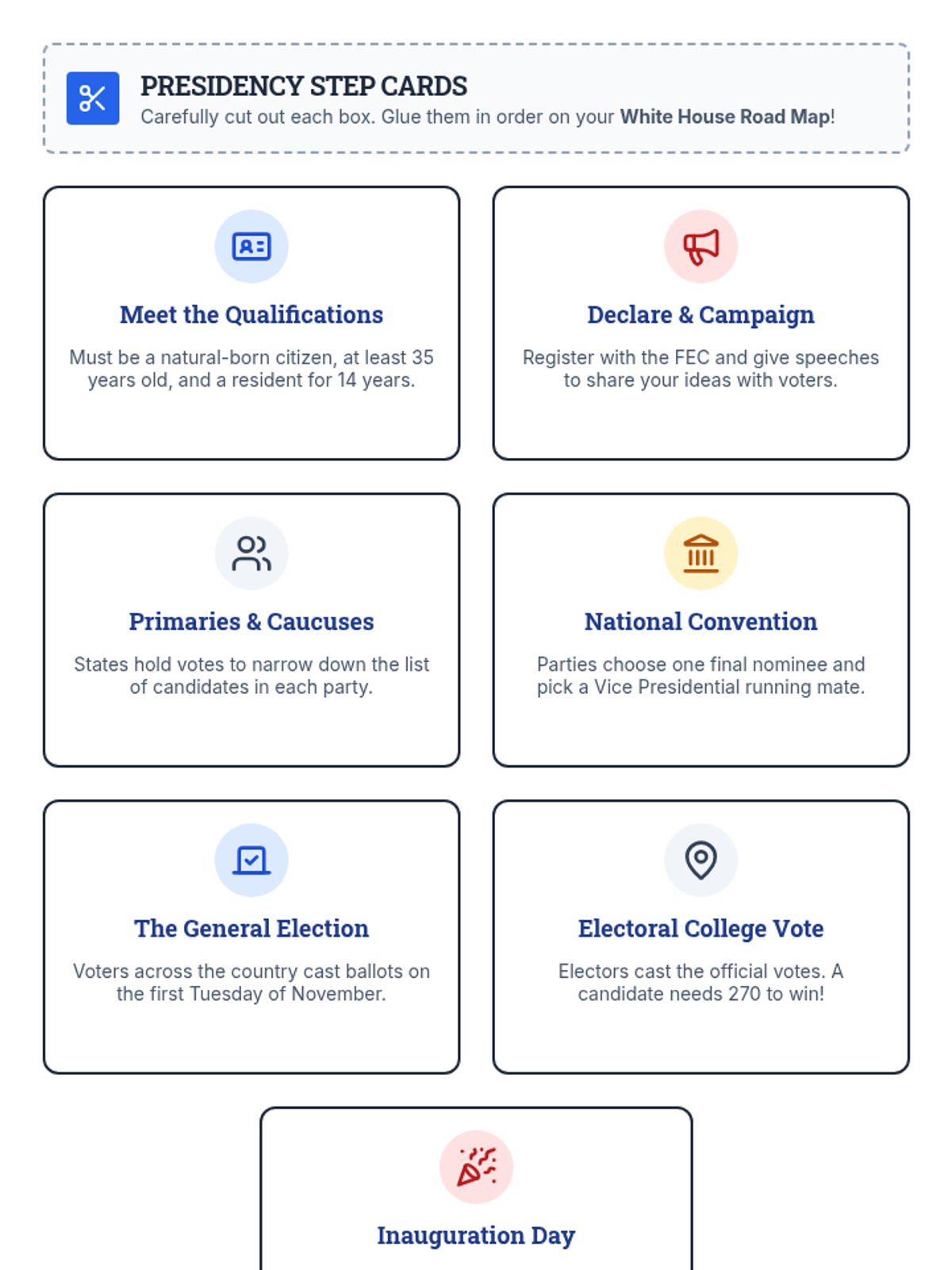Students will learn the complex process of becoming the President of the United States, from meeting constitutional requirements to the final Inauguration, through a sequencing activity and video analysis.