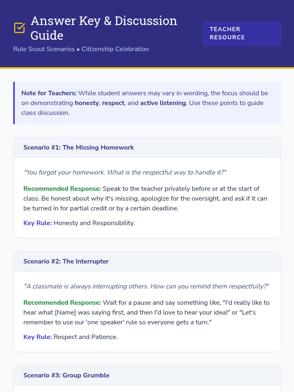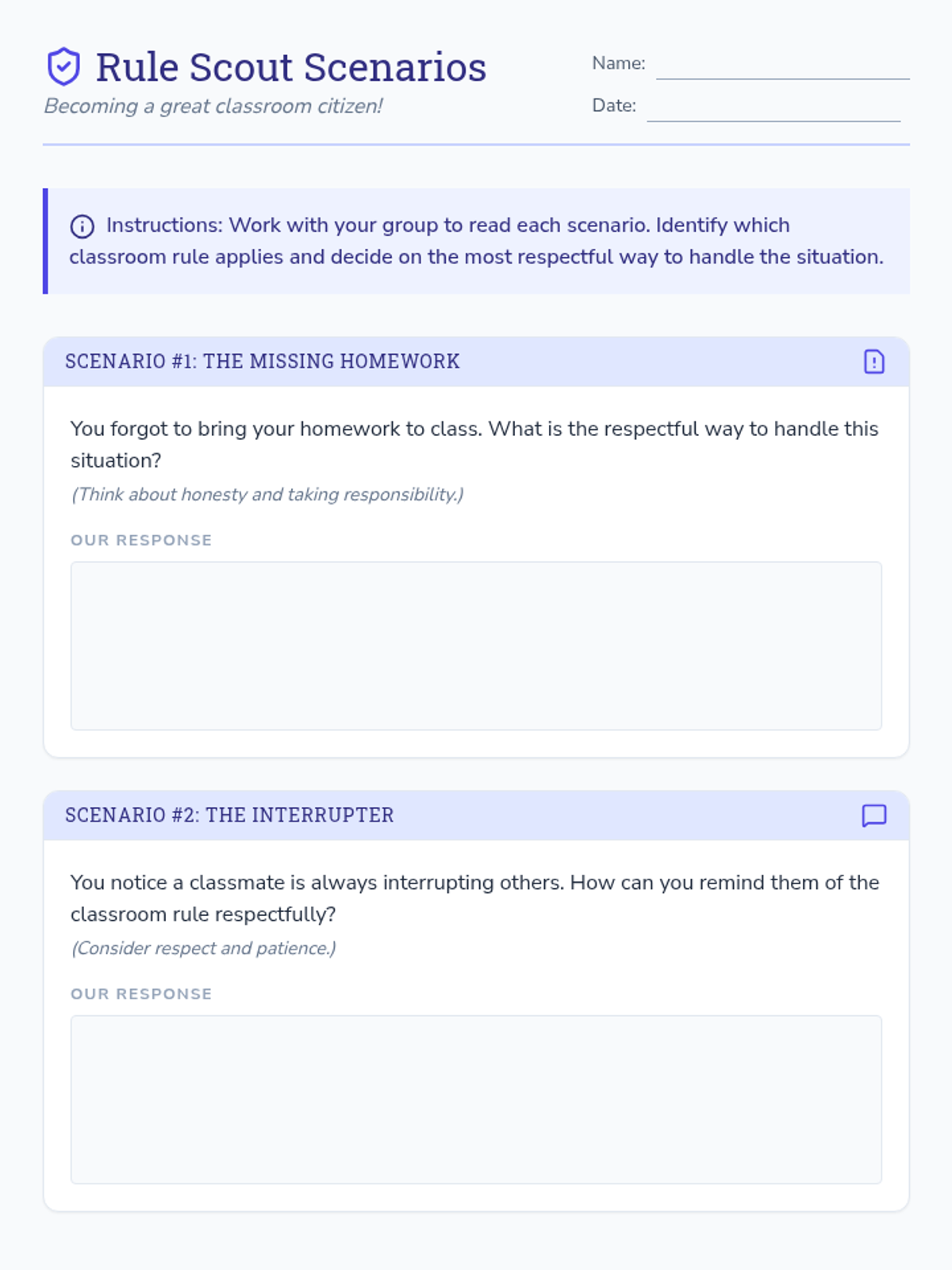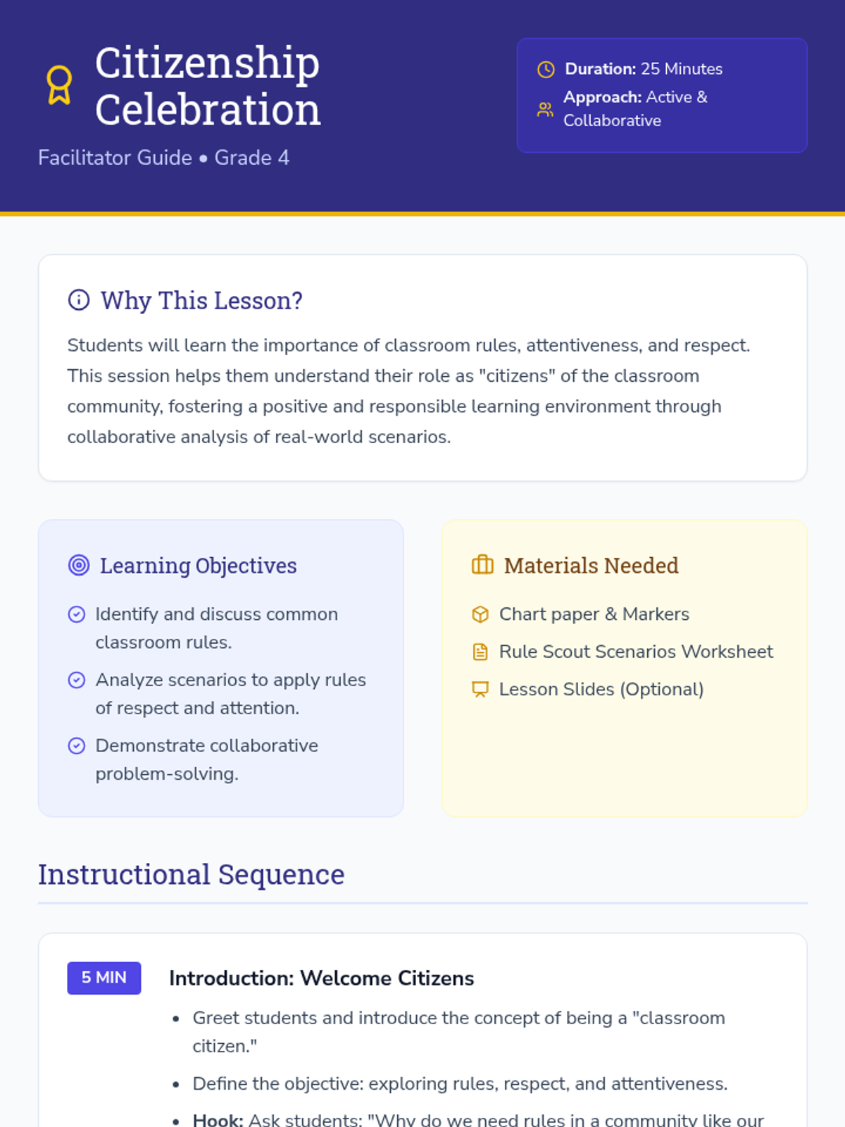 A 4th-grade lesson focused on classroom citizenship, exploring the importance of rules, respect, and attentiveness through collaborative discussion and scenario analysis.