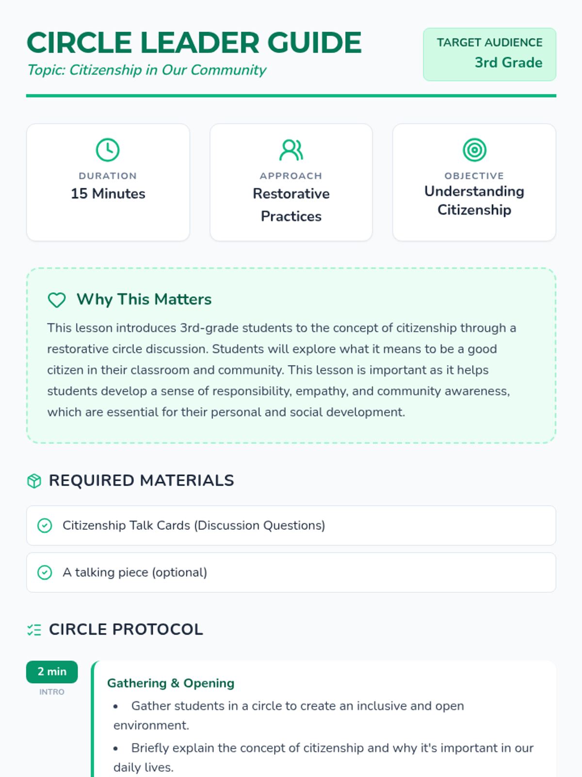 A restorative circle lesson for 3rd graders to explore citizenship, responsibility, and empathy within their classroom and community.