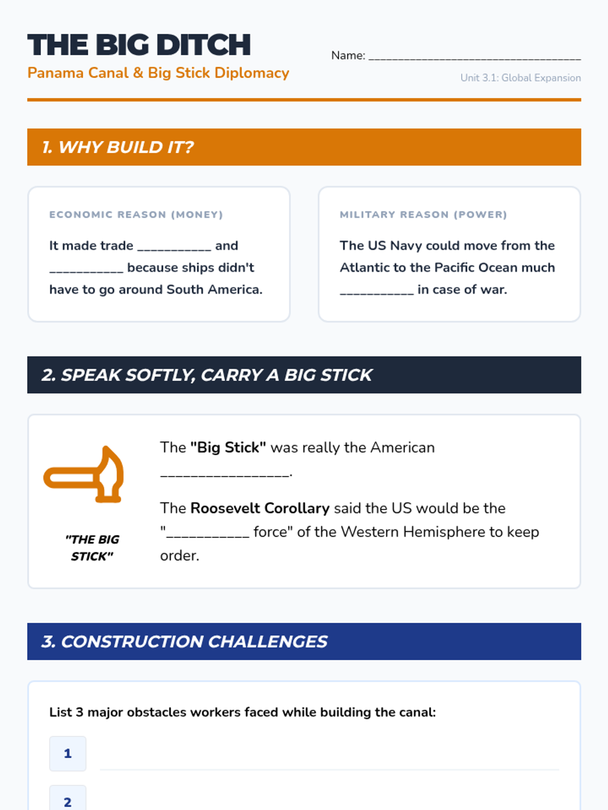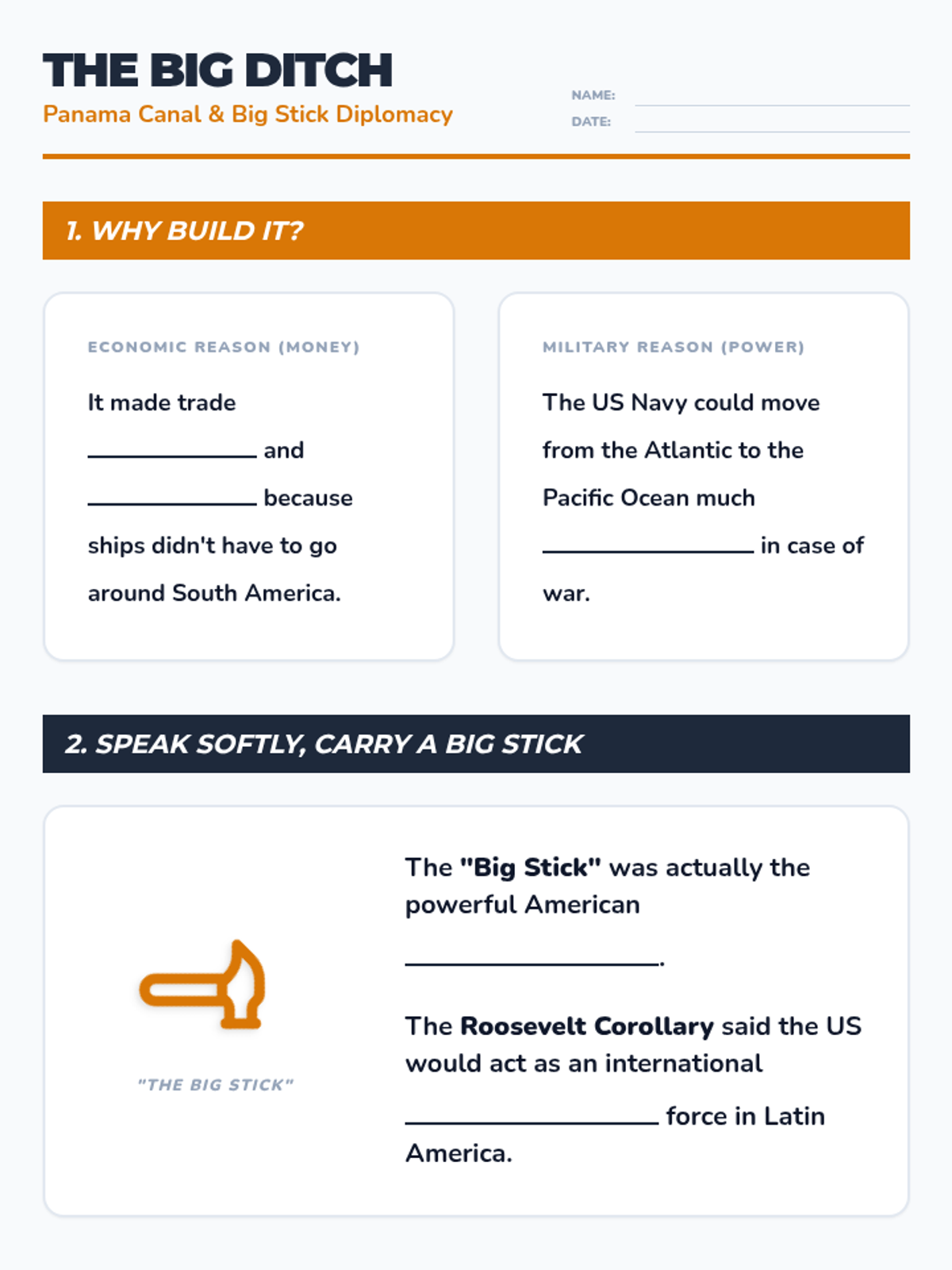 Covers the construction of the Panama Canal and Theodore Roosevelt's Big Stick diplomacy.