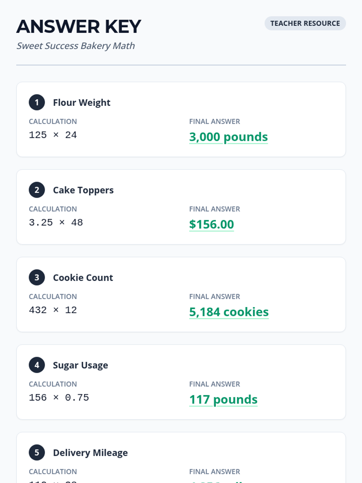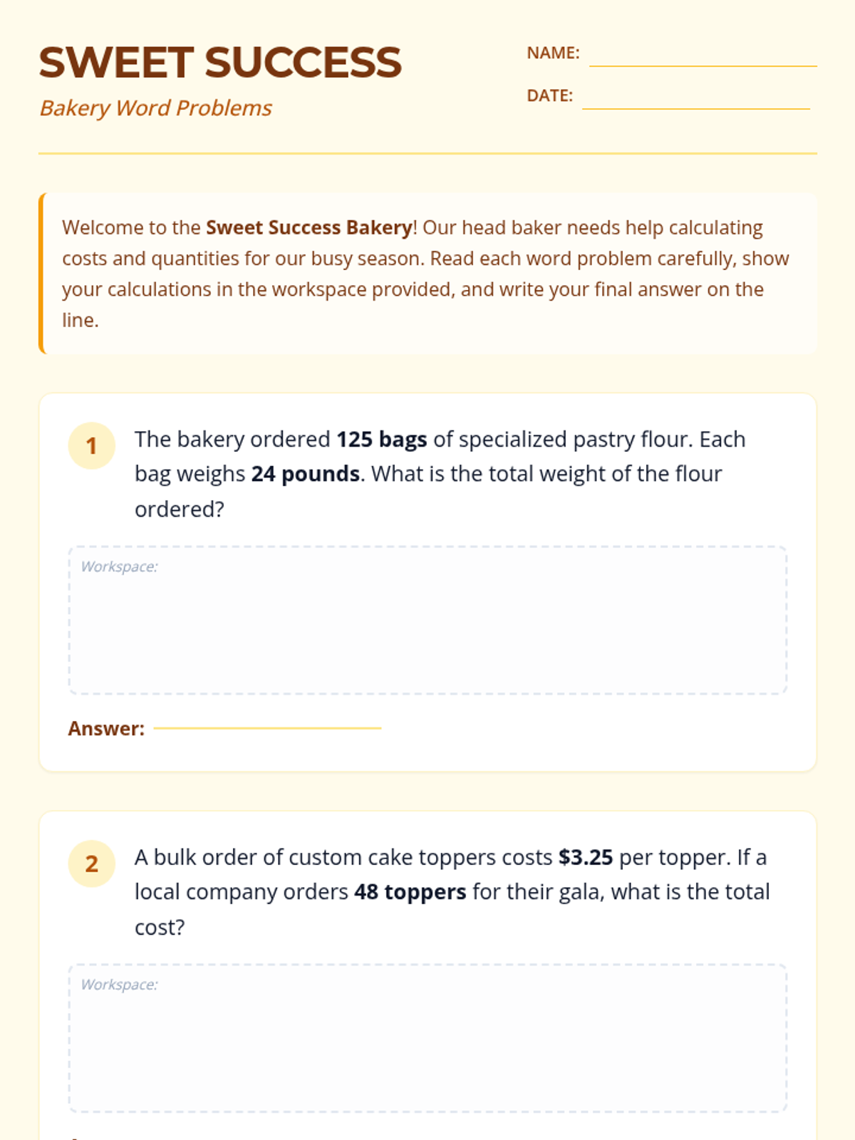 A lesson focused on solving single-step word problems using multi-digit multiplication, featuring real-world bakery scenarios with and without decimals.