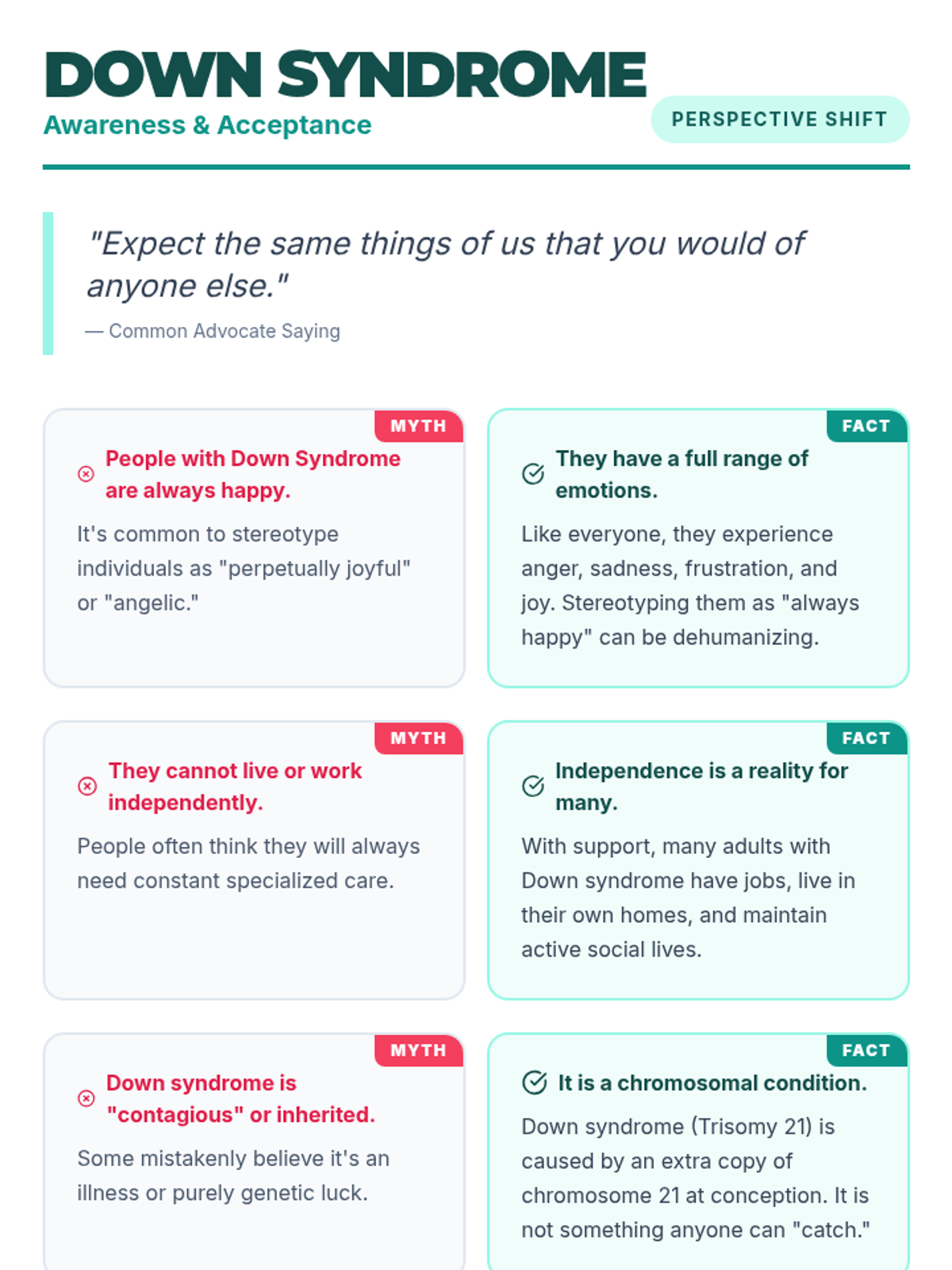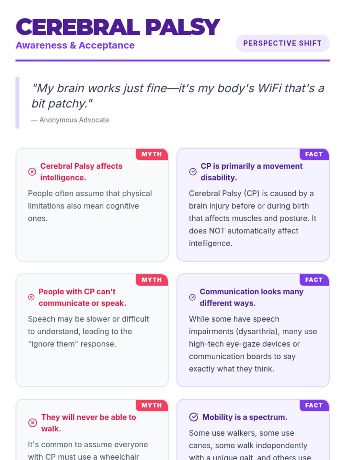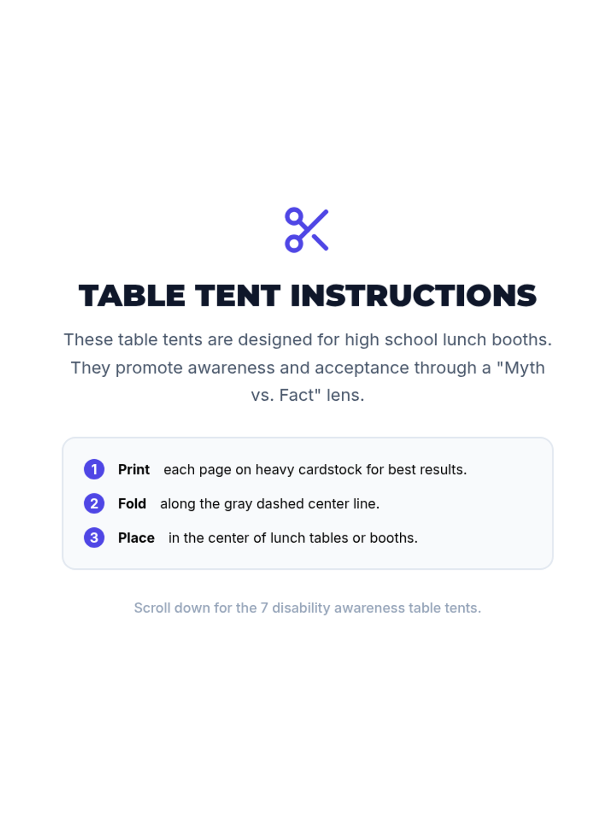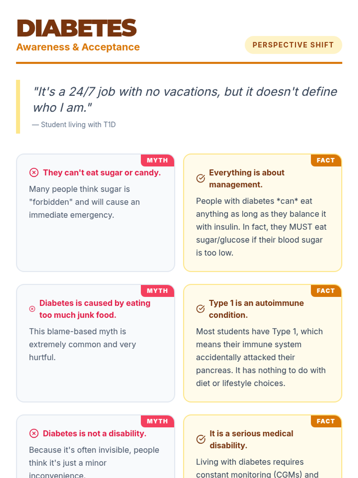 A series of high-impact infographic handouts designed for high school lunch table booths to promote disability awareness and acceptance through myth-busting.