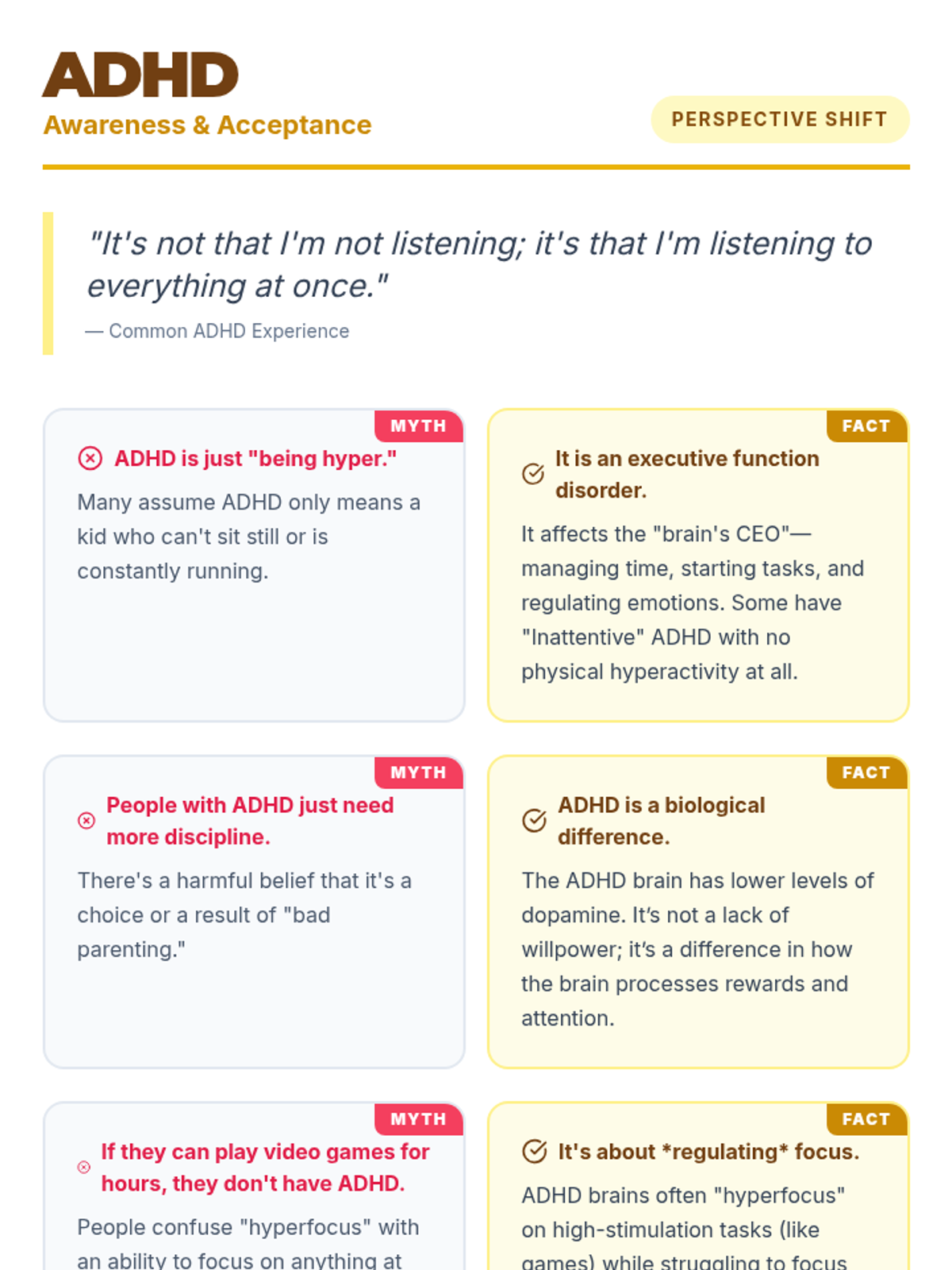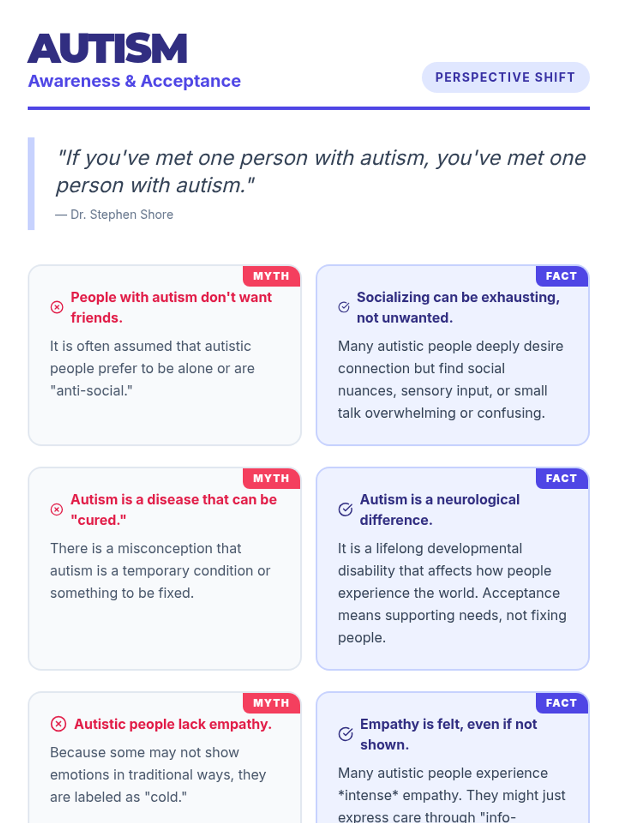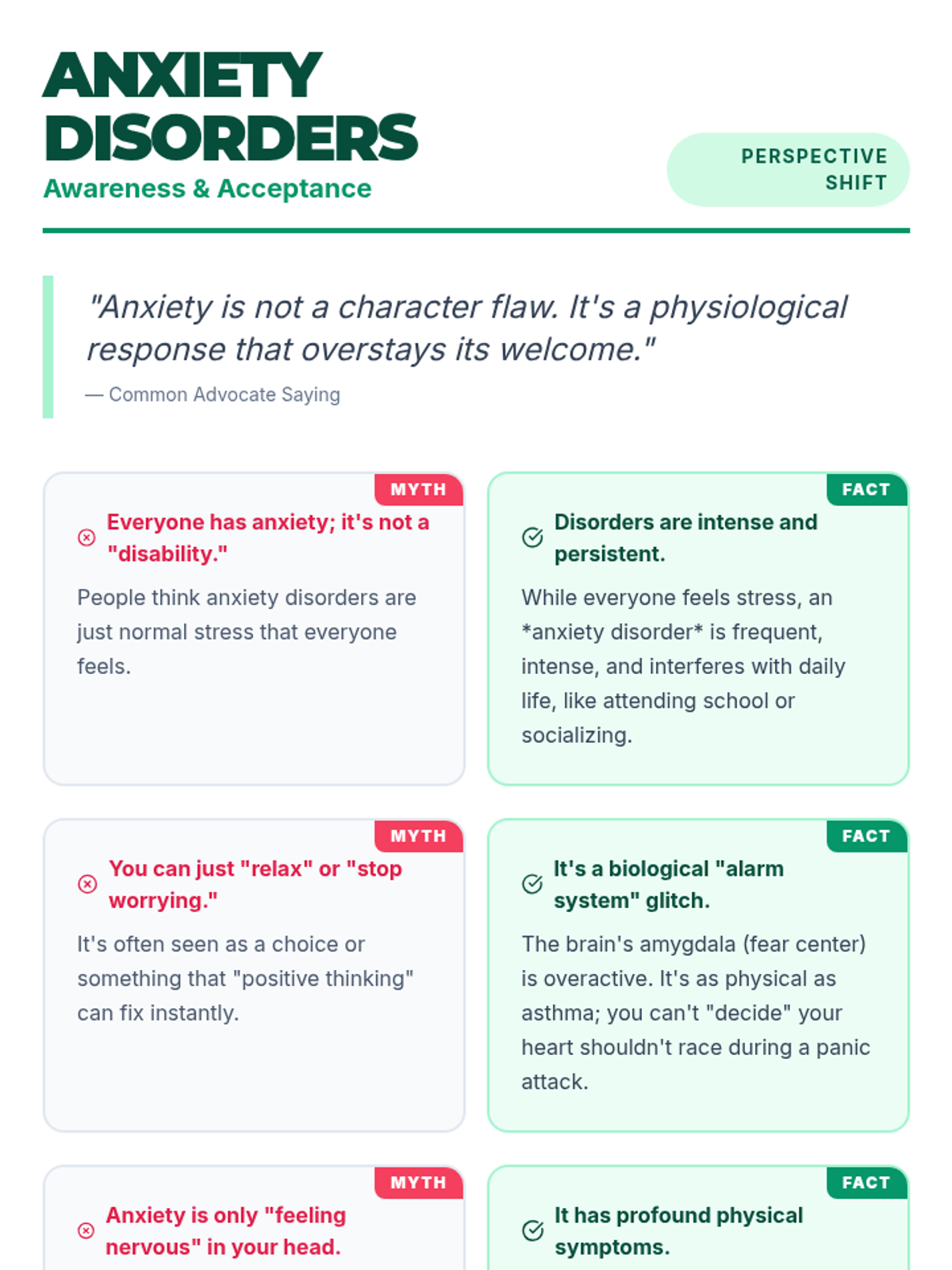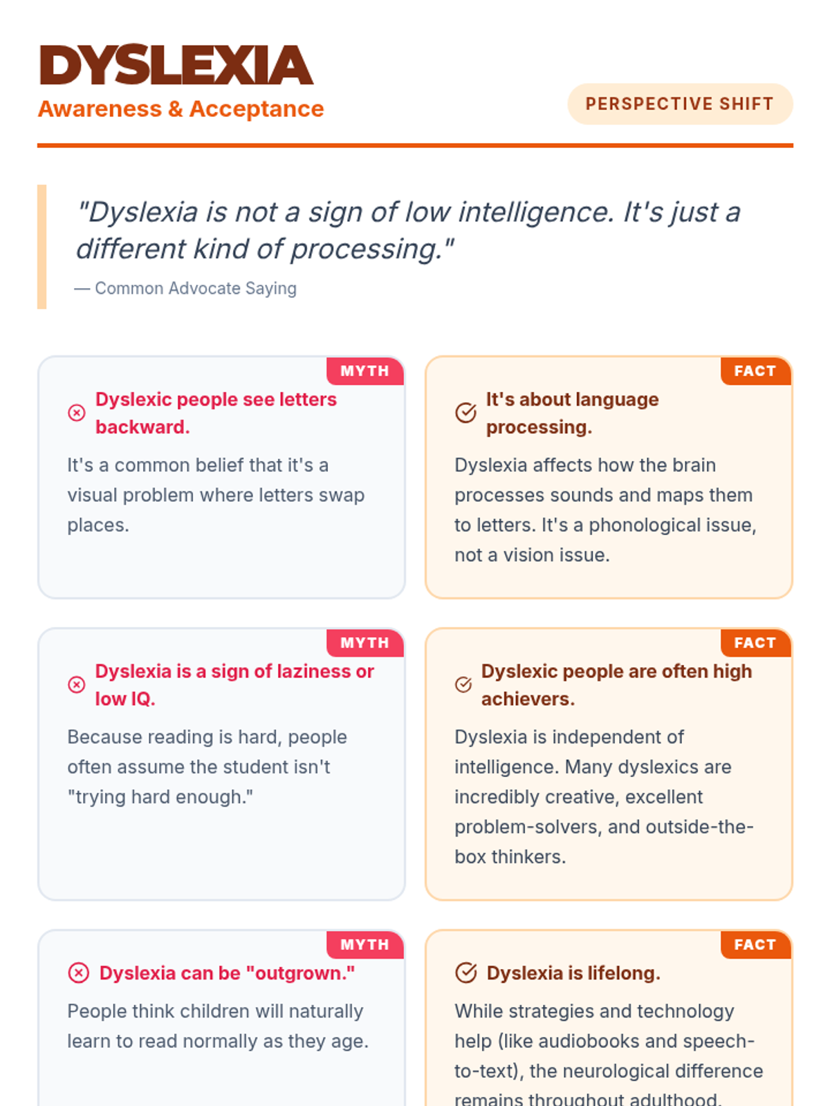 A series of high-impact infographic handouts designed for high school lunch table booths to promote disability awareness and acceptance through myth-busting.