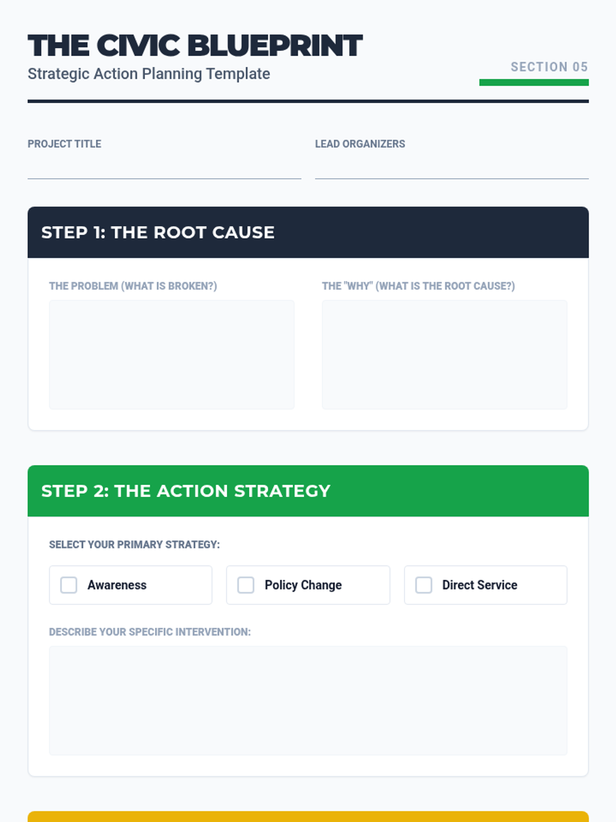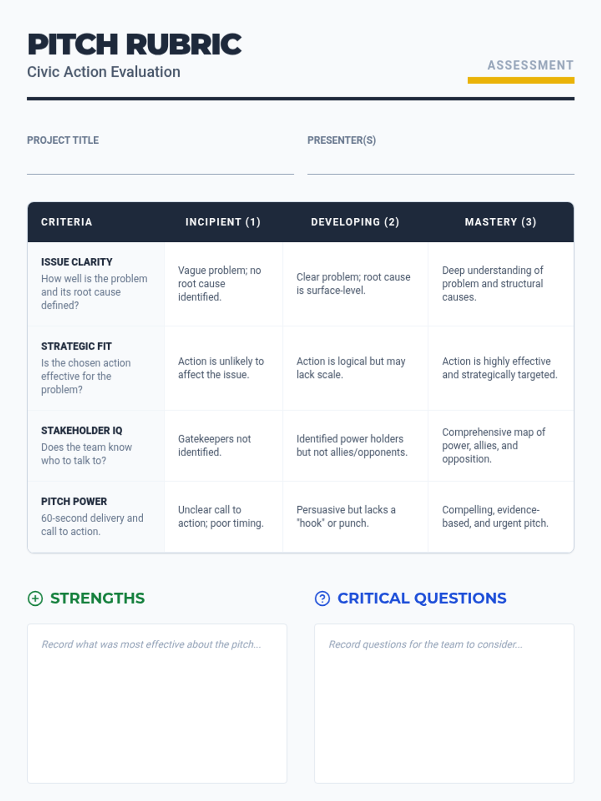 In this culminating workshop, students apply their knowledge by identifying a local issue and designing a strategic civic action plan to address it.